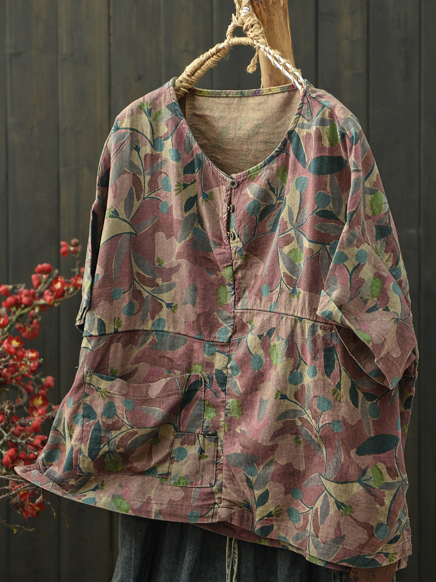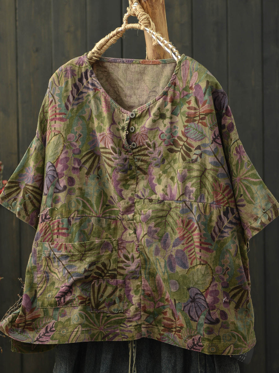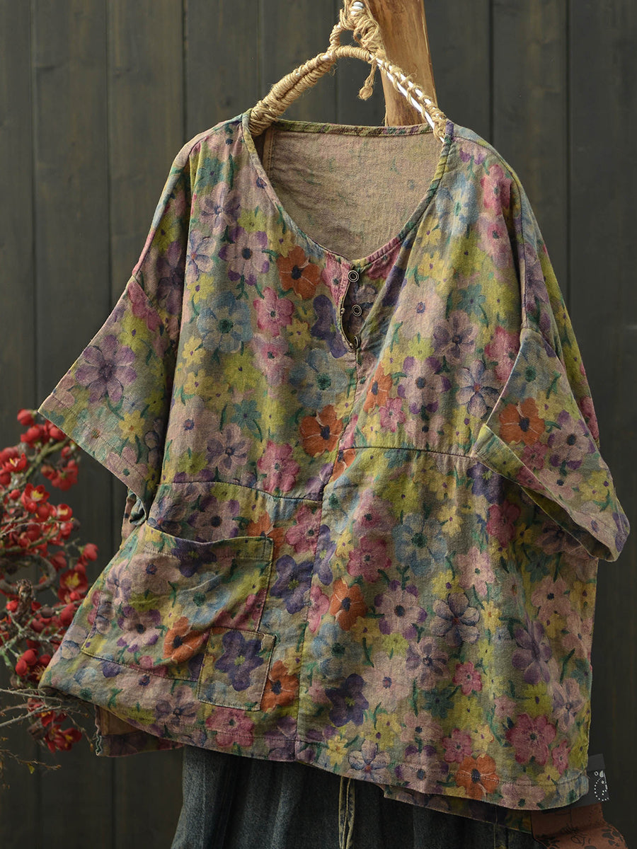 Dámská letní umělecká květinová bavlněná halenka s výstřihem do O-neck