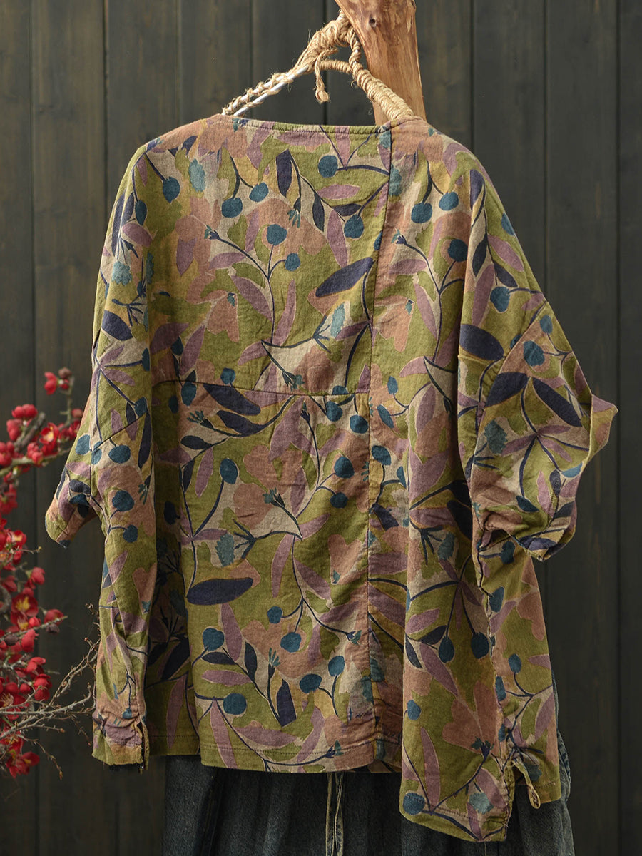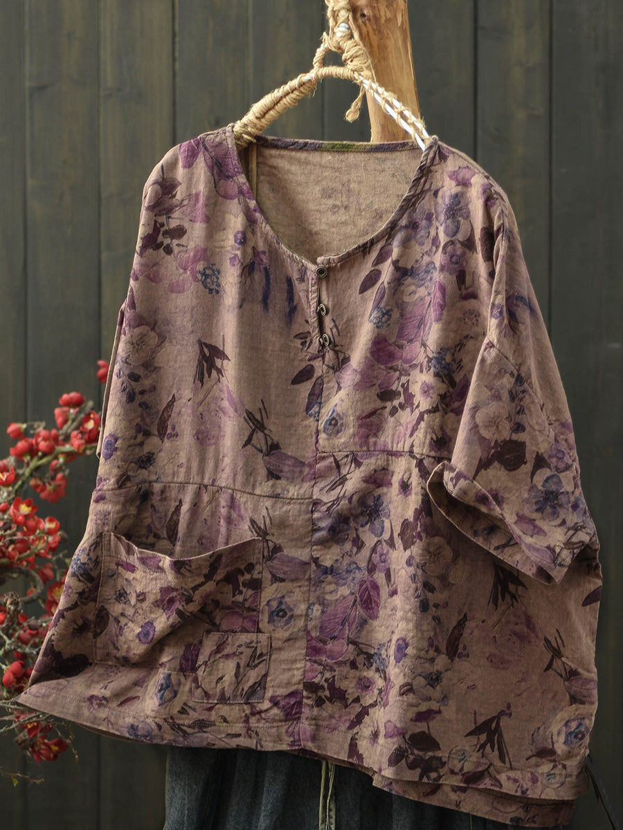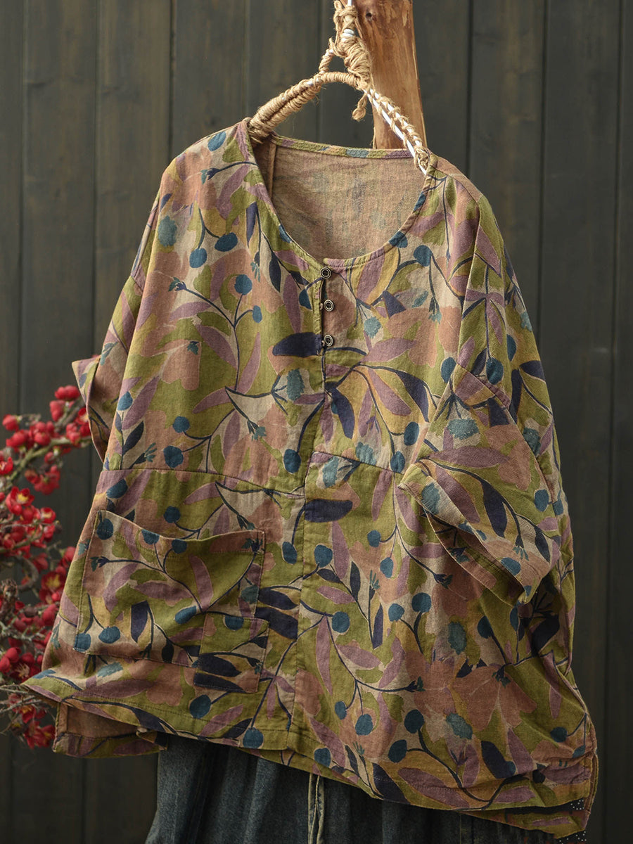 Dámská letní umělecká květinová bavlněná halenka s výstřihem do O-neck