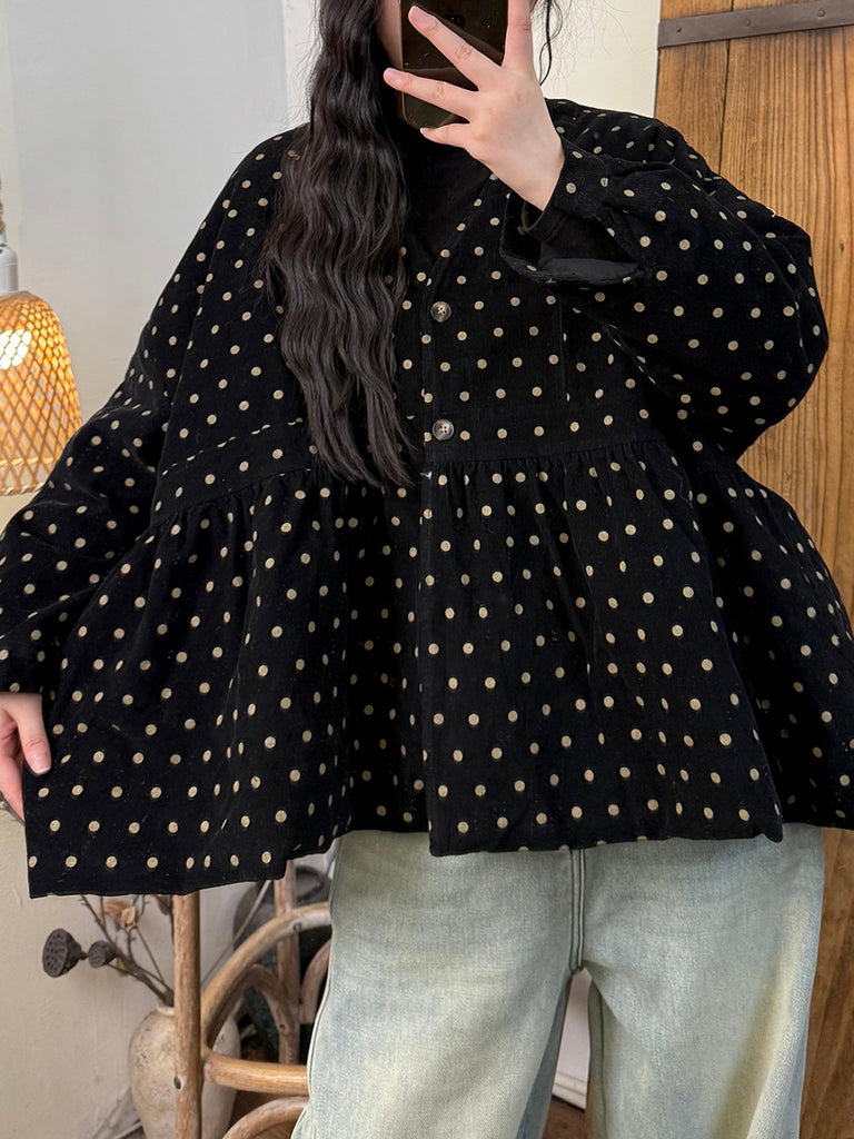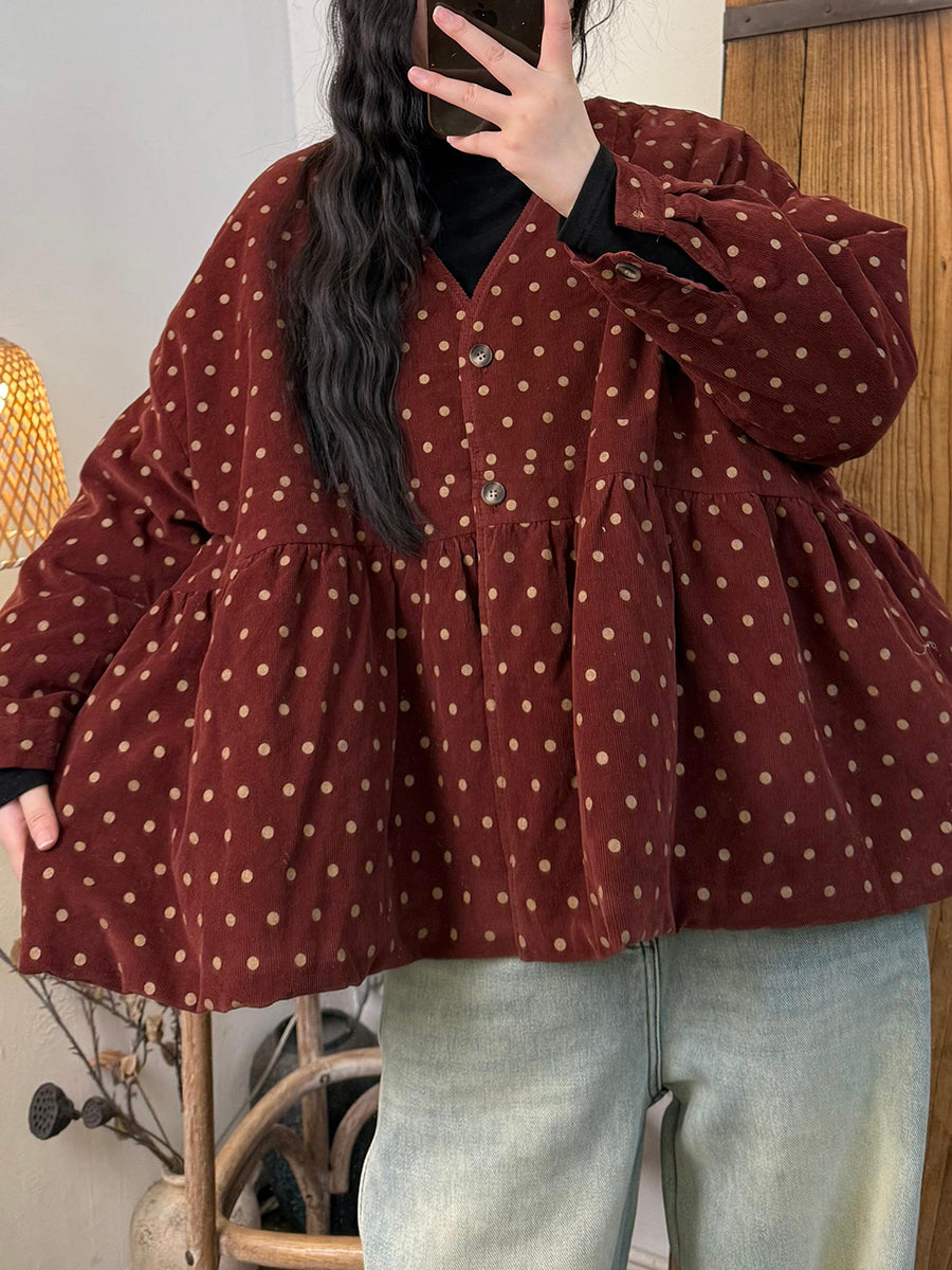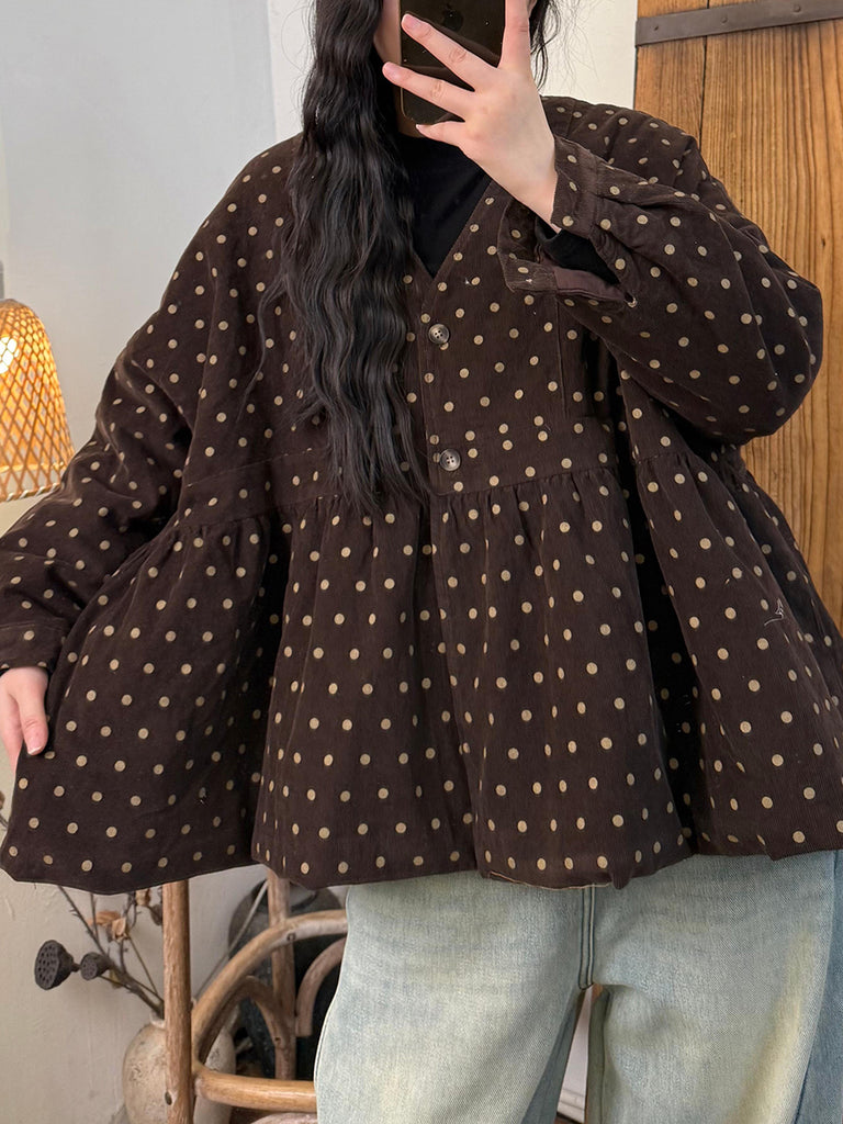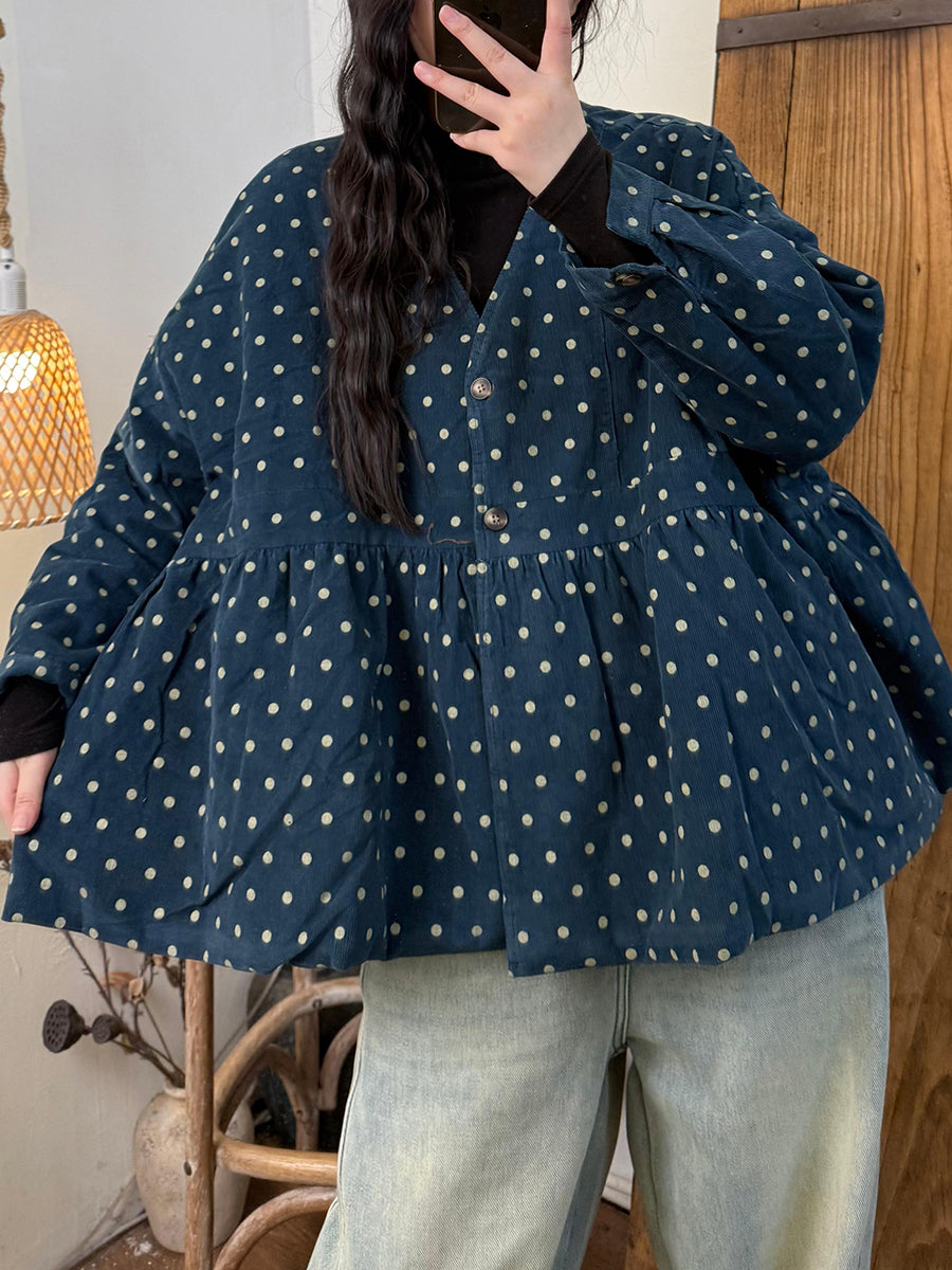Dámský vintage podzimní puntíkovaný bavlněný prošívaný kabát s výstřihem do V