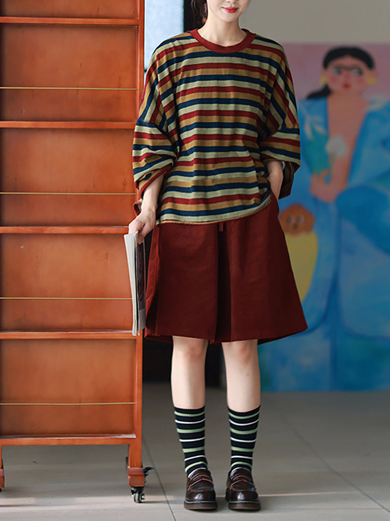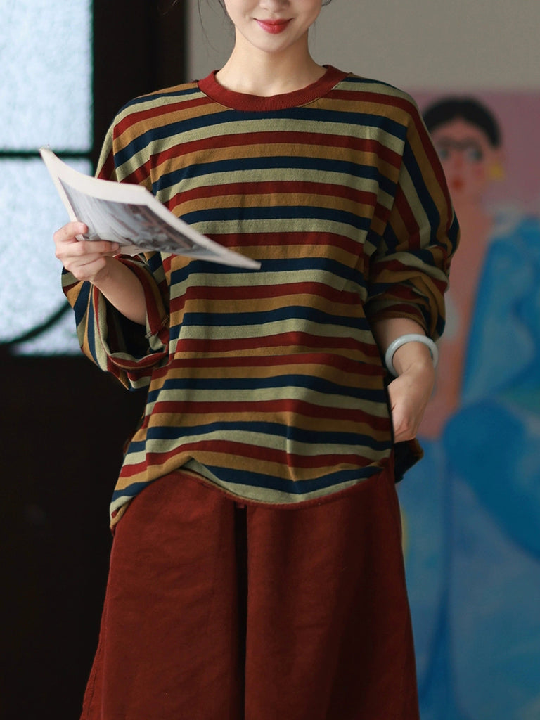 Dámská podzimní ležérní pruhovaná halenka s výstřihem do O-neck ze 100% bavlny