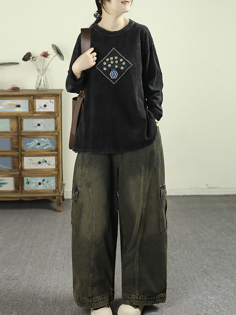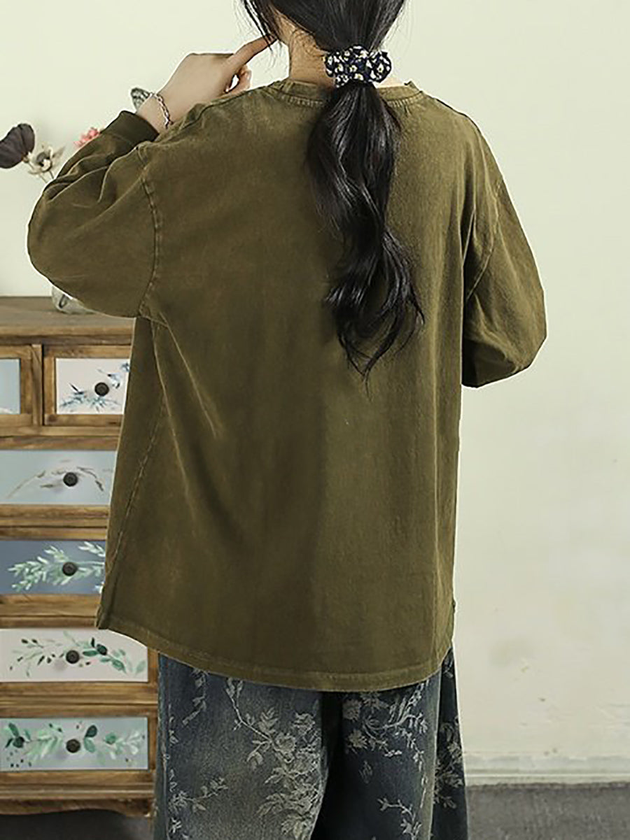 Dámská umělecká jarní květinová nášivka z bavlny s výstřihem do O-neck