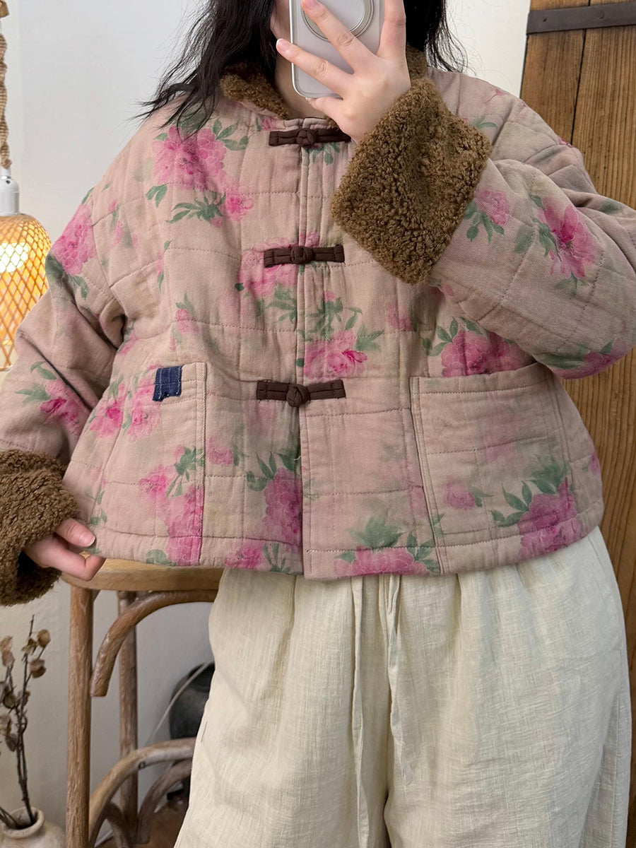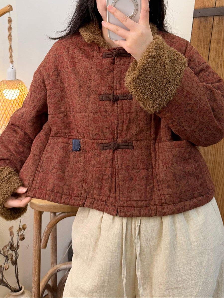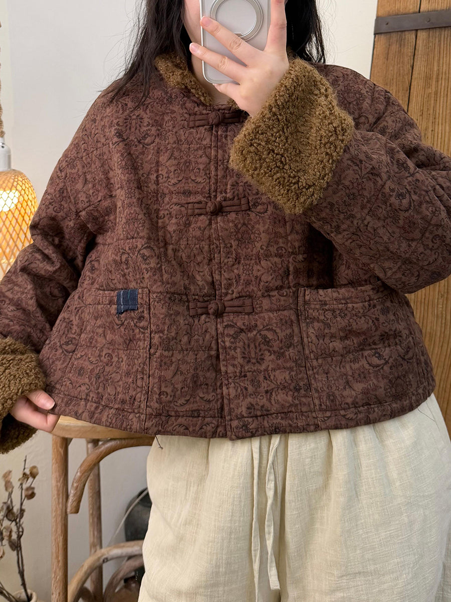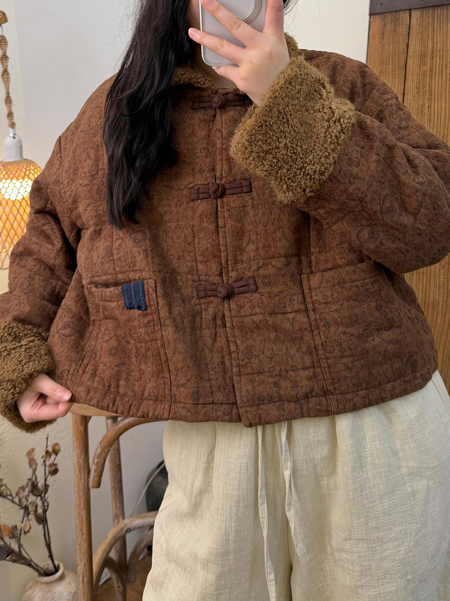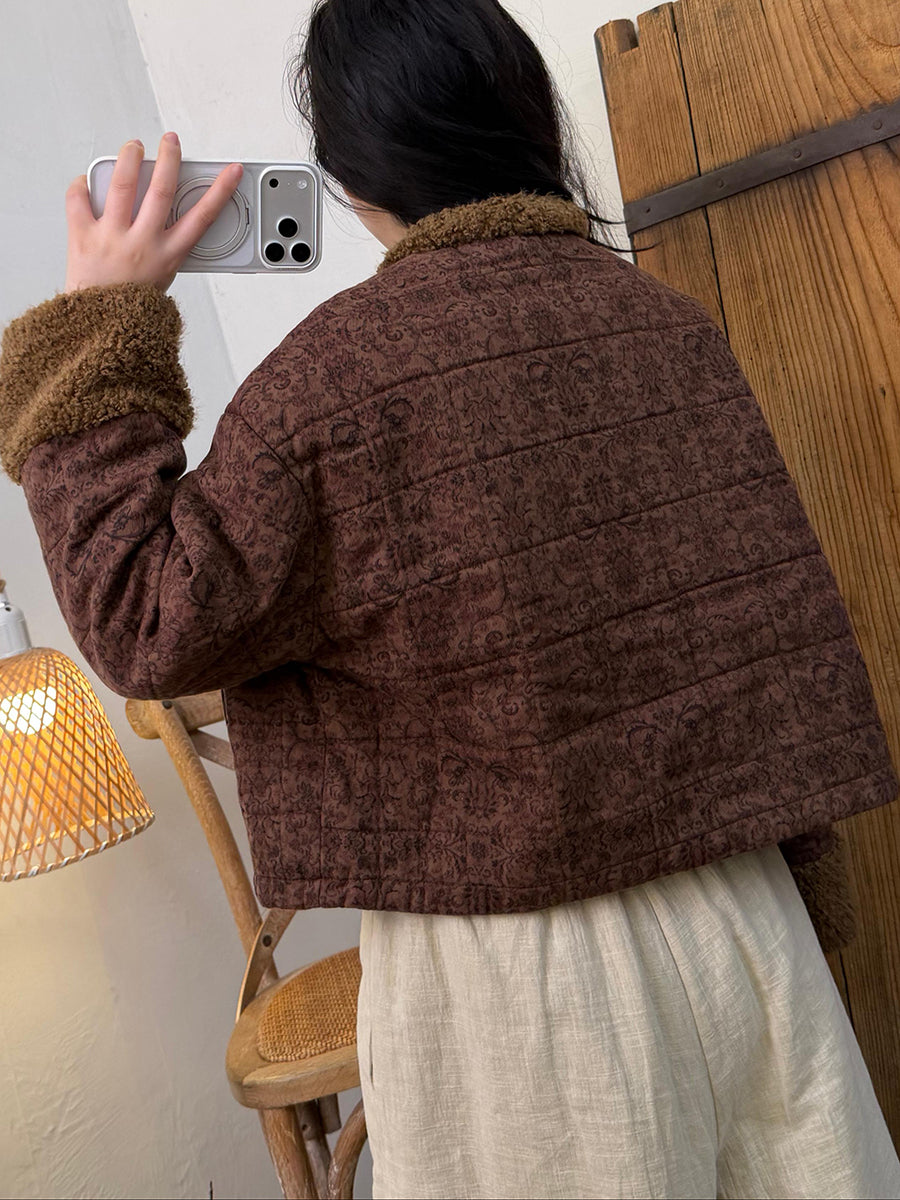 Dámský zimní retro fleecový prošívaný kabát s výstřihem do O