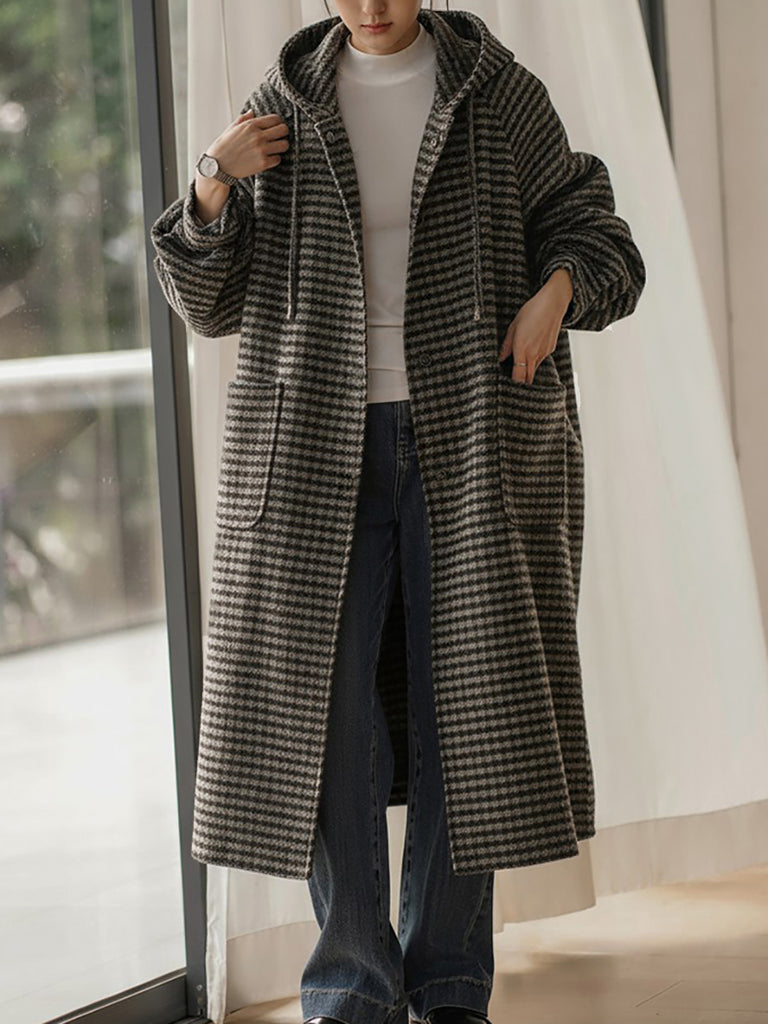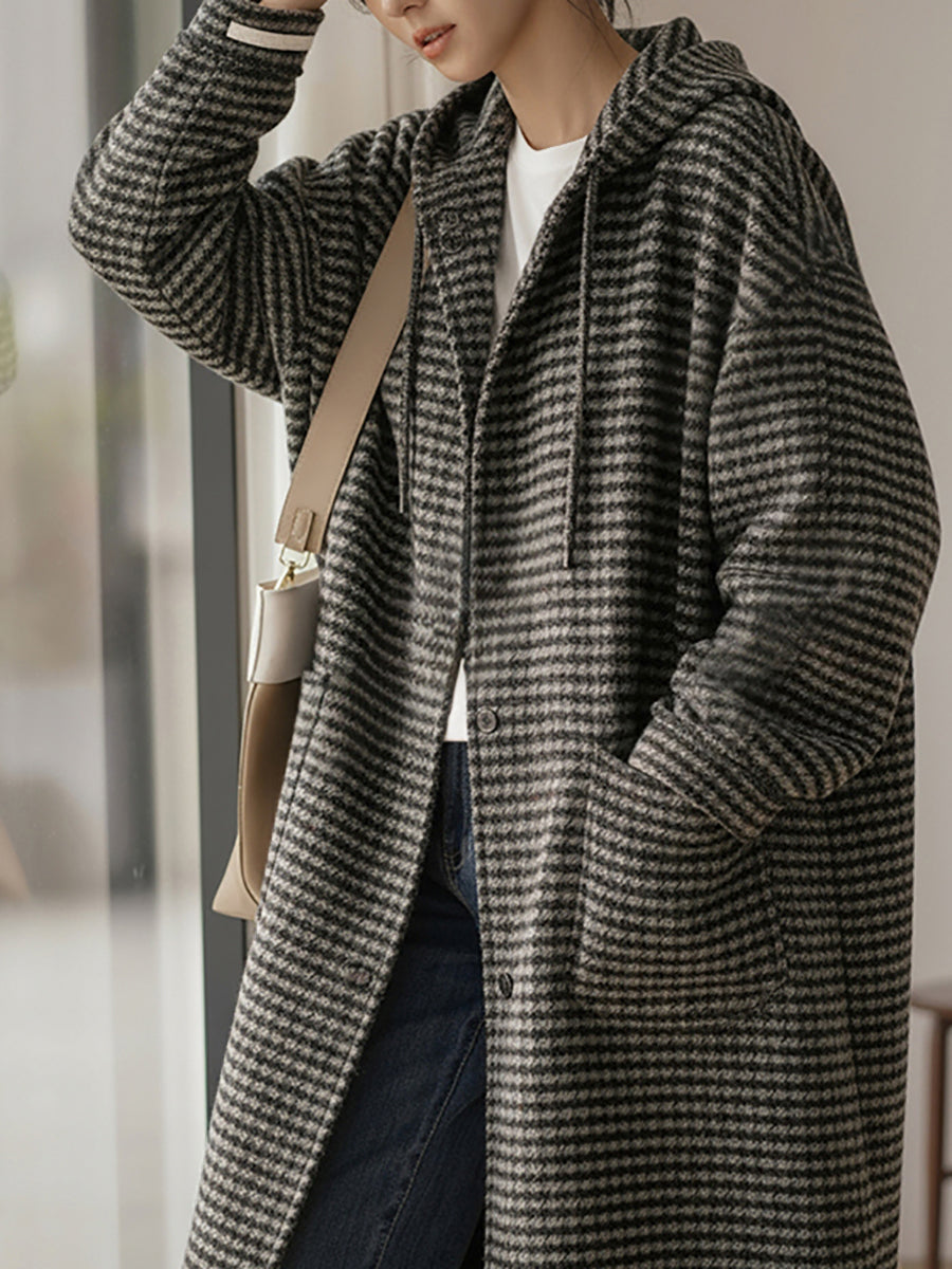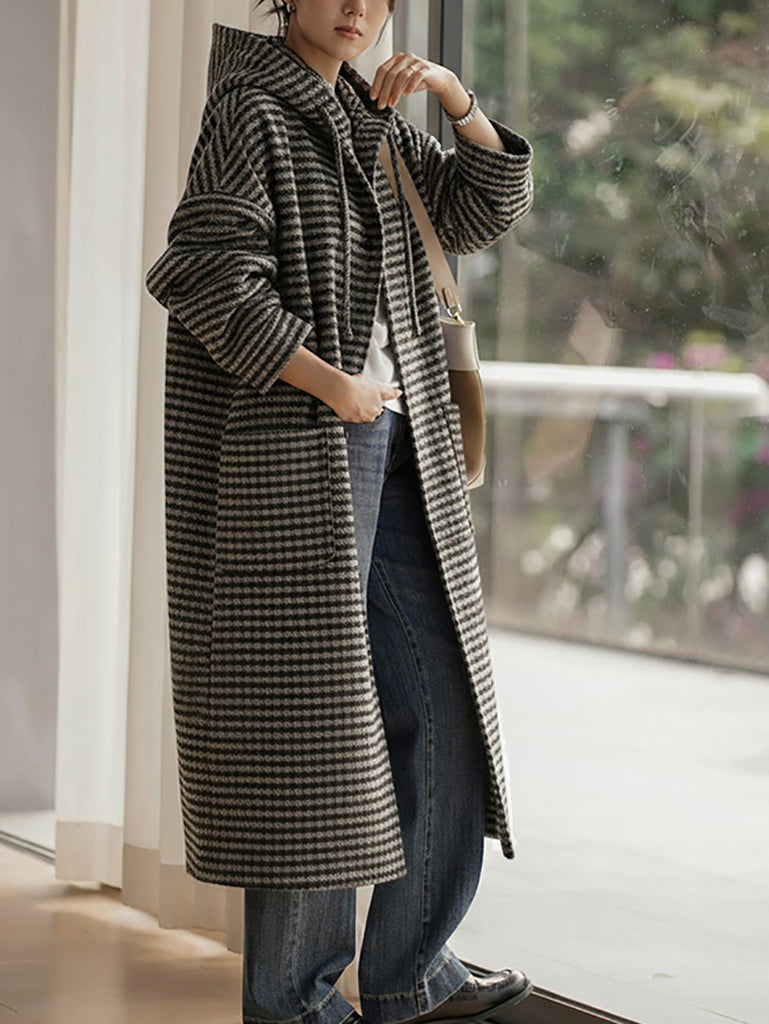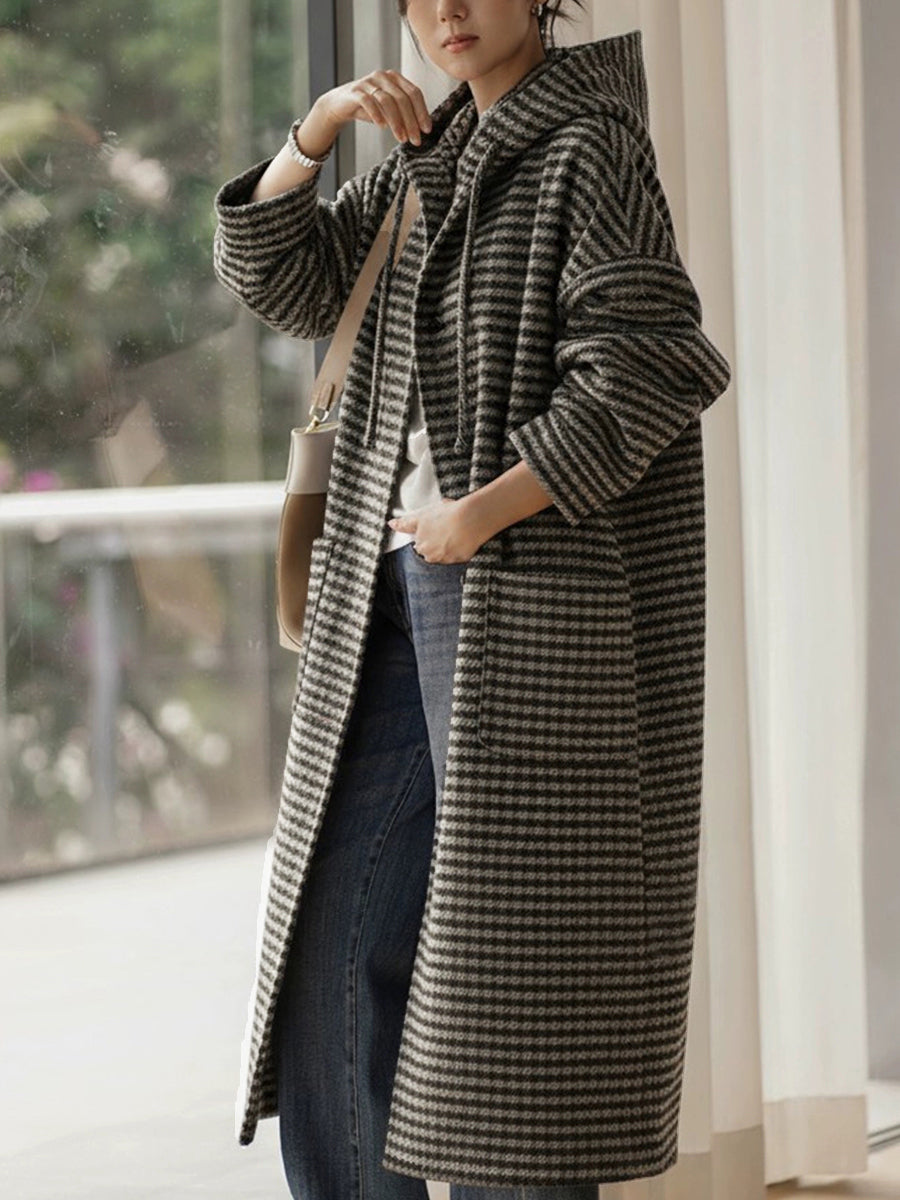 Dámský vintage zimní pruhovaný kabát s kapucí