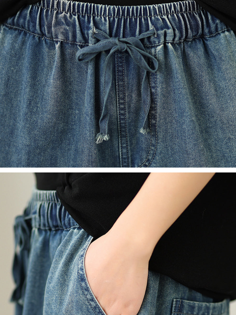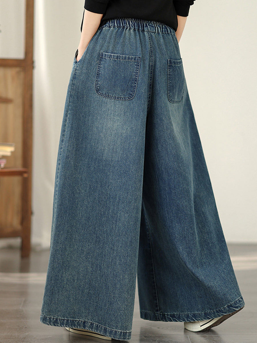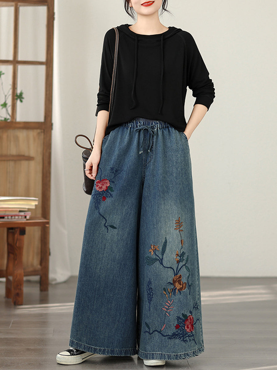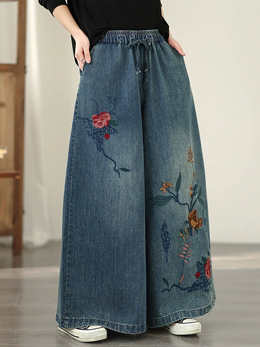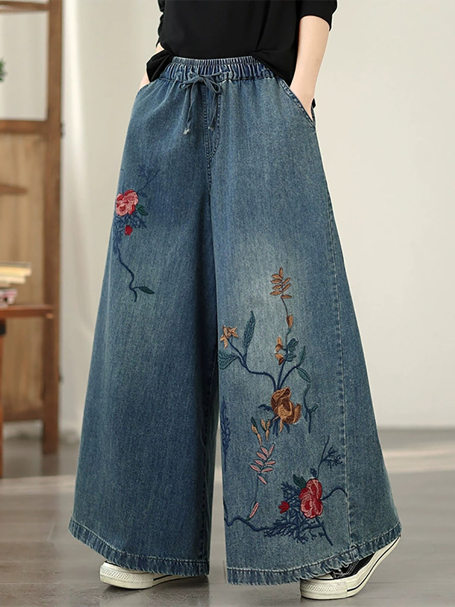 Dámské jarní vintage džínové kalhoty s květinovou výšivkou a širokými nohavicemi