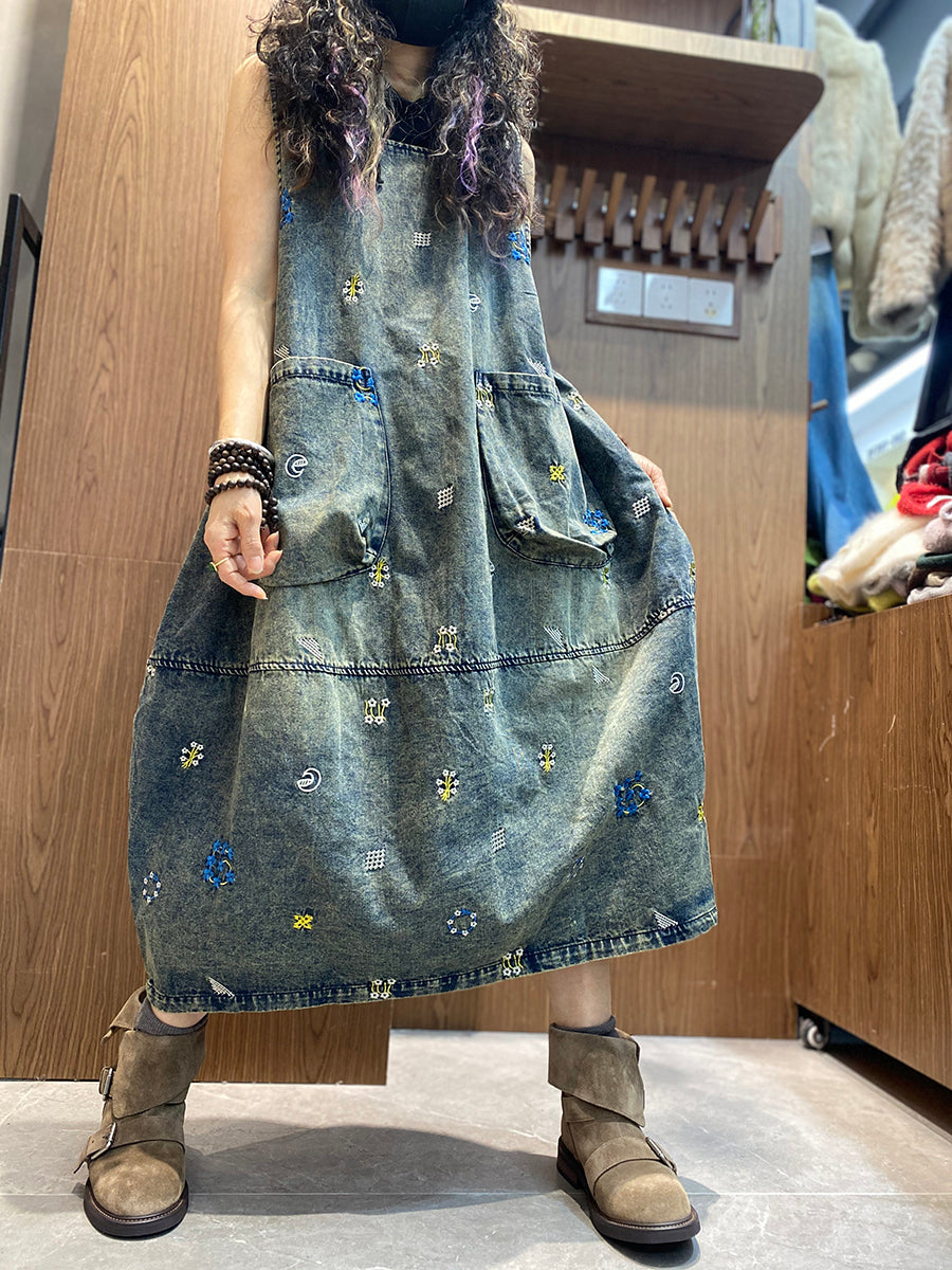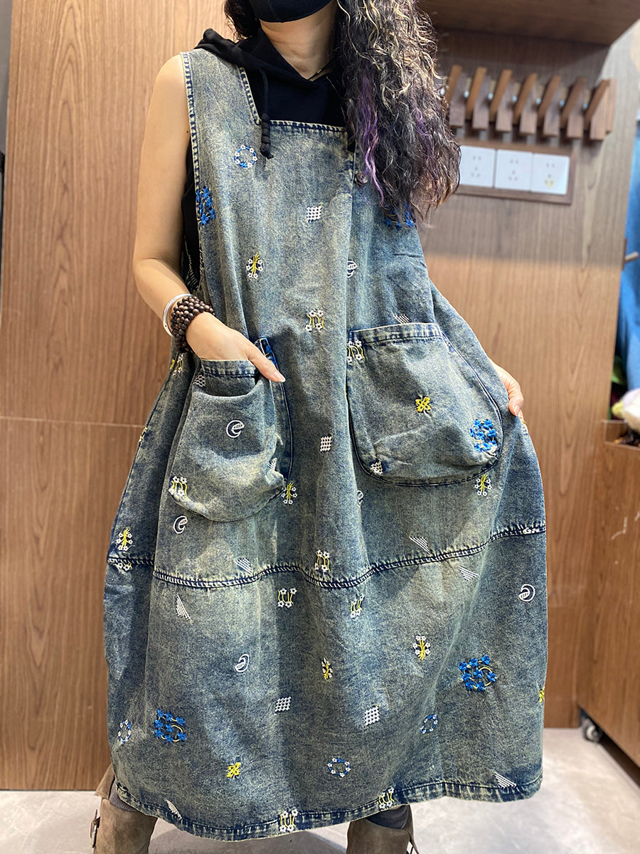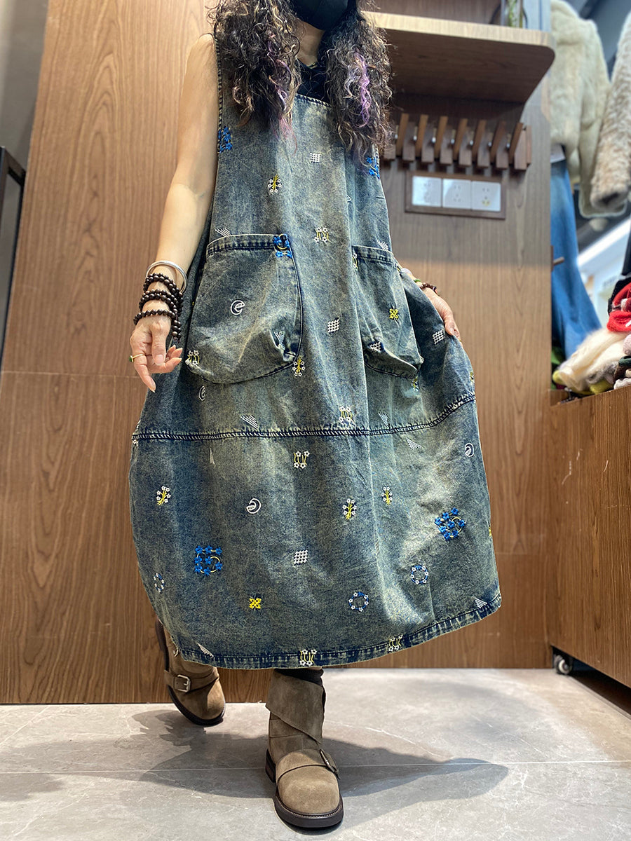Dámské jarní retro džínové šaty s květinovou výšivkou