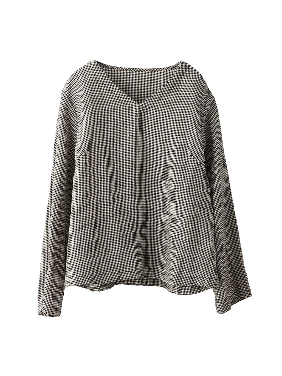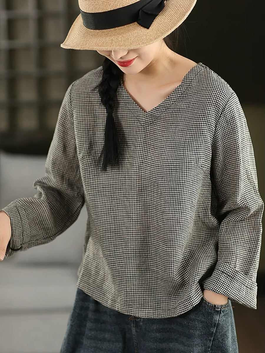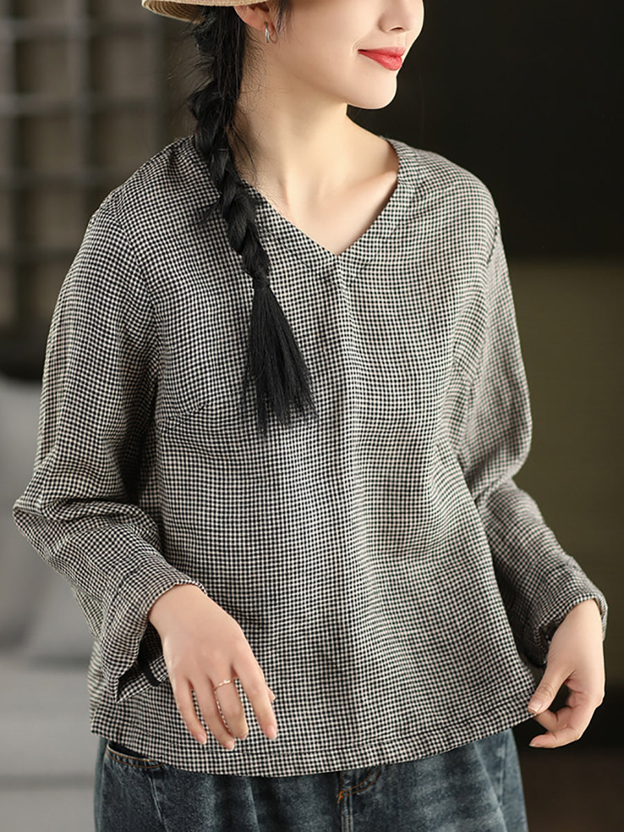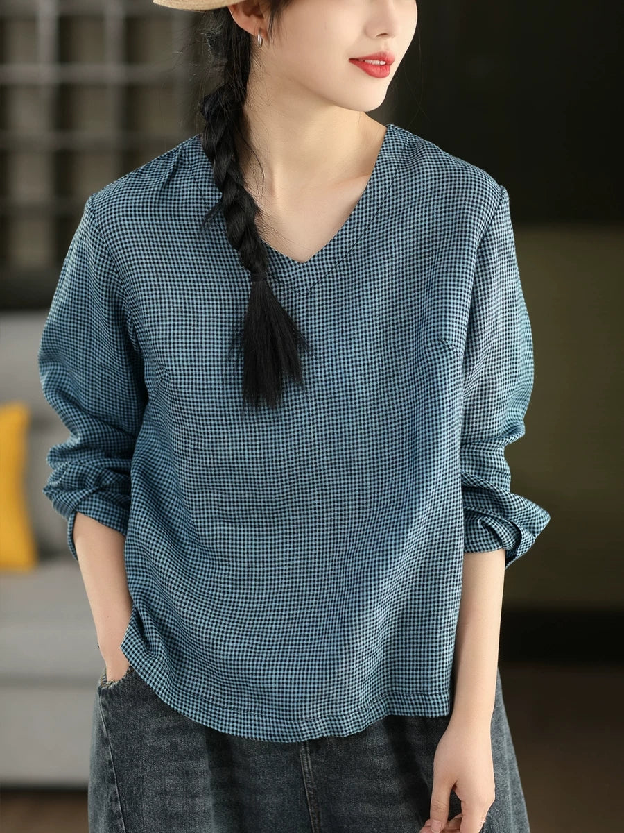 Dámská jarní vintage košile s mřížkovaným výstřihem do V, 100% lněný vzor