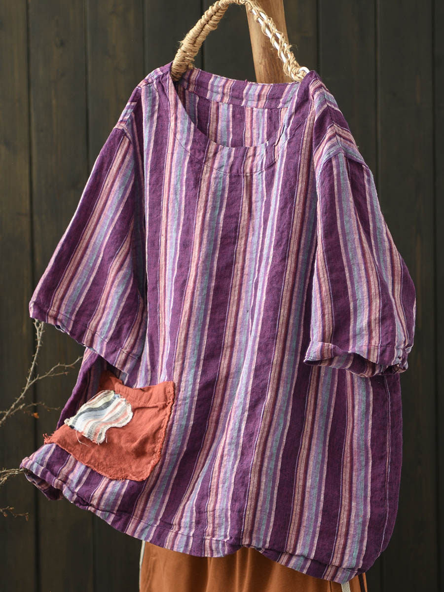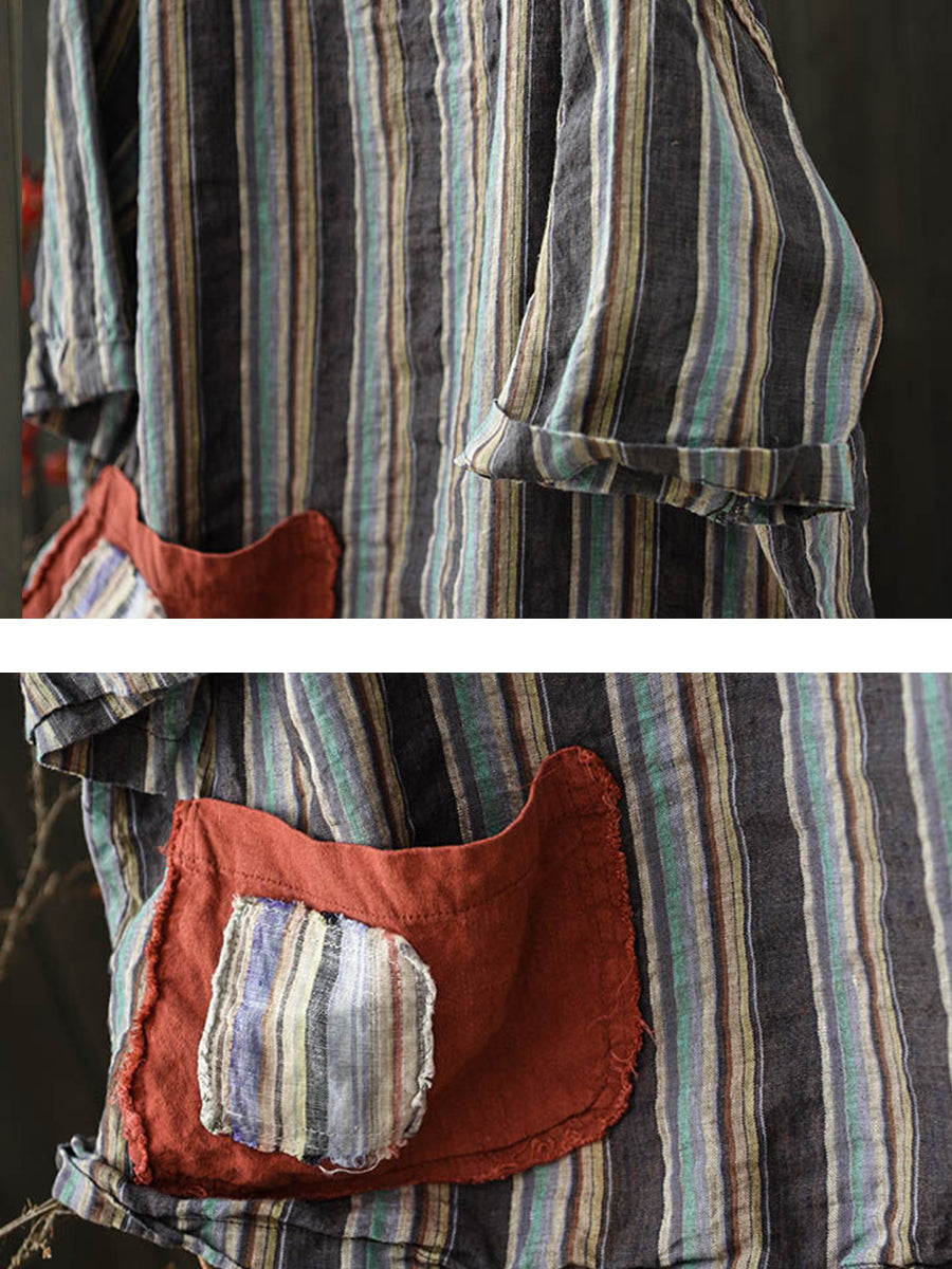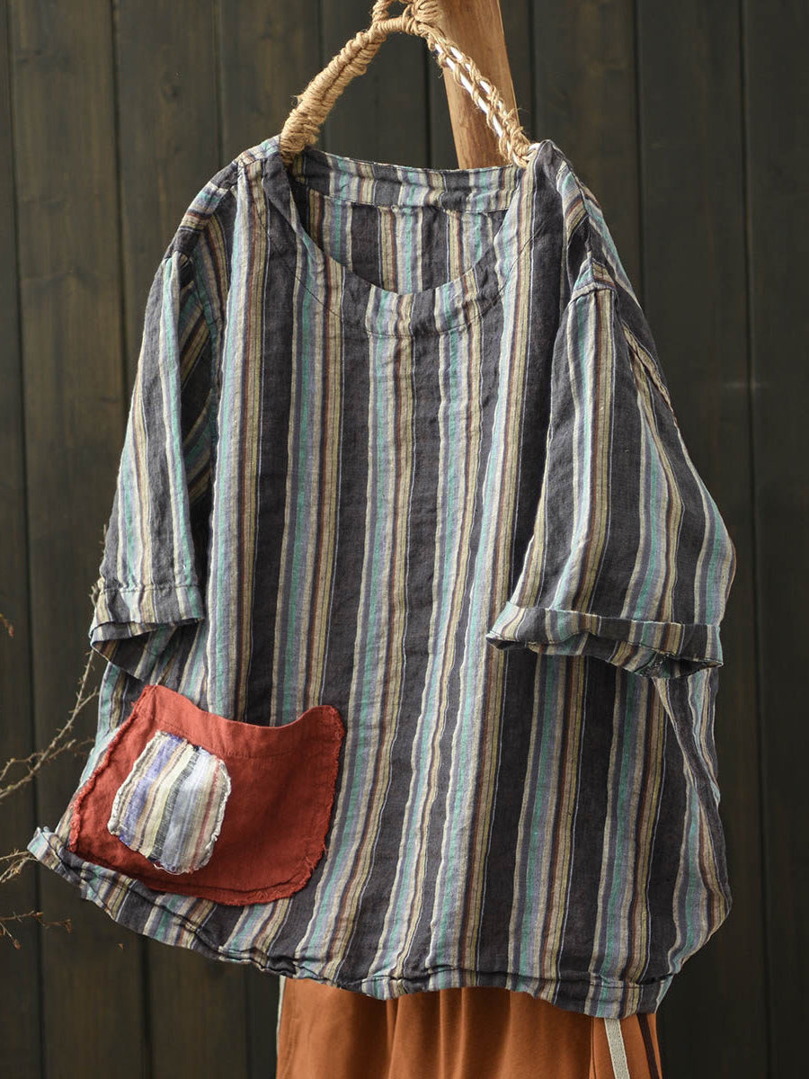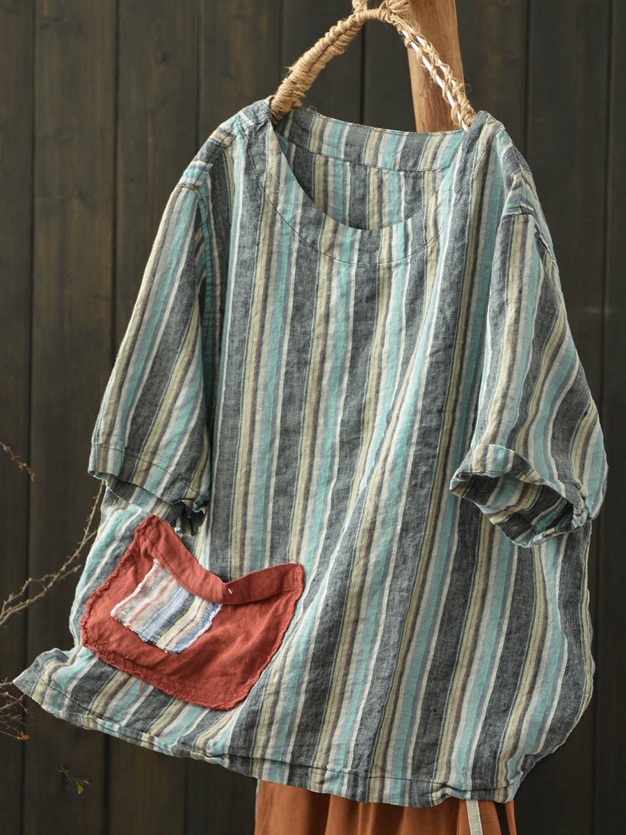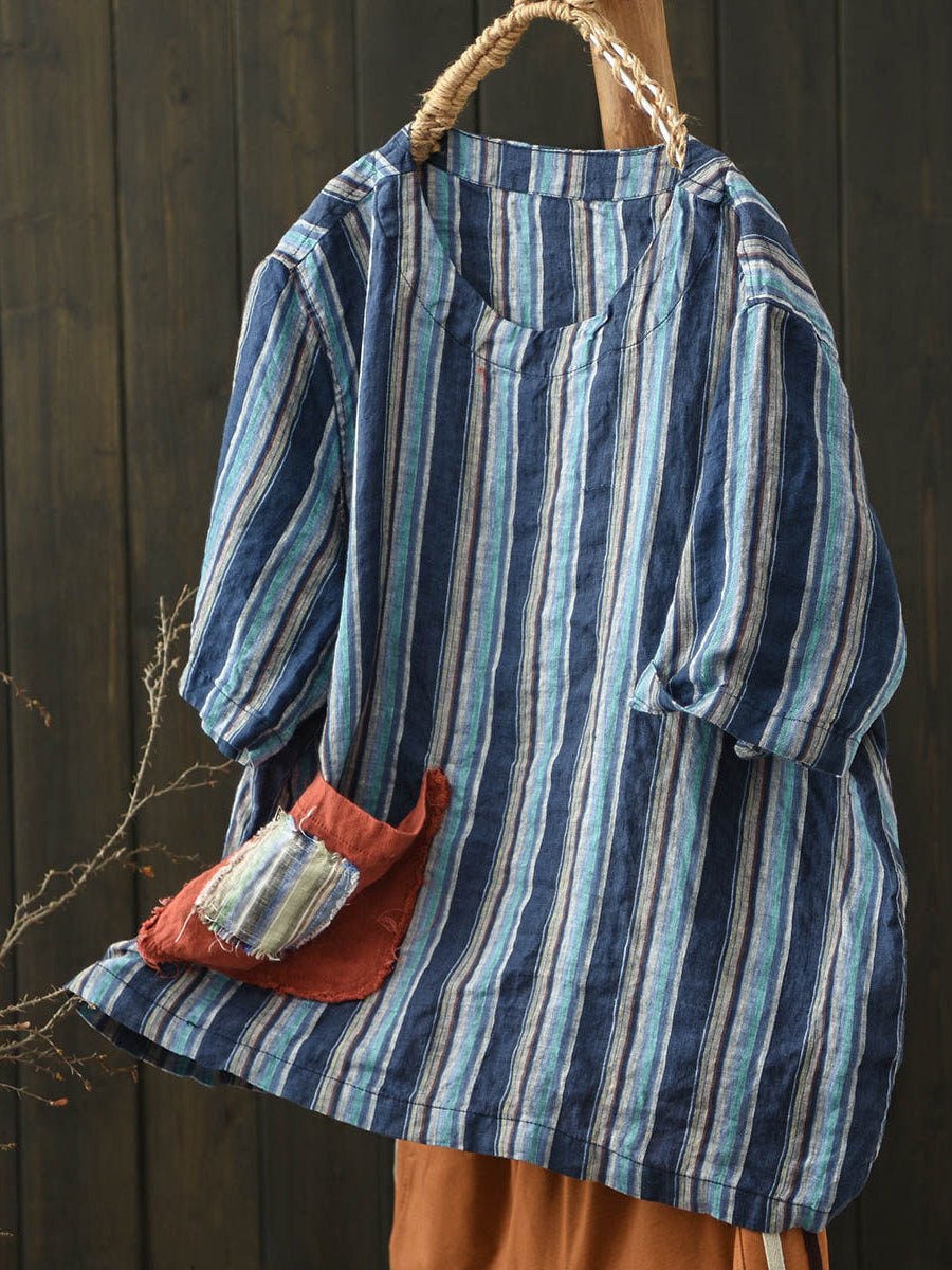 Dámská letní vintage pruhovaná lněná košile s výstřihem do O-neck