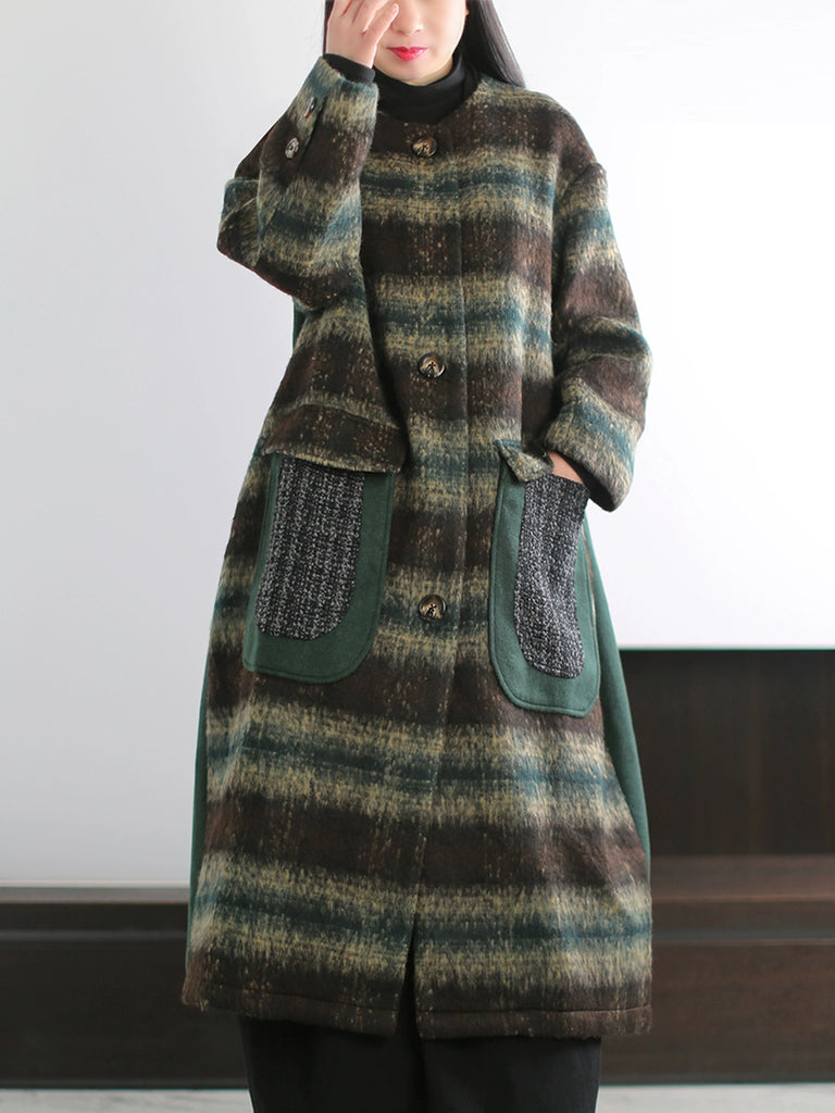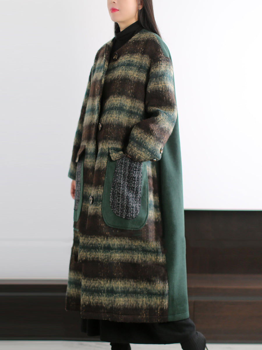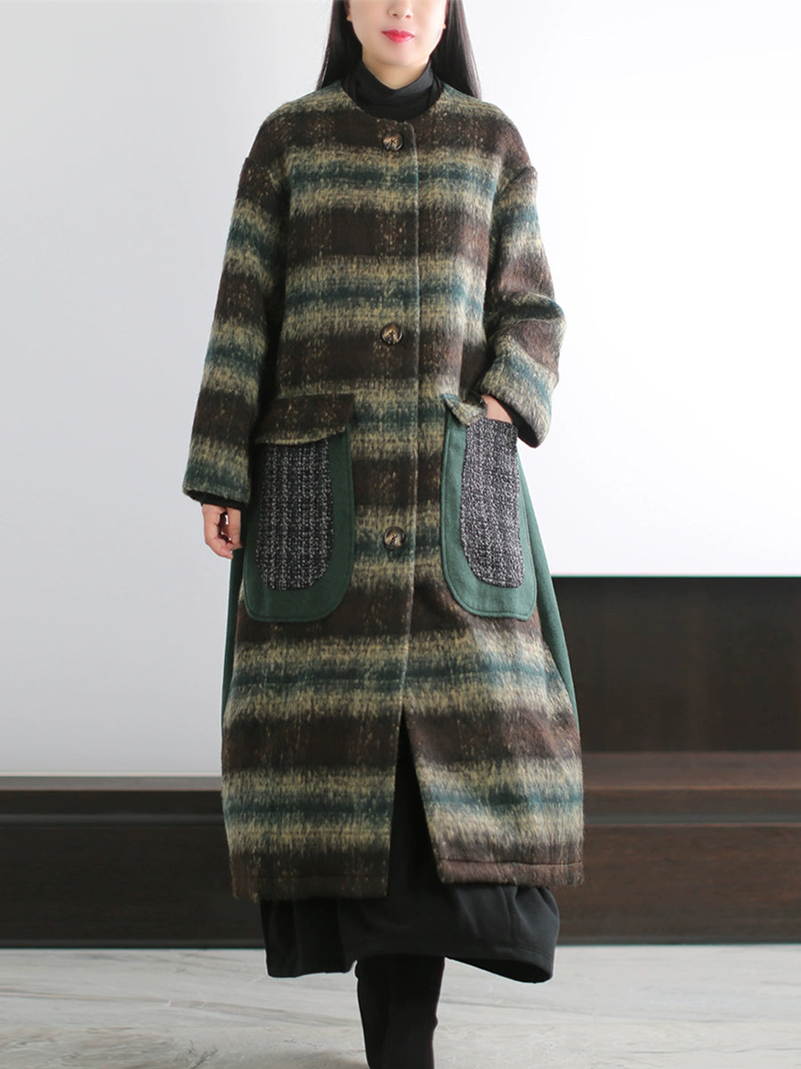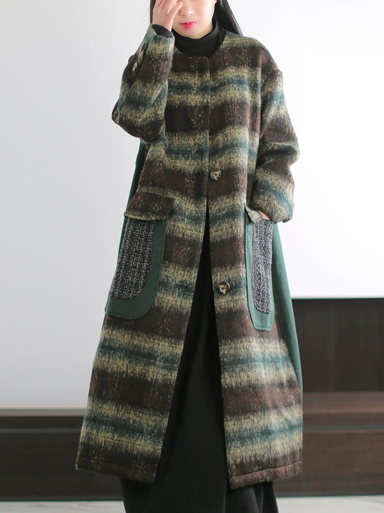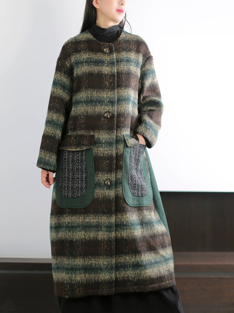 Dámský vintage zimní pruhovaný vlněný kabát ve tvaru kokonu