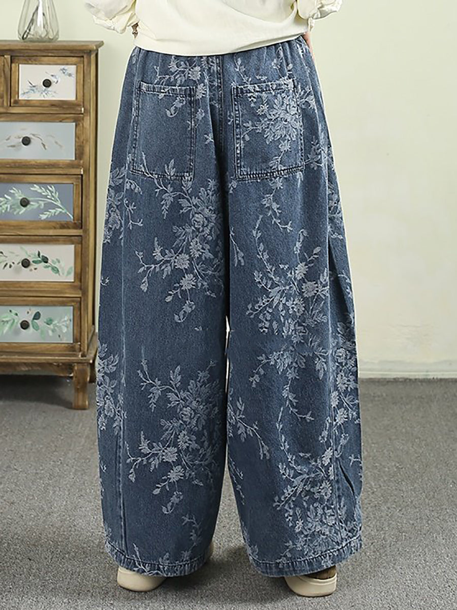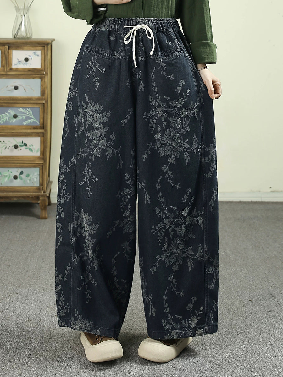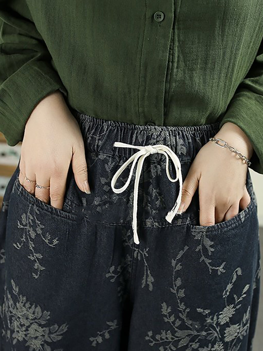 Dámské jarní vintage květinové bavlněné kalhoty se širokými nohavicemi