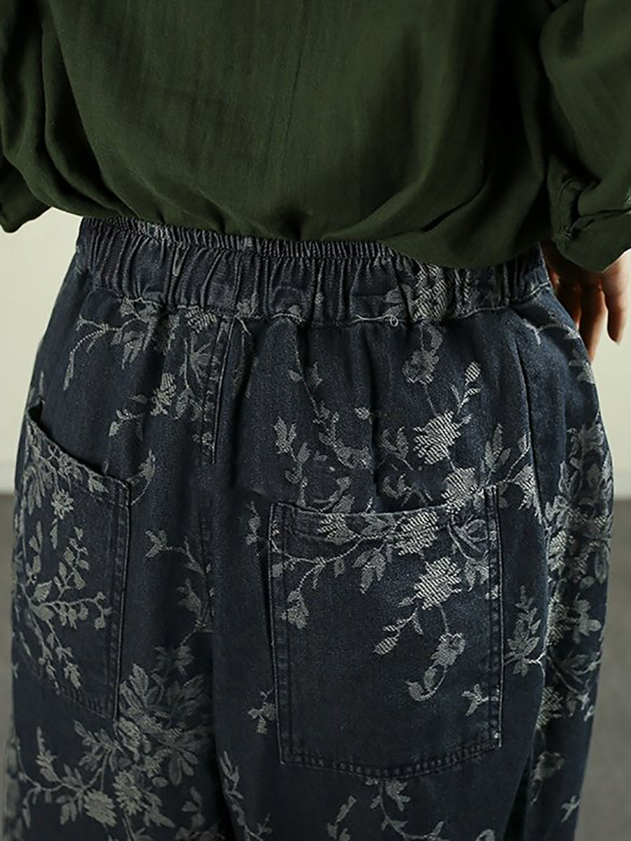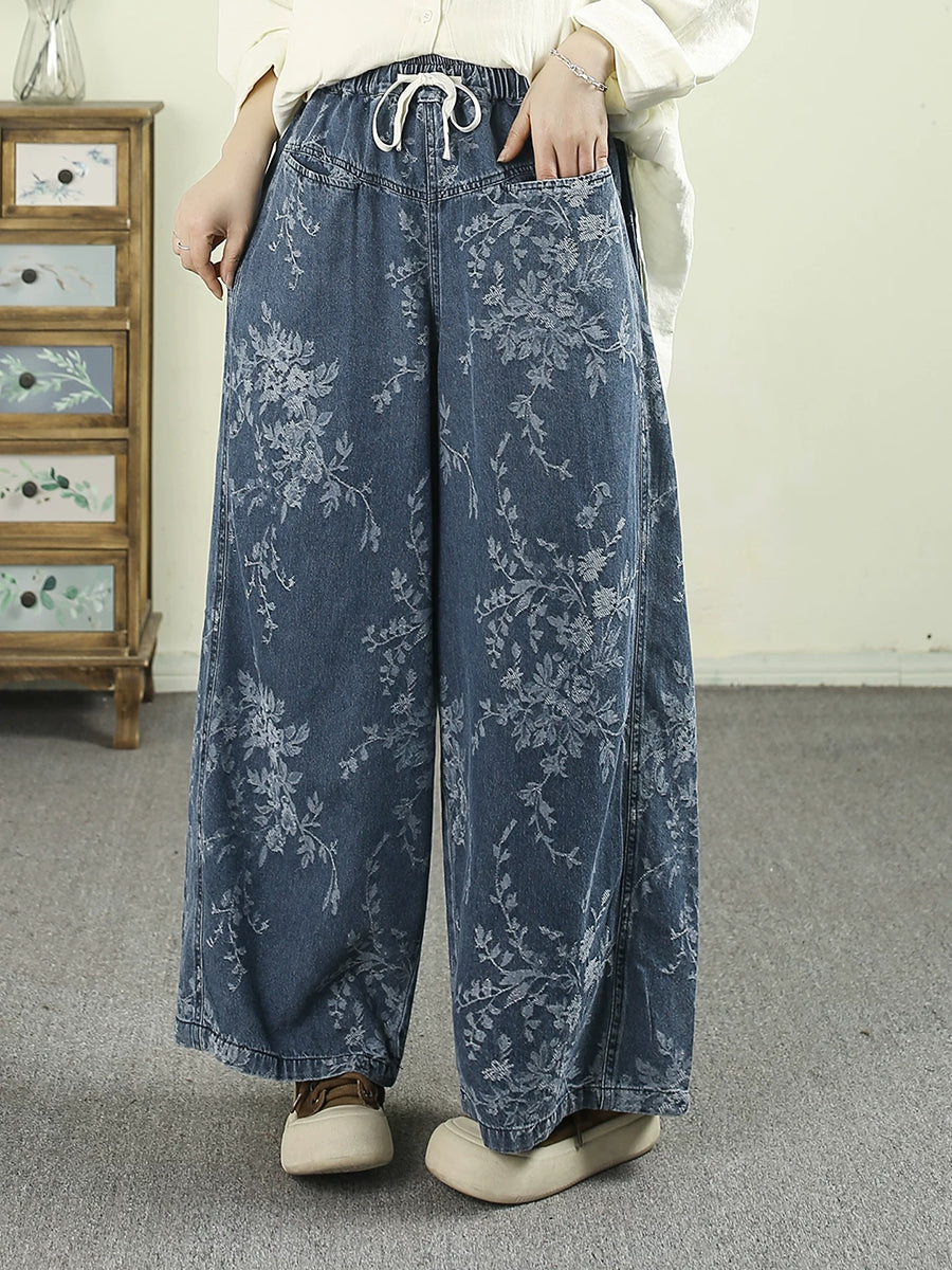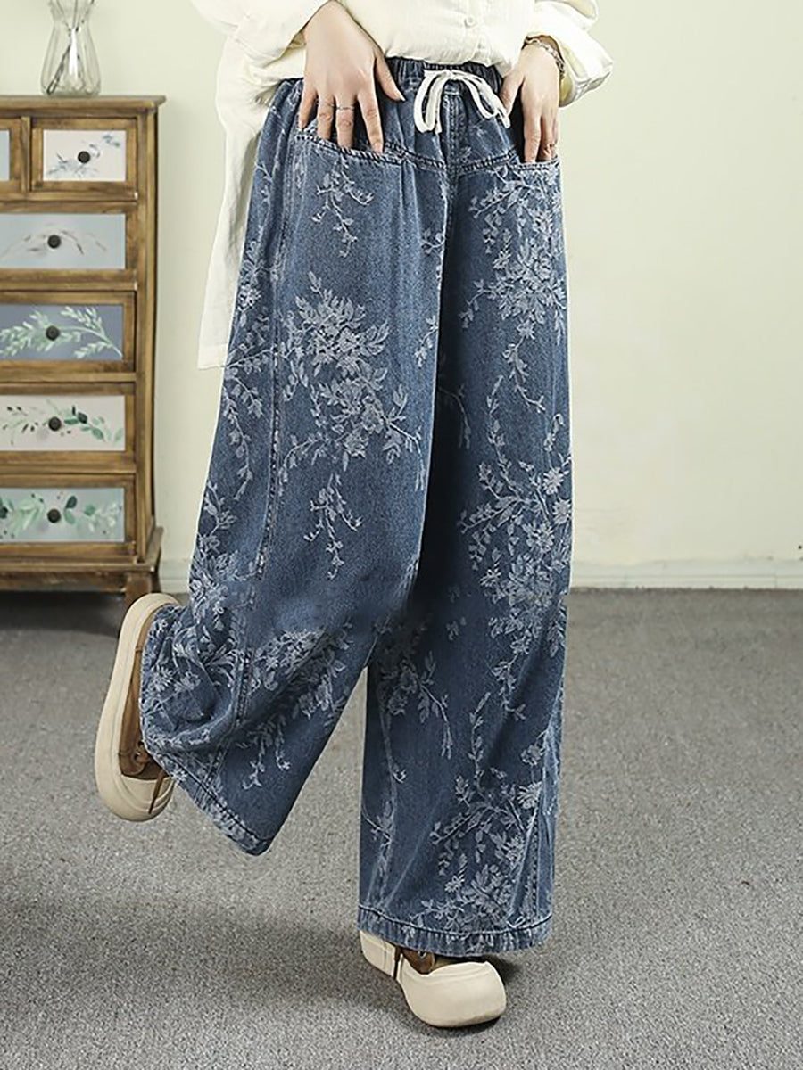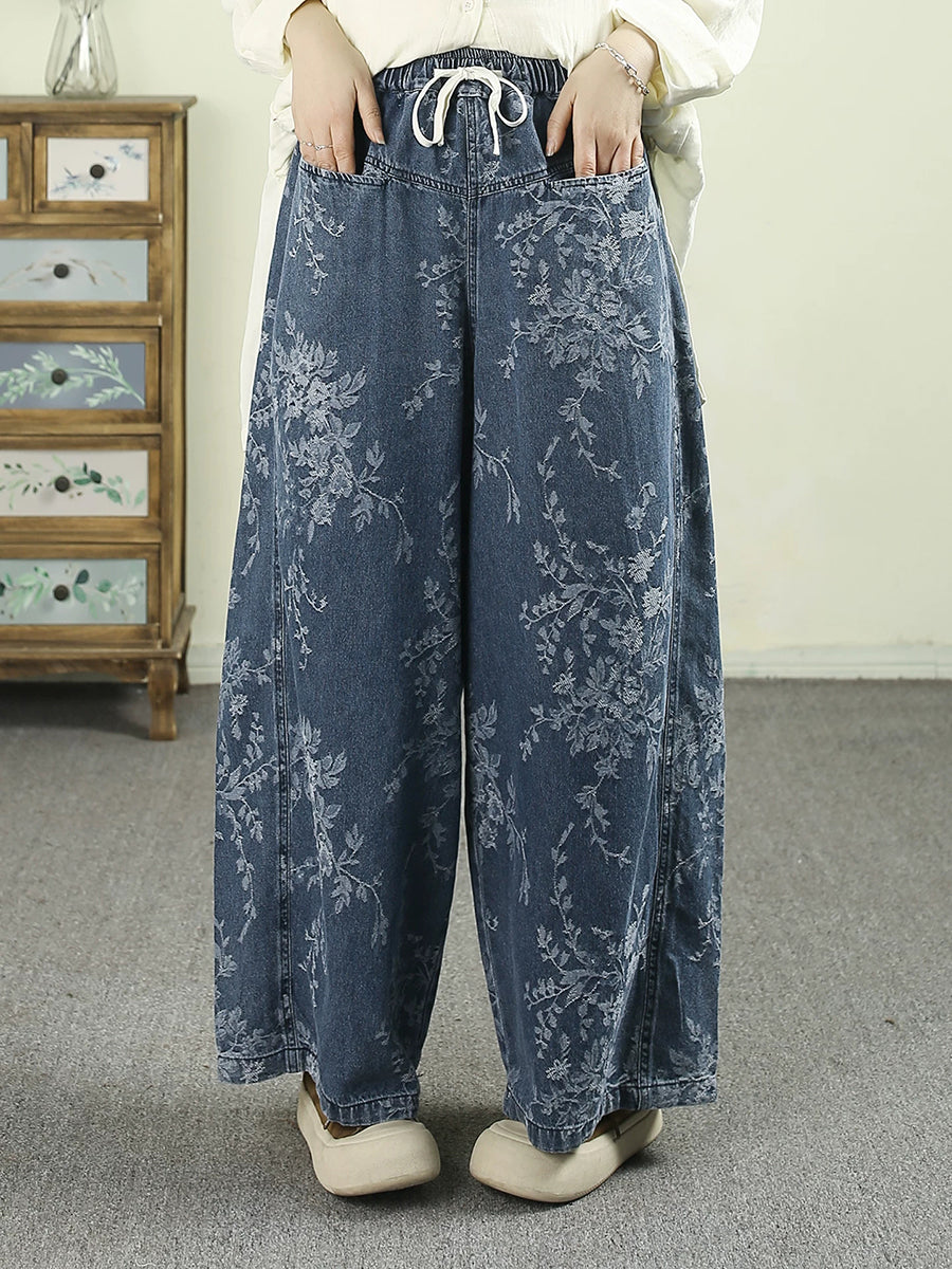 Dámské jarní vintage květinové bavlněné kalhoty se širokými nohavicemi