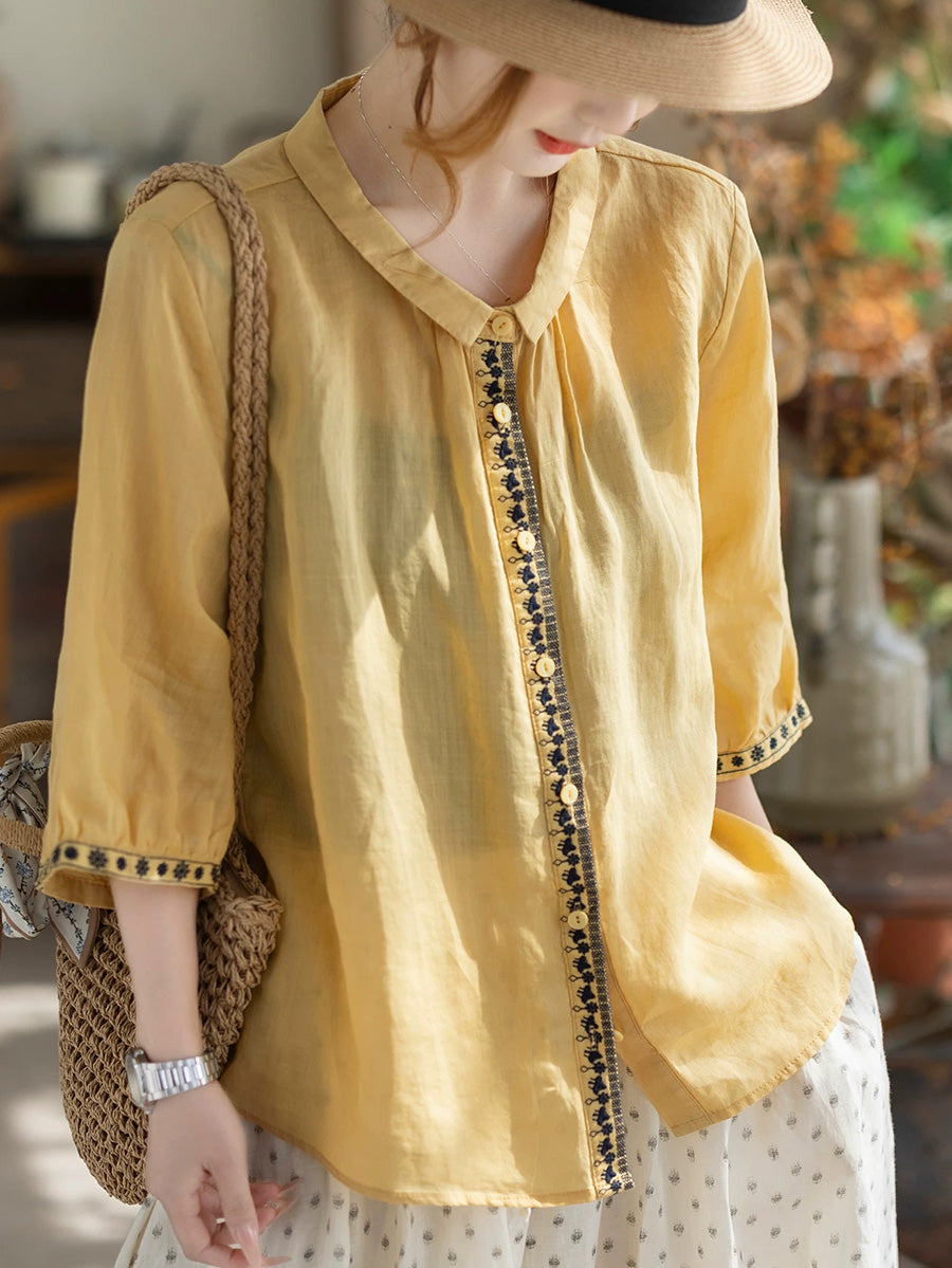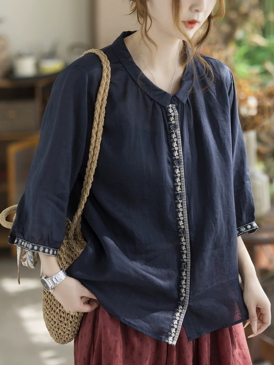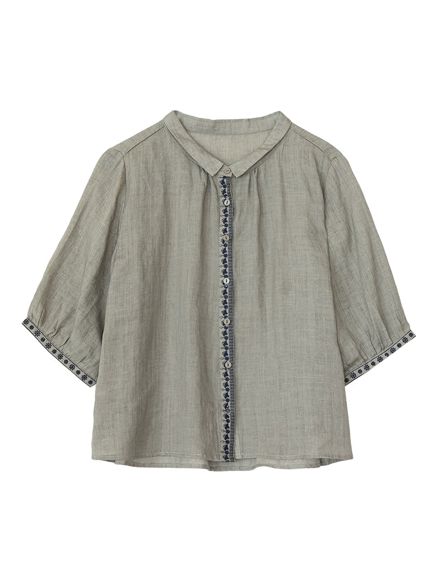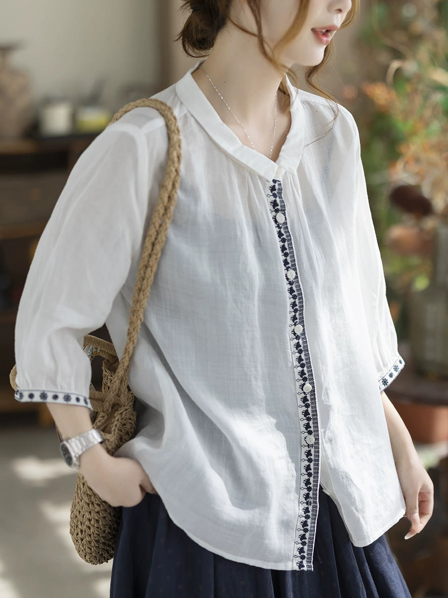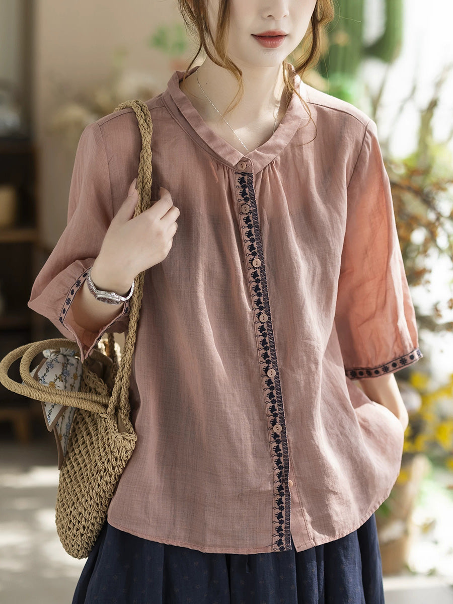 Dámská letní vintage košile s výšivkou a stojáčkem, 100% ramie