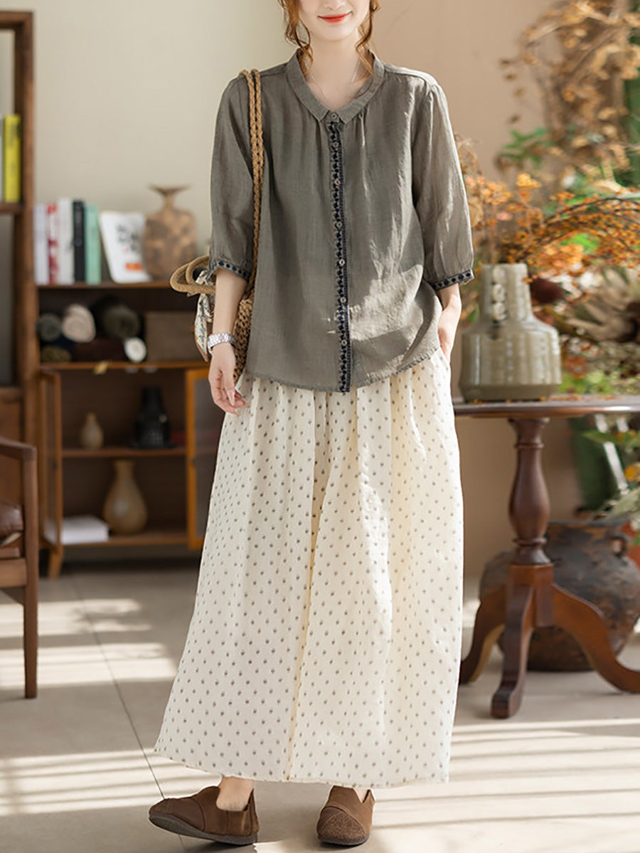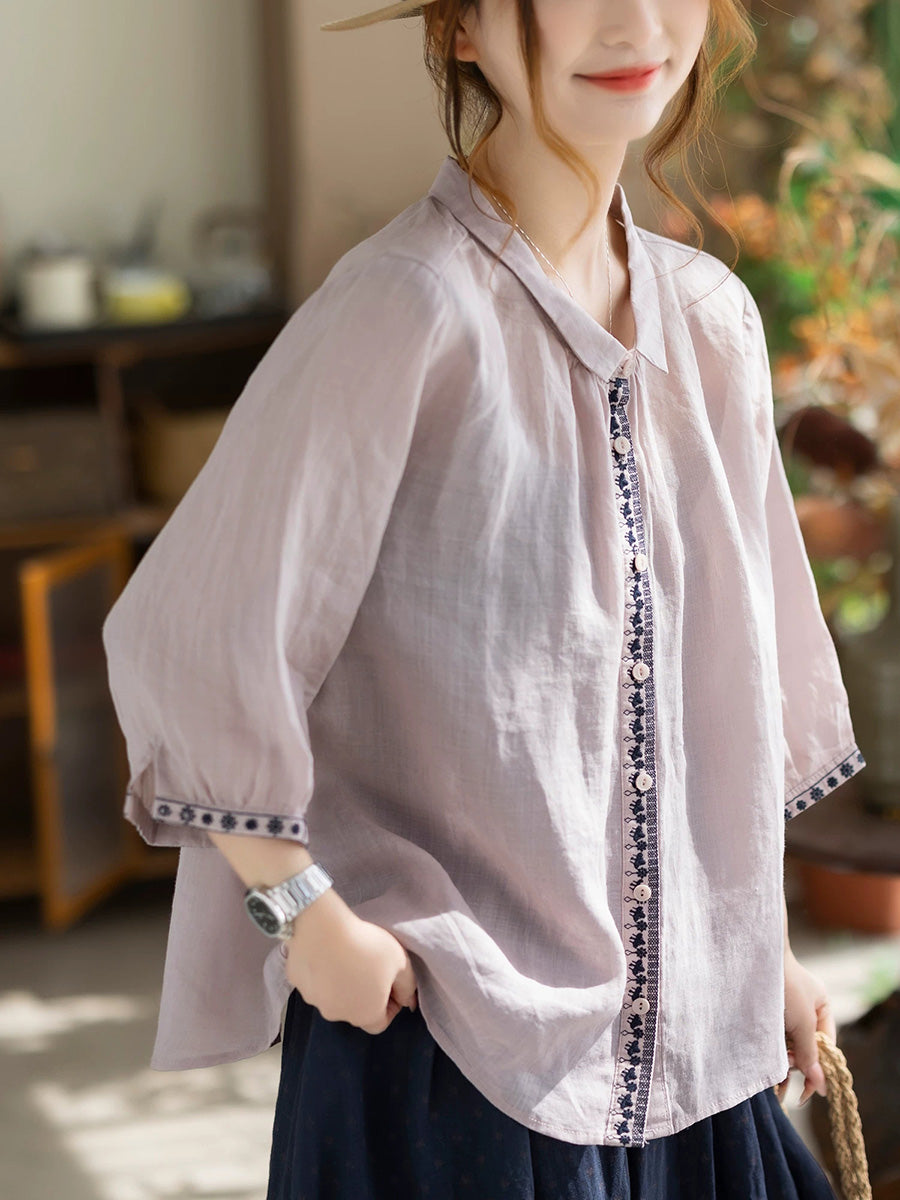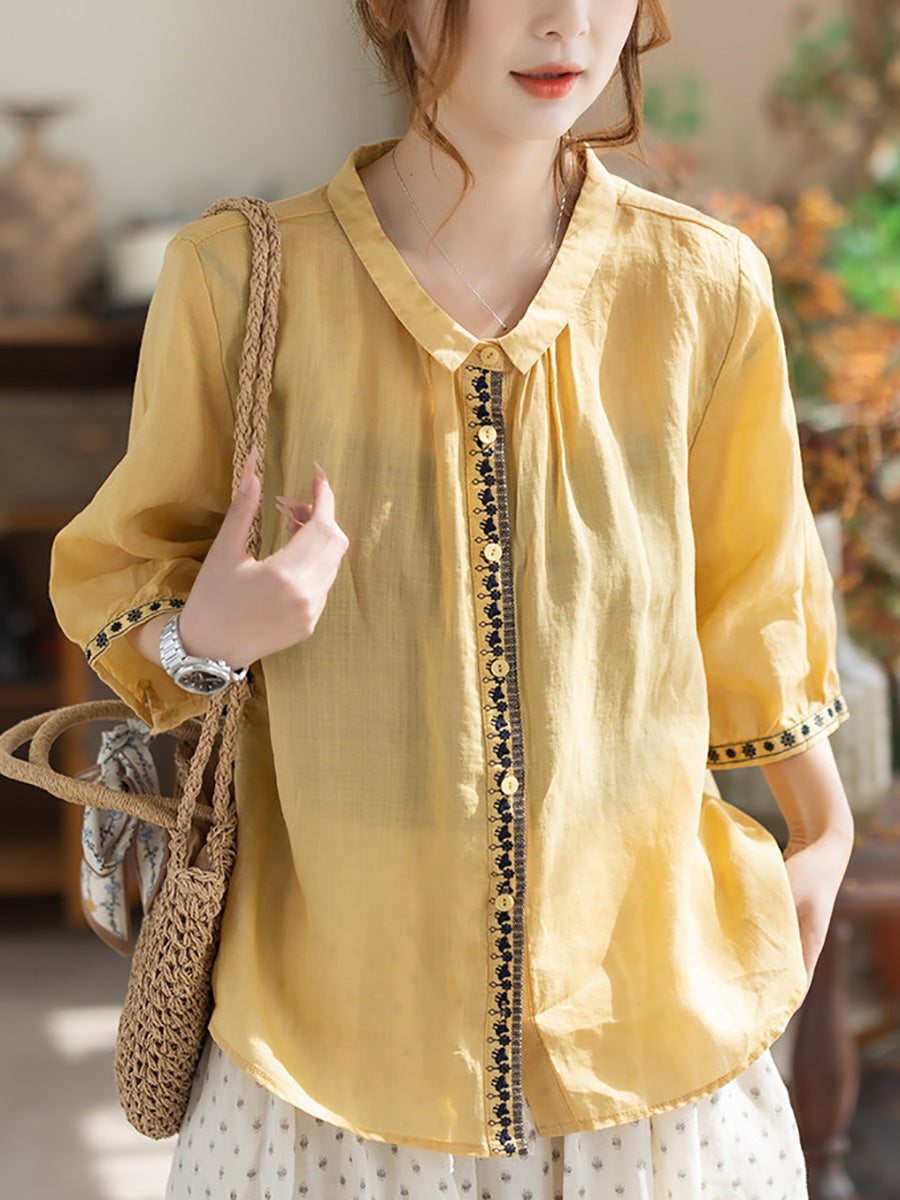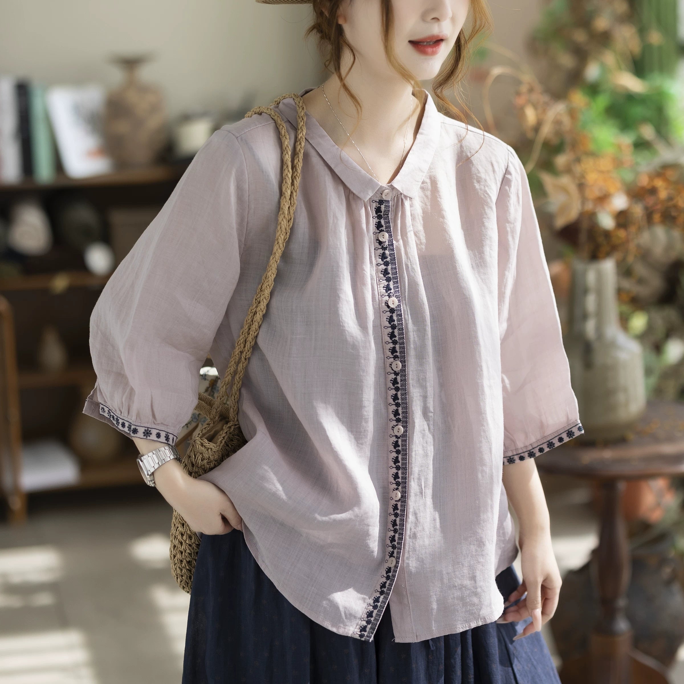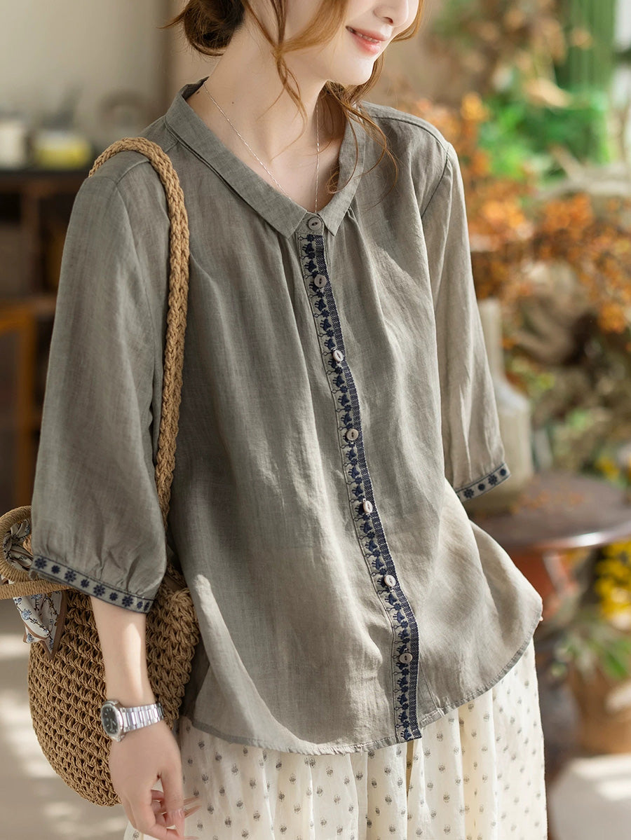 Dámská letní vintage košile s výšivkou a stojáčkem, 100% ramie