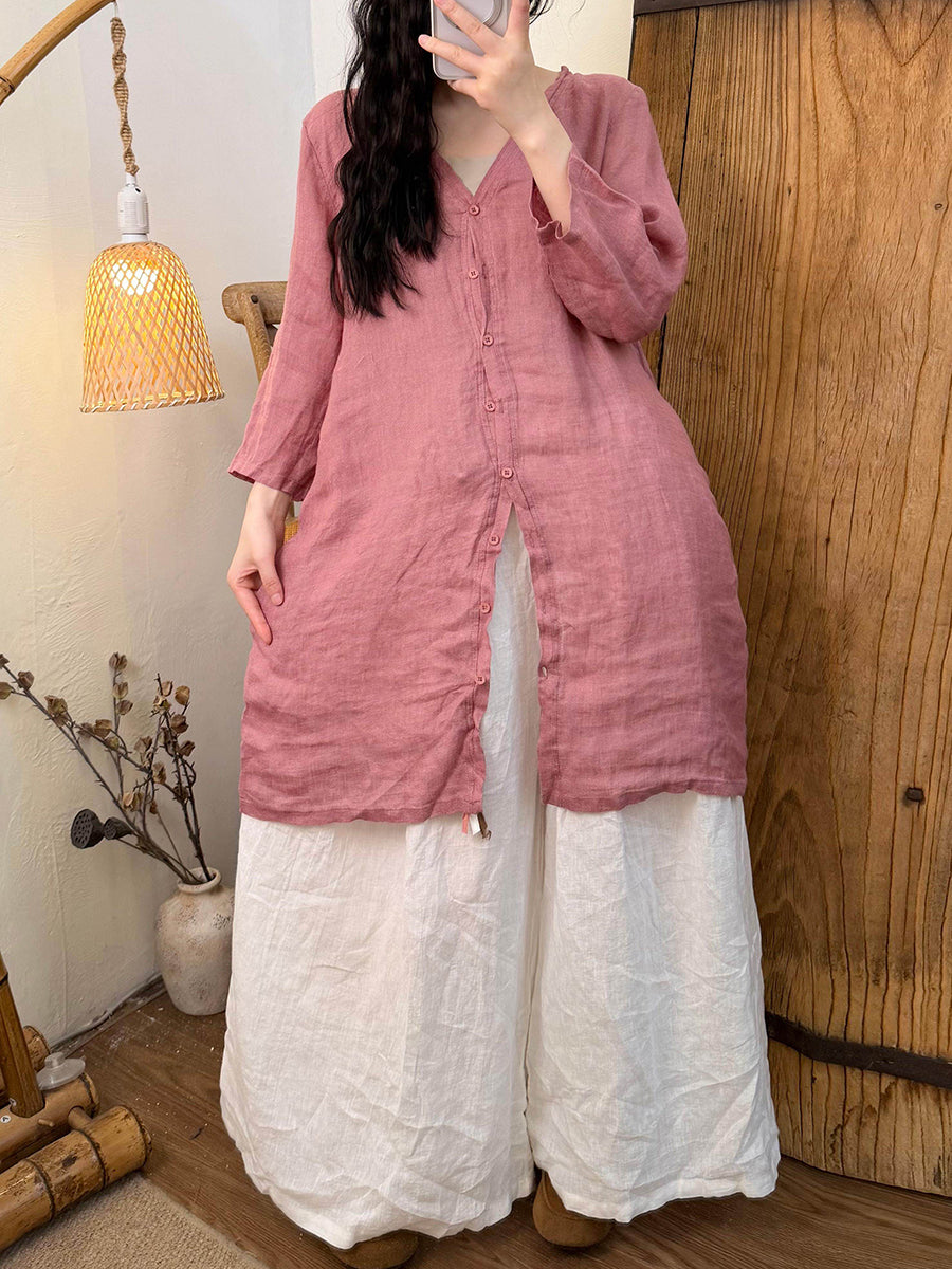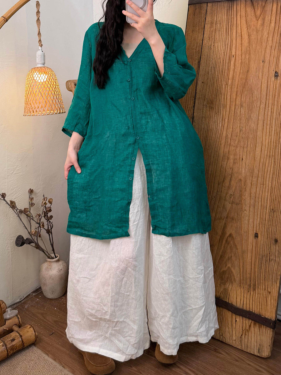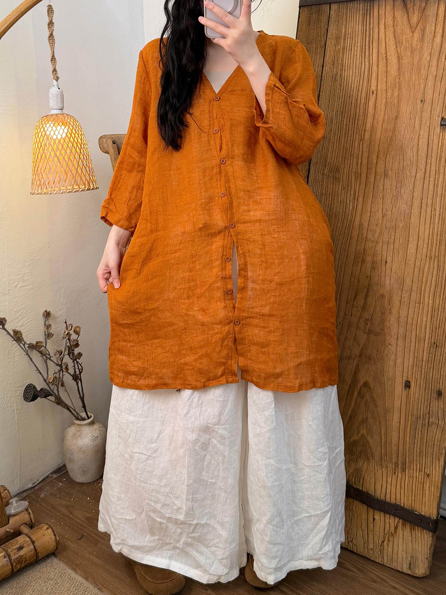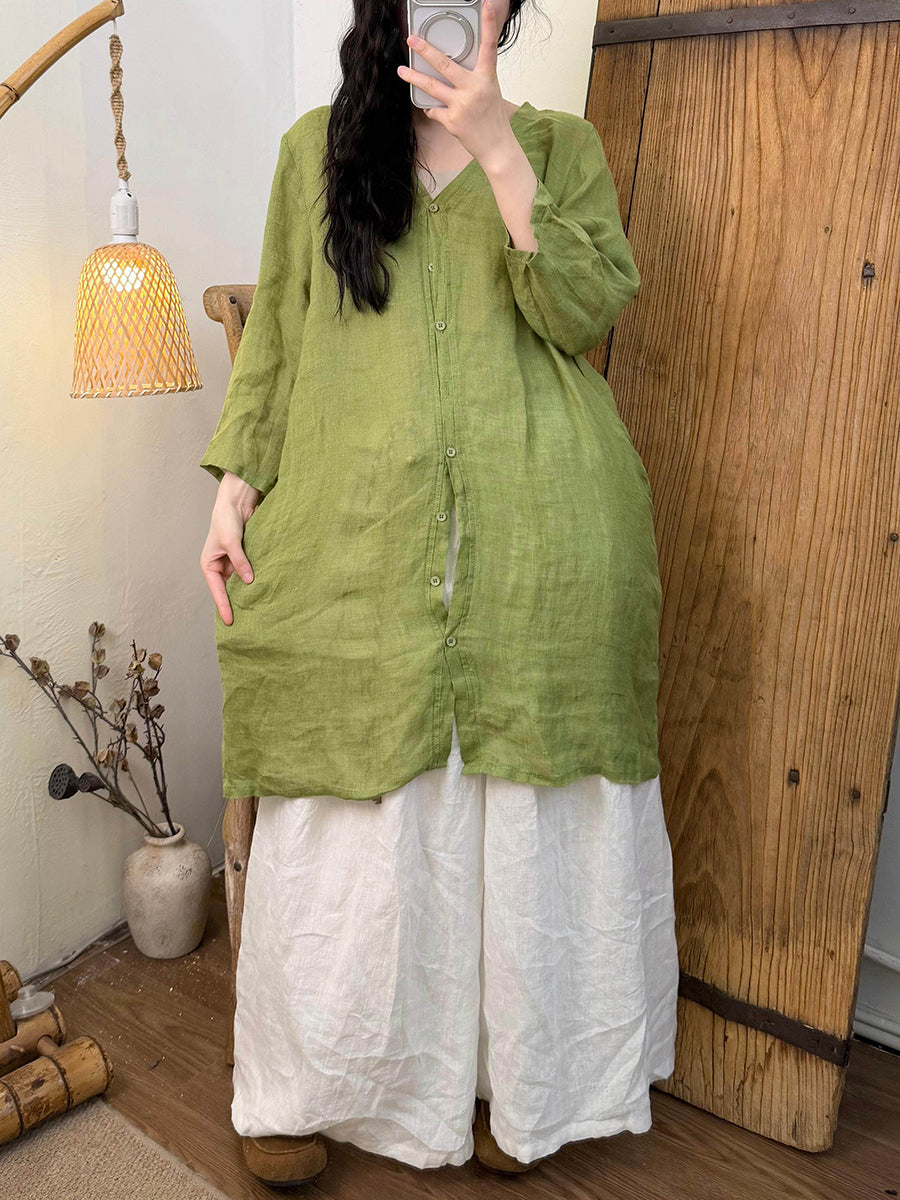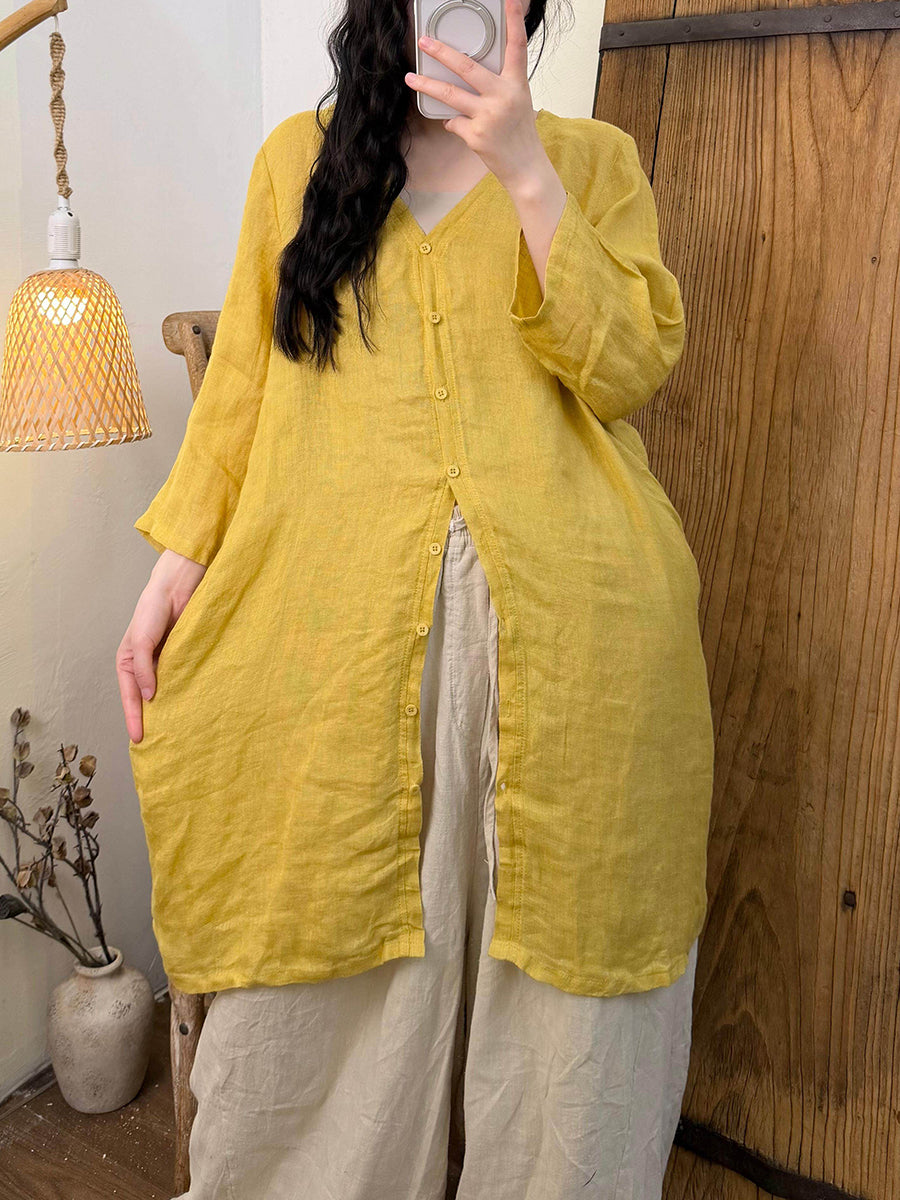 Dámská letní čistě barevná lněná košile s výstřihem do V