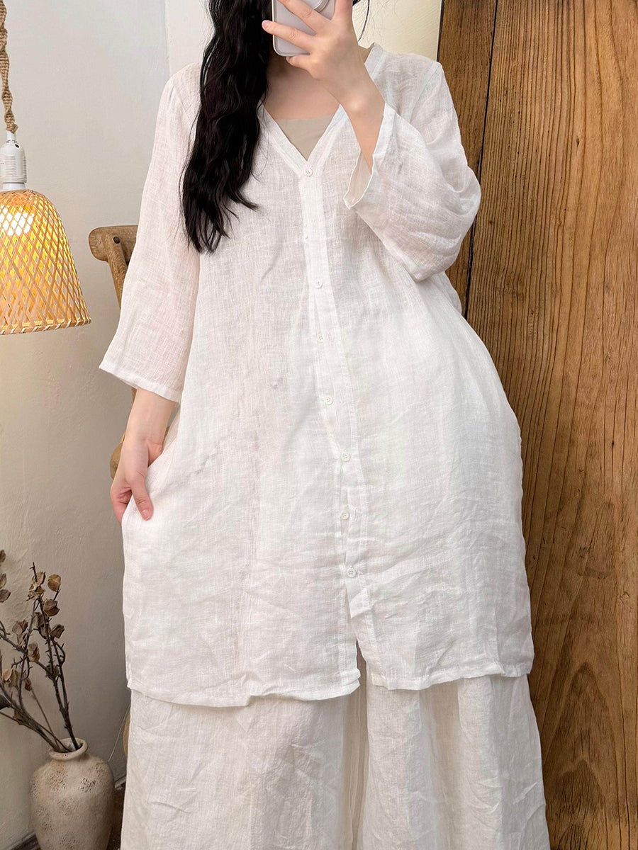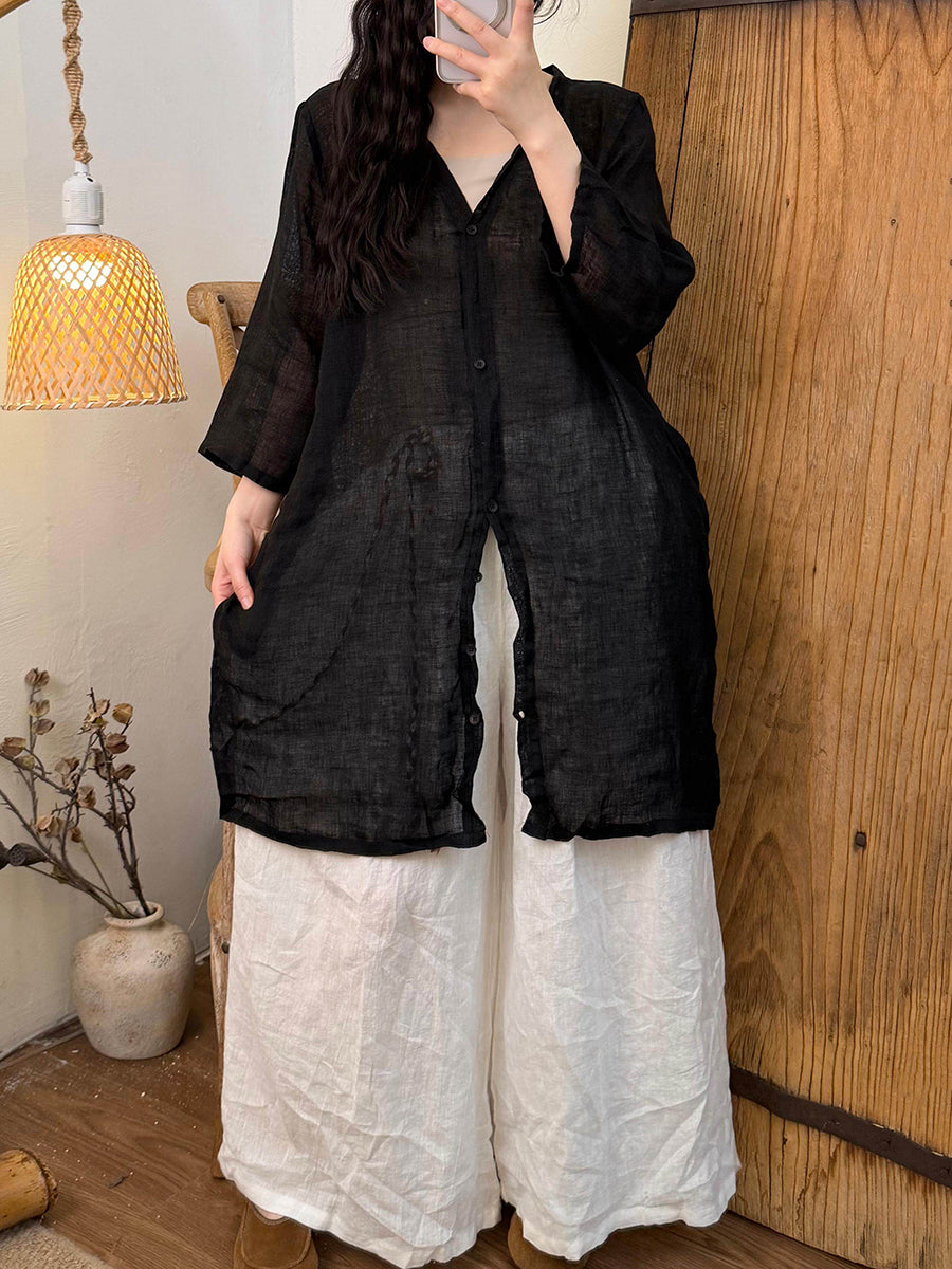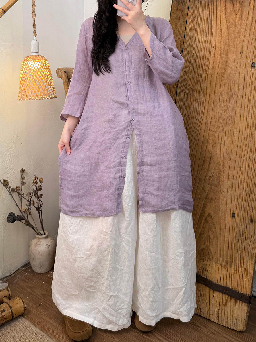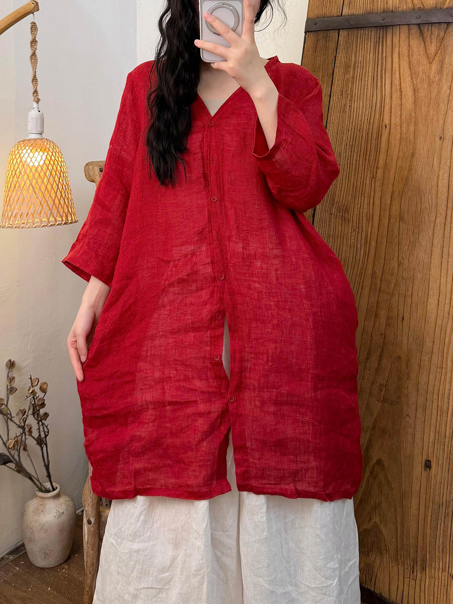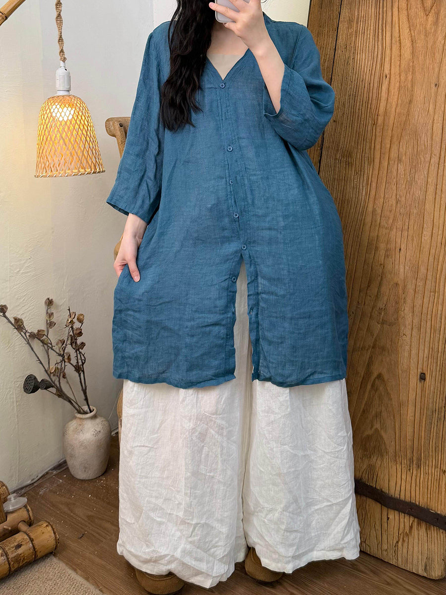 Dámská letní čistě barevná lněná košile s výstřihem do V