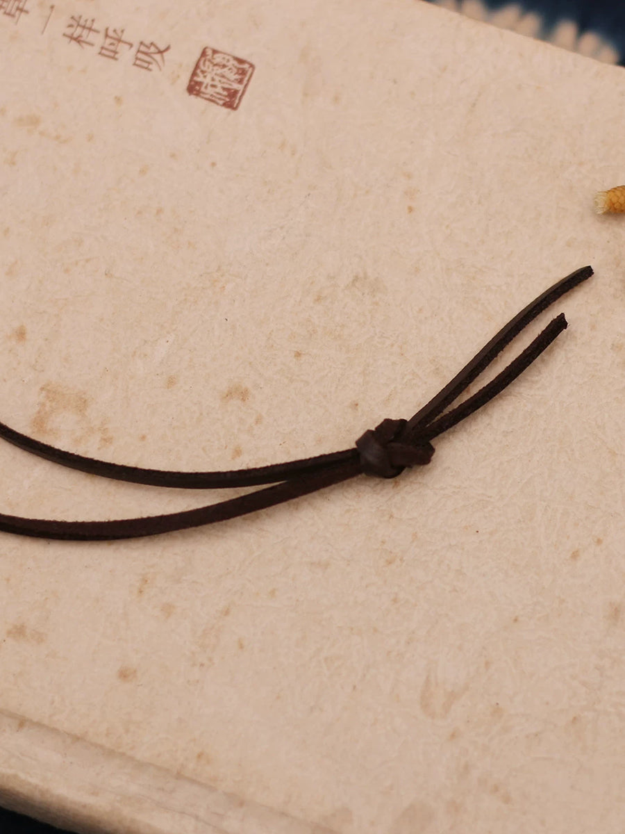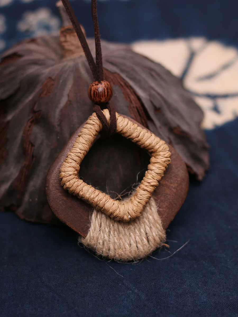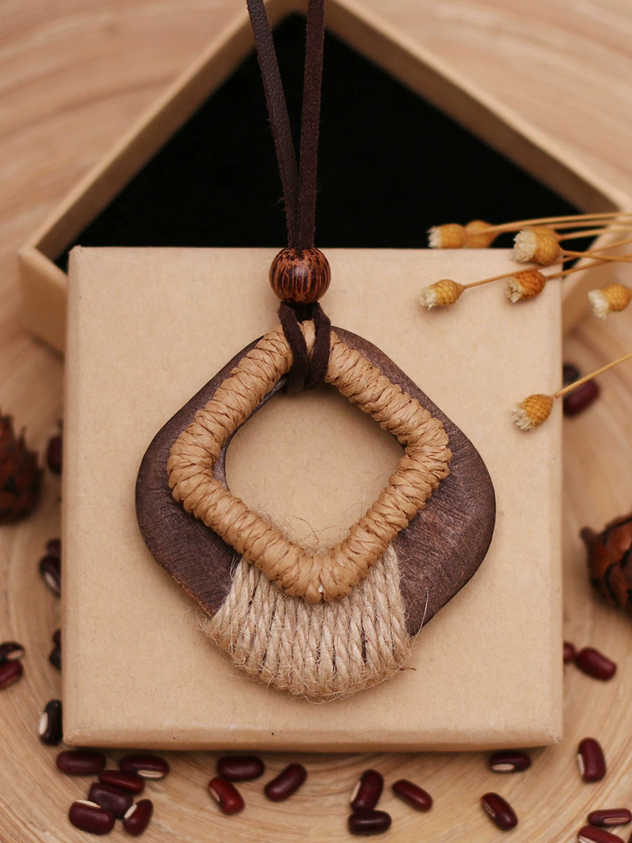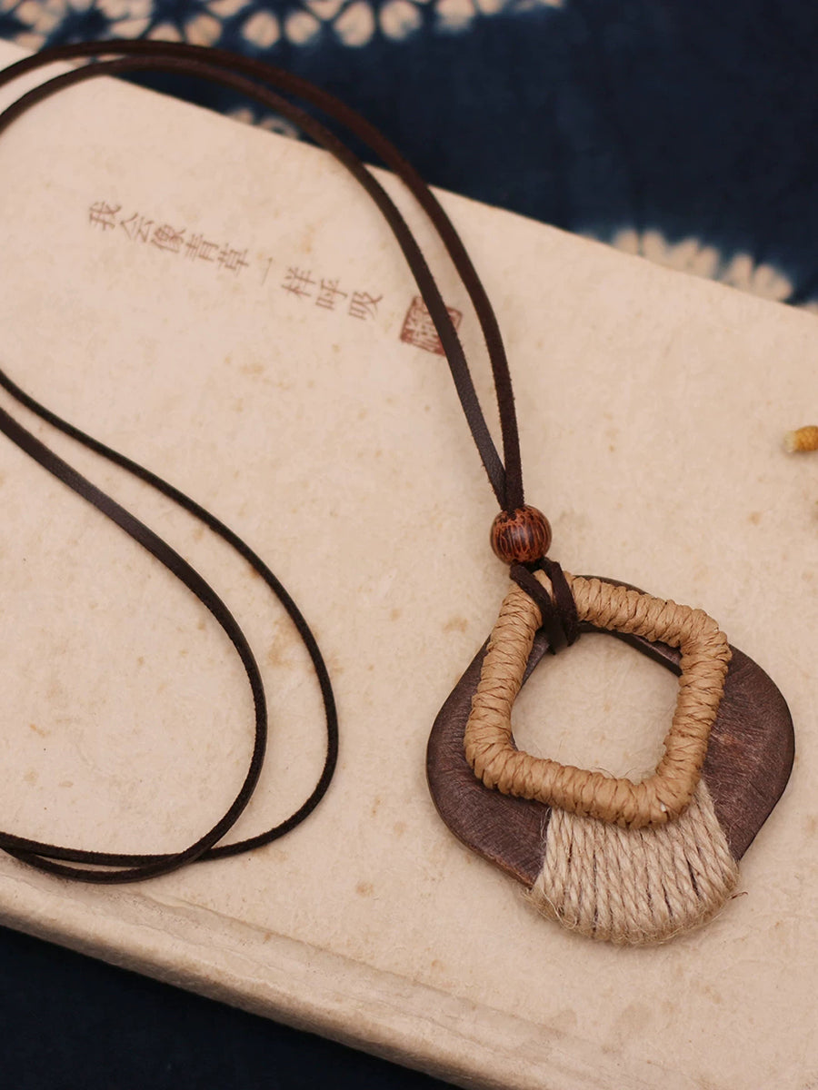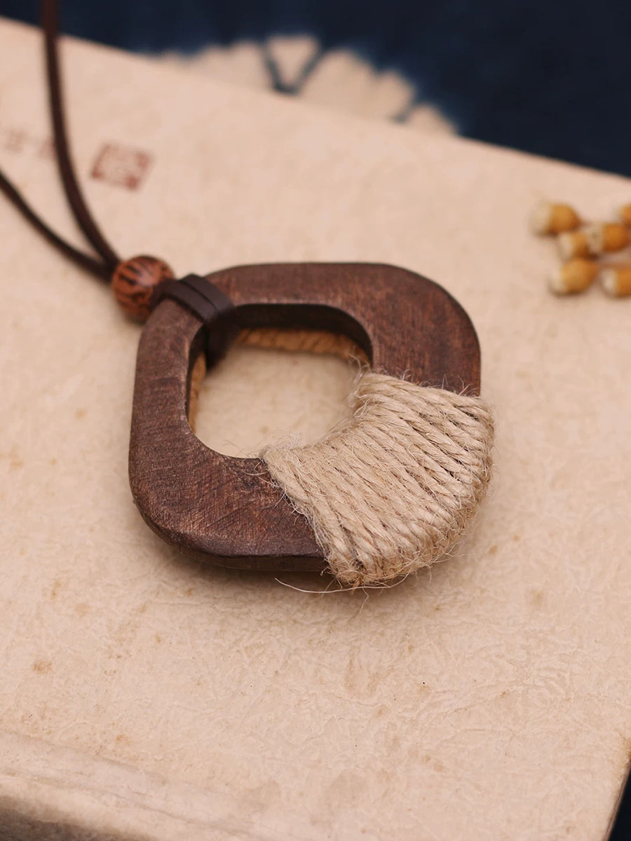Vintage dřevěný náhrdelník s konopným lanem a tkaným svetrem