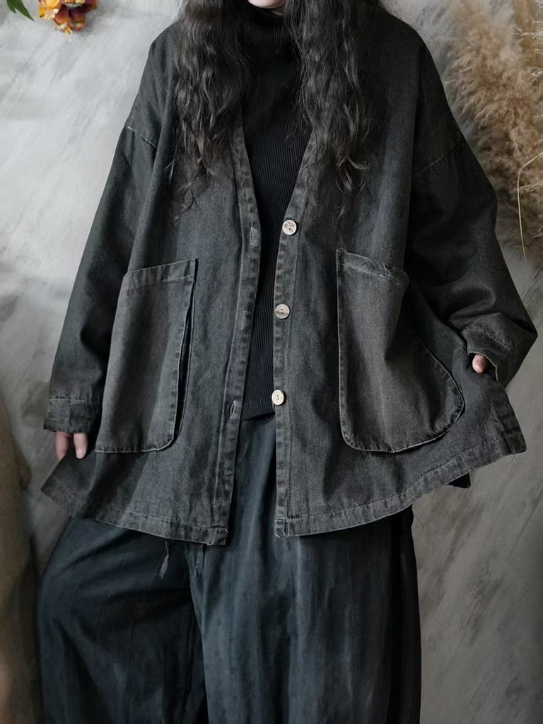Dámský vintage podzimní čistě barevný džínový kabát s výstřihem do V