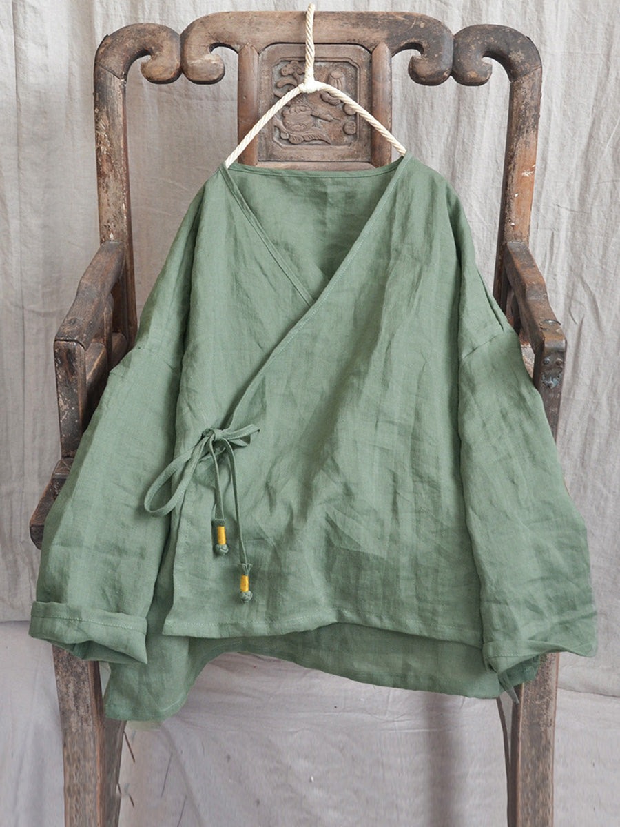Dámská Vintage podzimní volná plátěná halenka s výstřihem do V