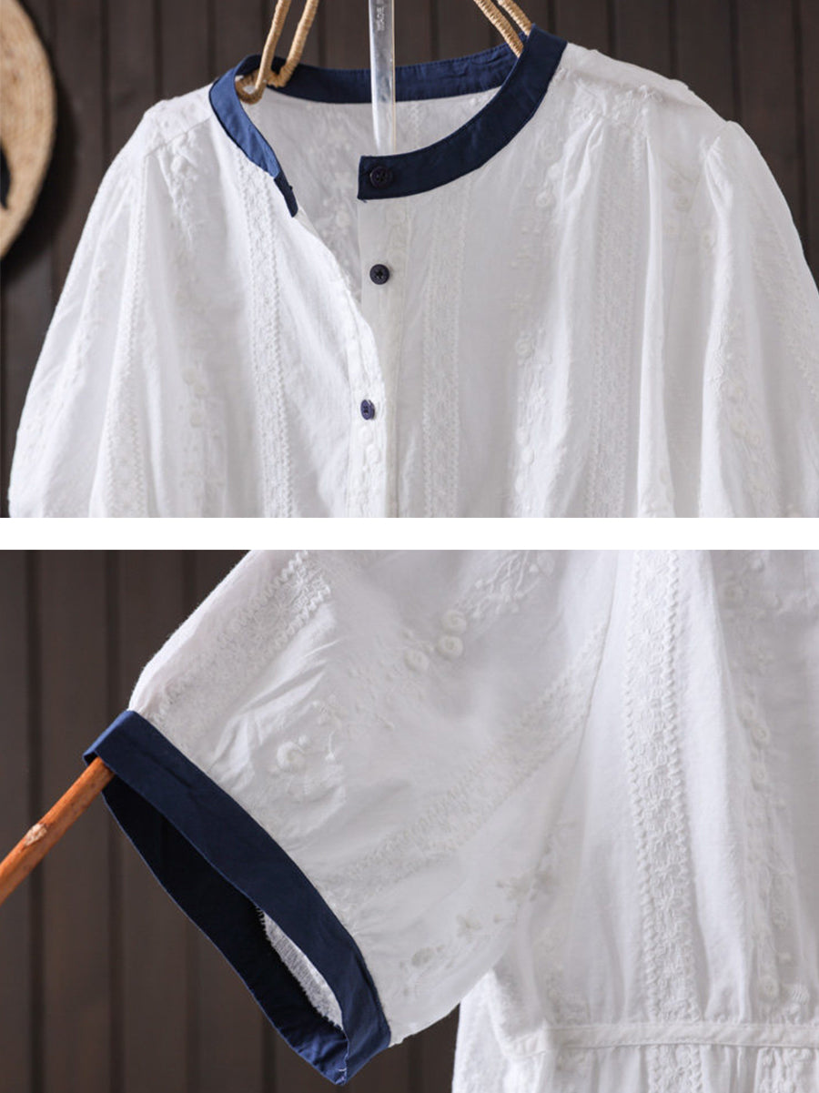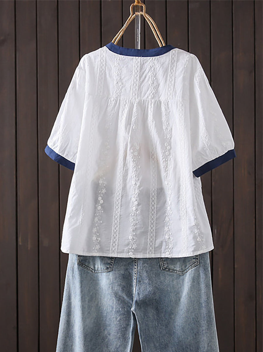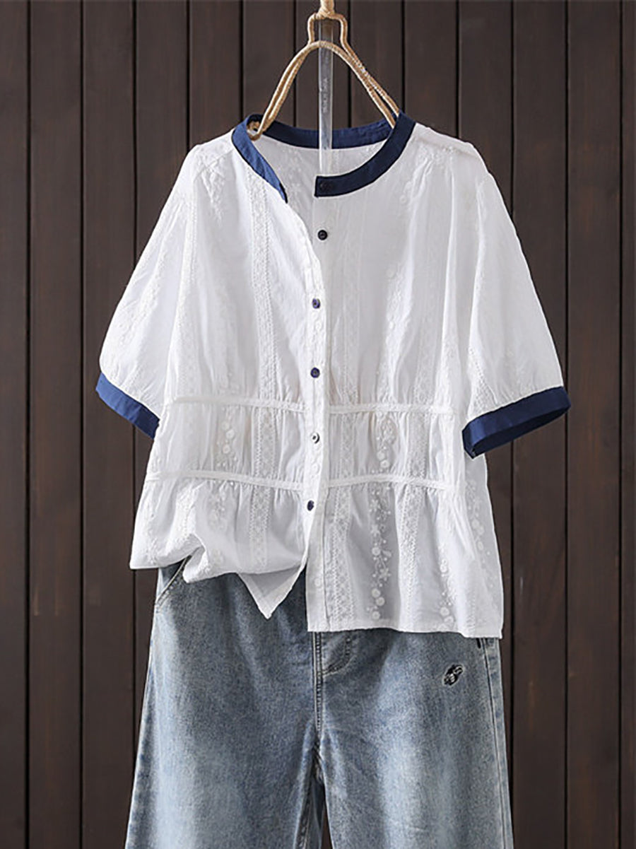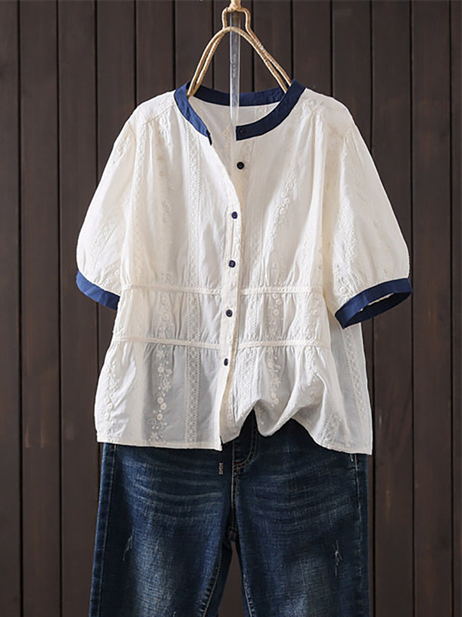 Dámské letní umělecké vyšívané barevné bloky s O-krkem