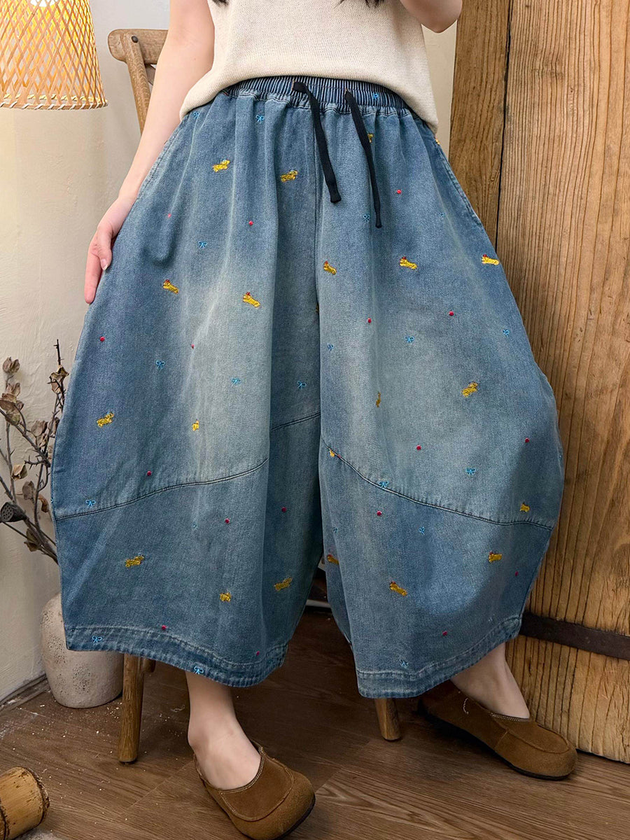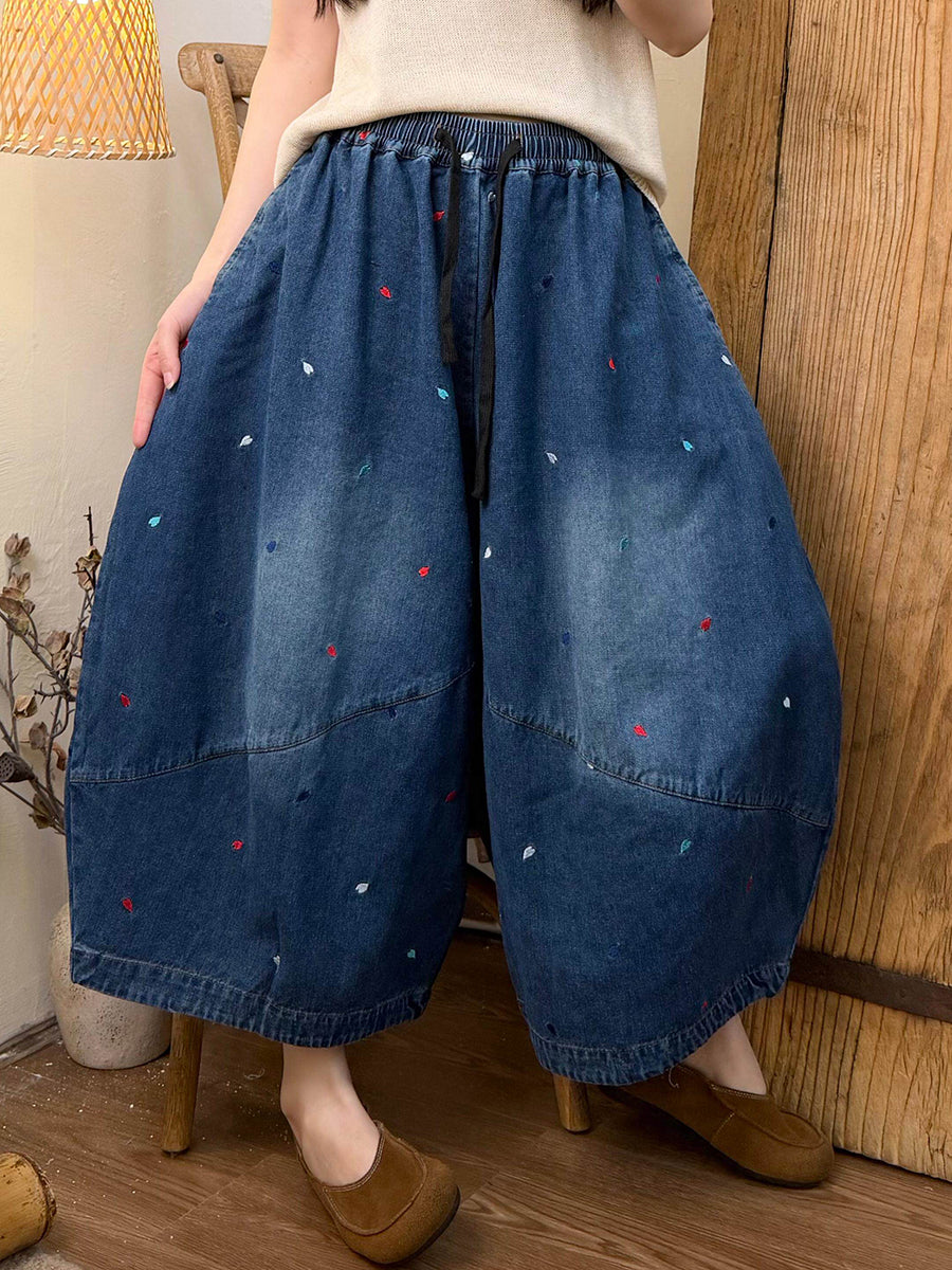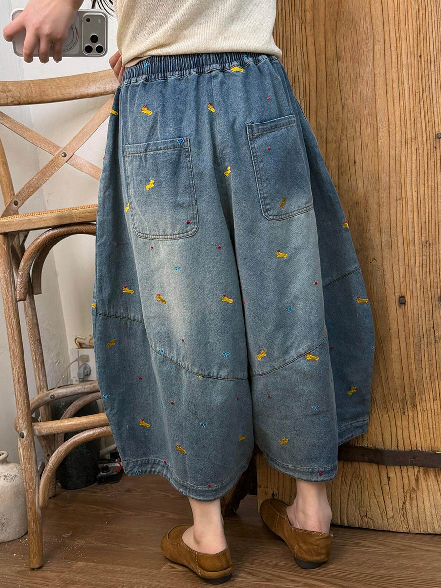 Dámské jarní vintage výšivkové džínové kalhoty s širokými nohavicemi
