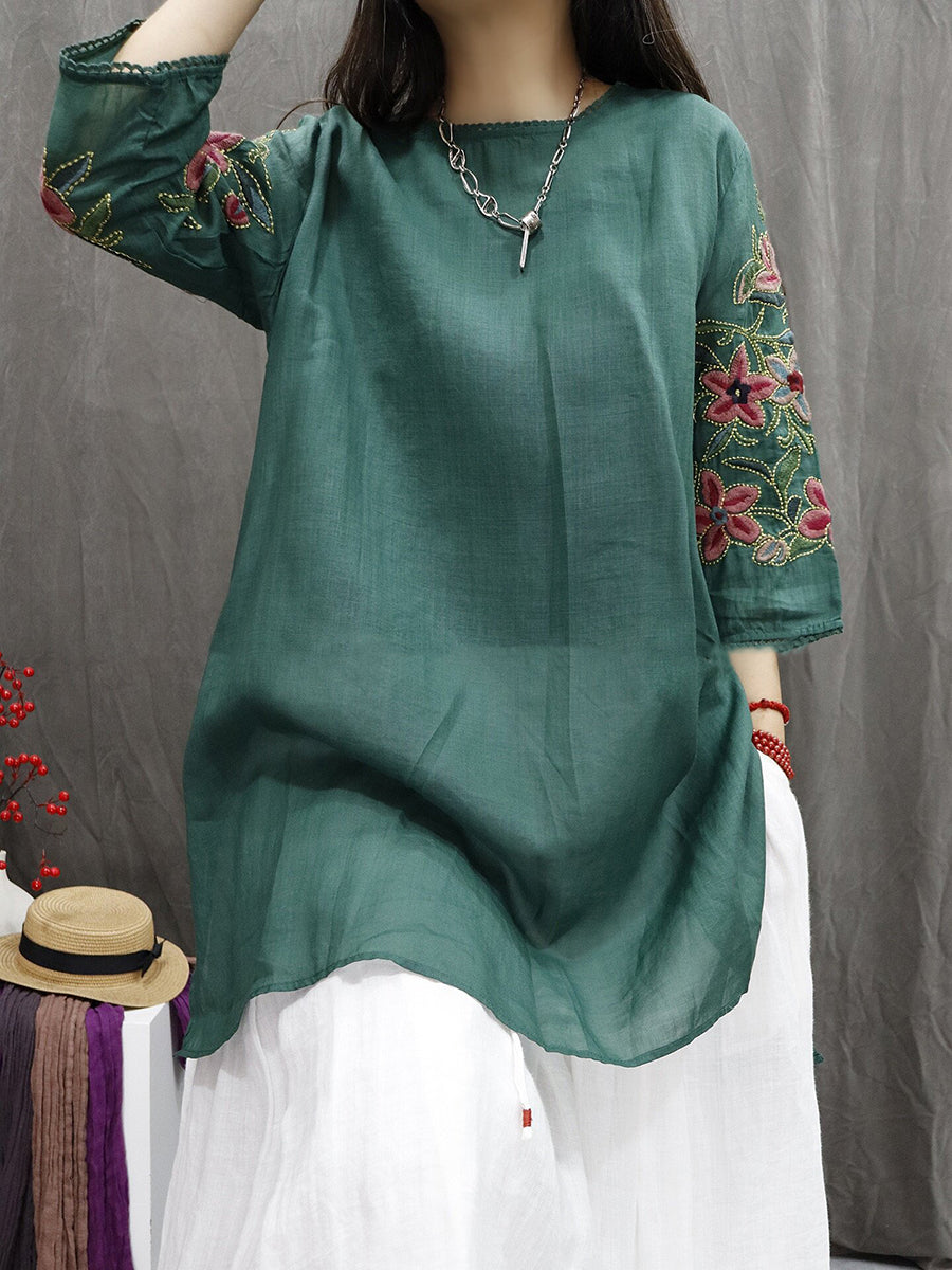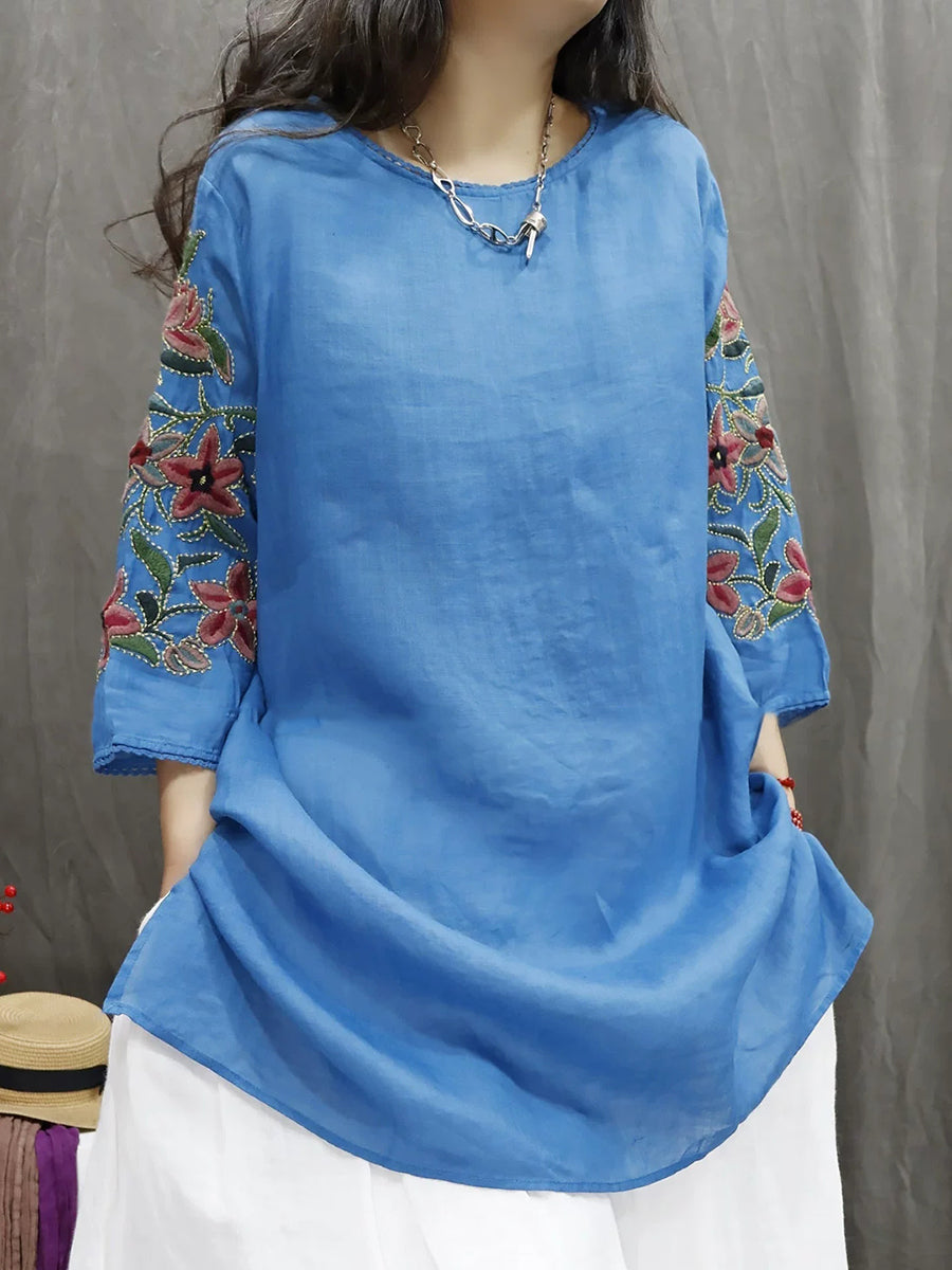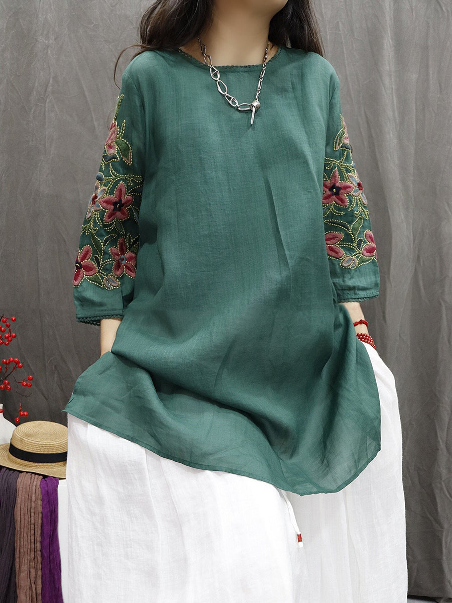 Dámská umělecká výšivka s květinovým výstřihem do O-krku, 100% ramie halenka