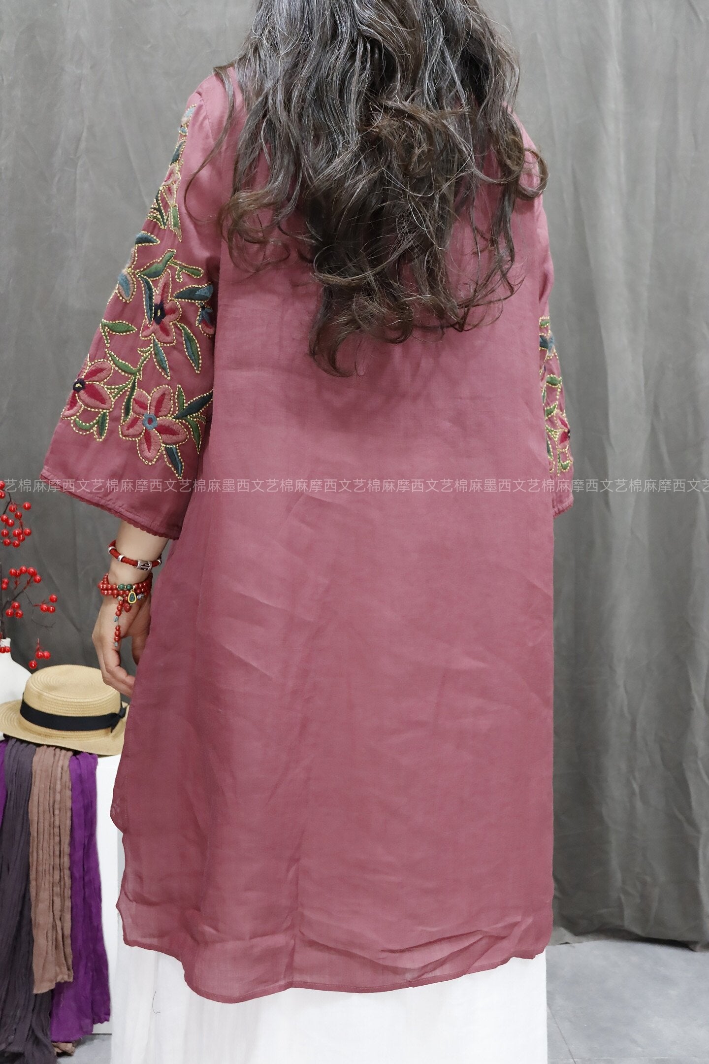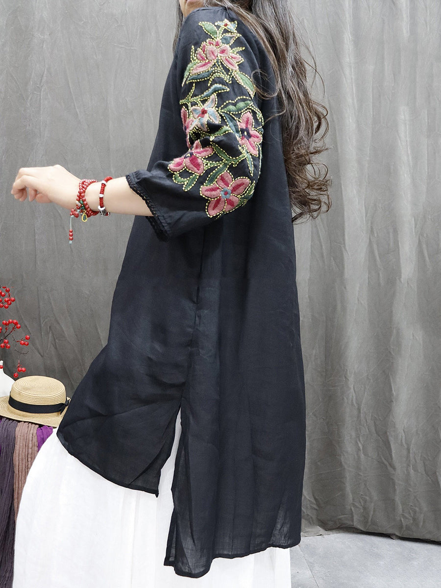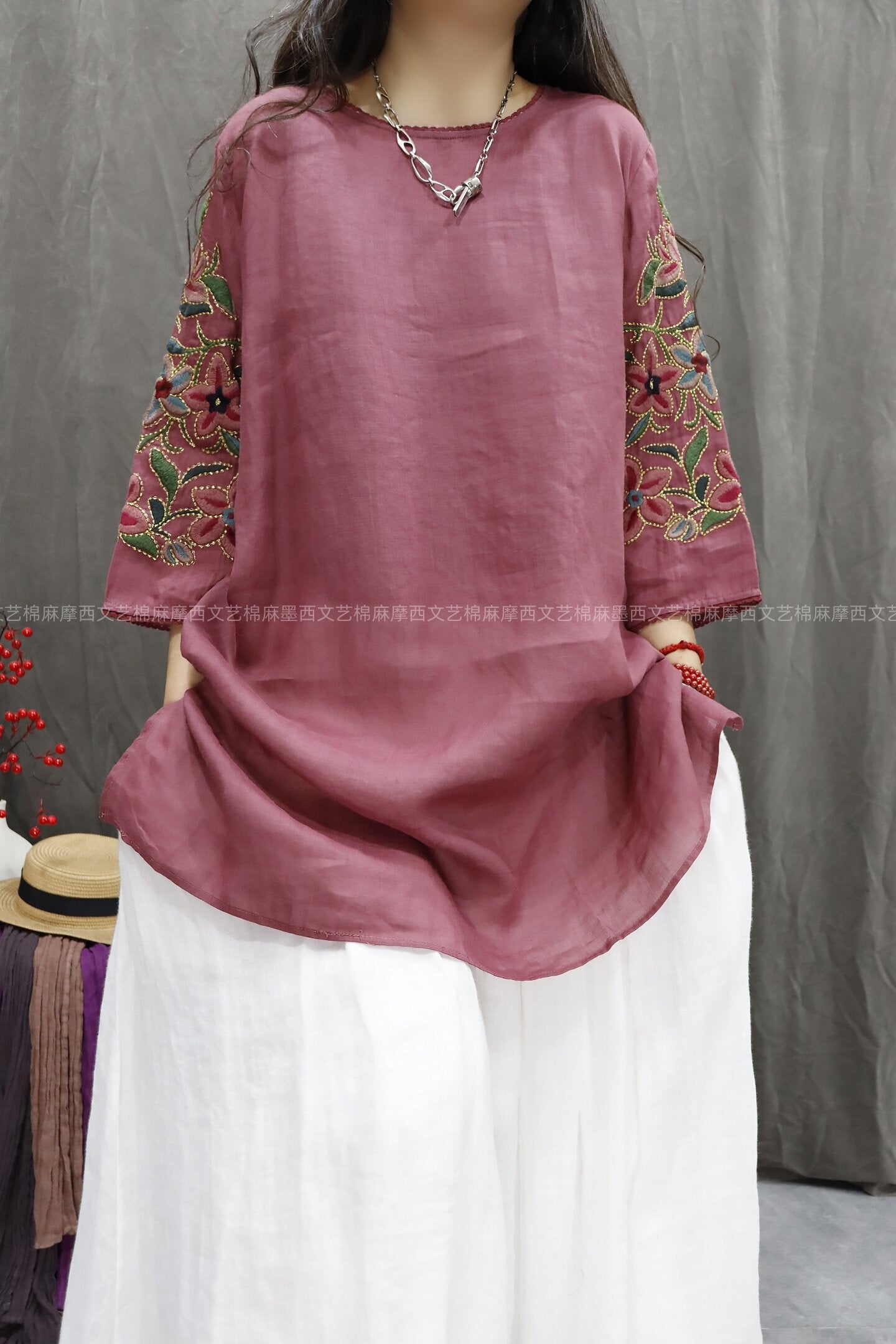 Dámská umělecká výšivka s květinovým výstřihem do O-krku, 100% ramie halenka