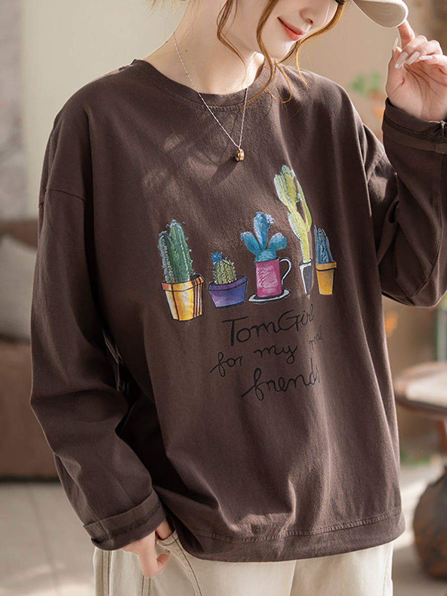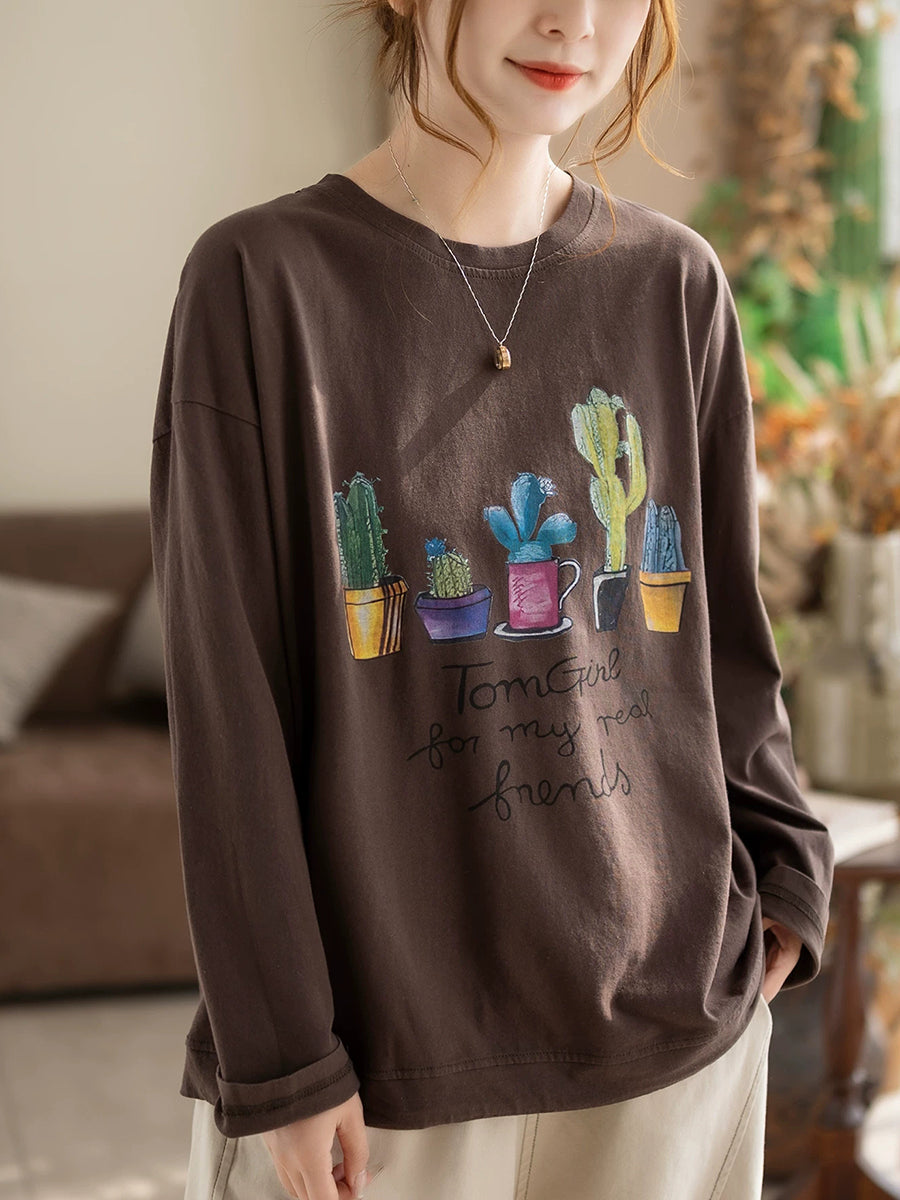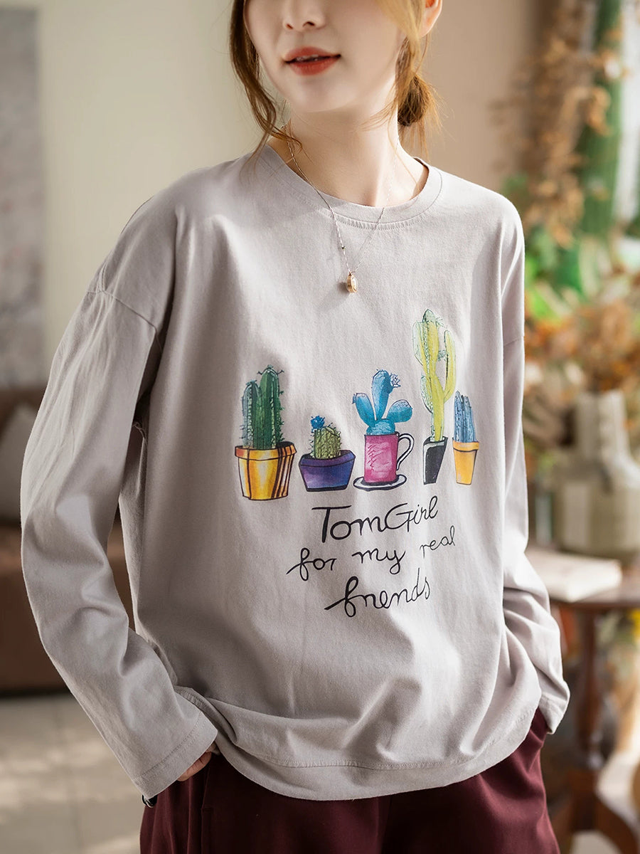 Dámská jarní bavlněná halenka s výstřihem do O-neck s uměleckými rostlinami