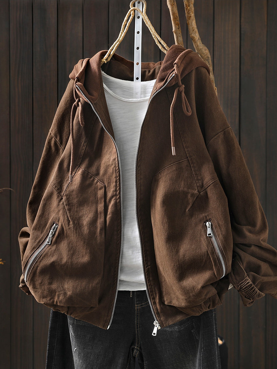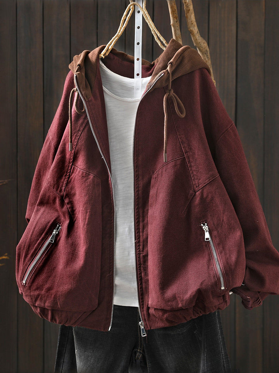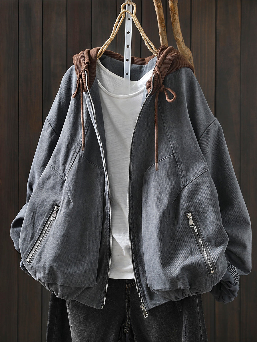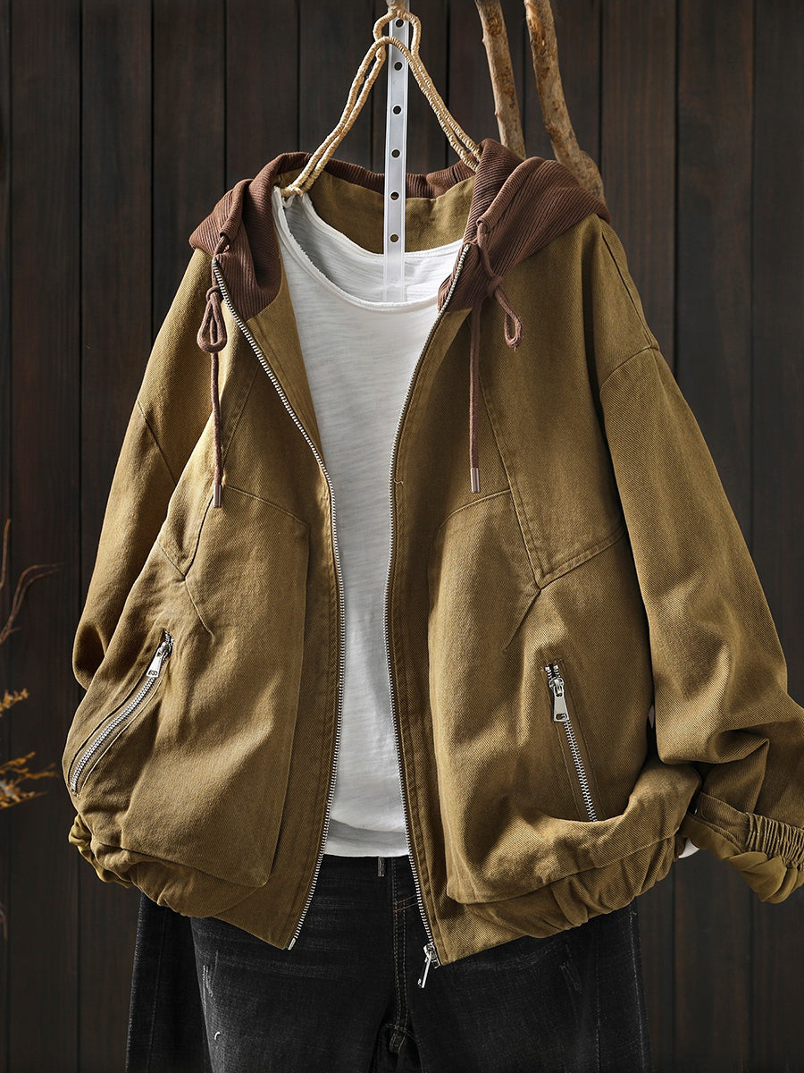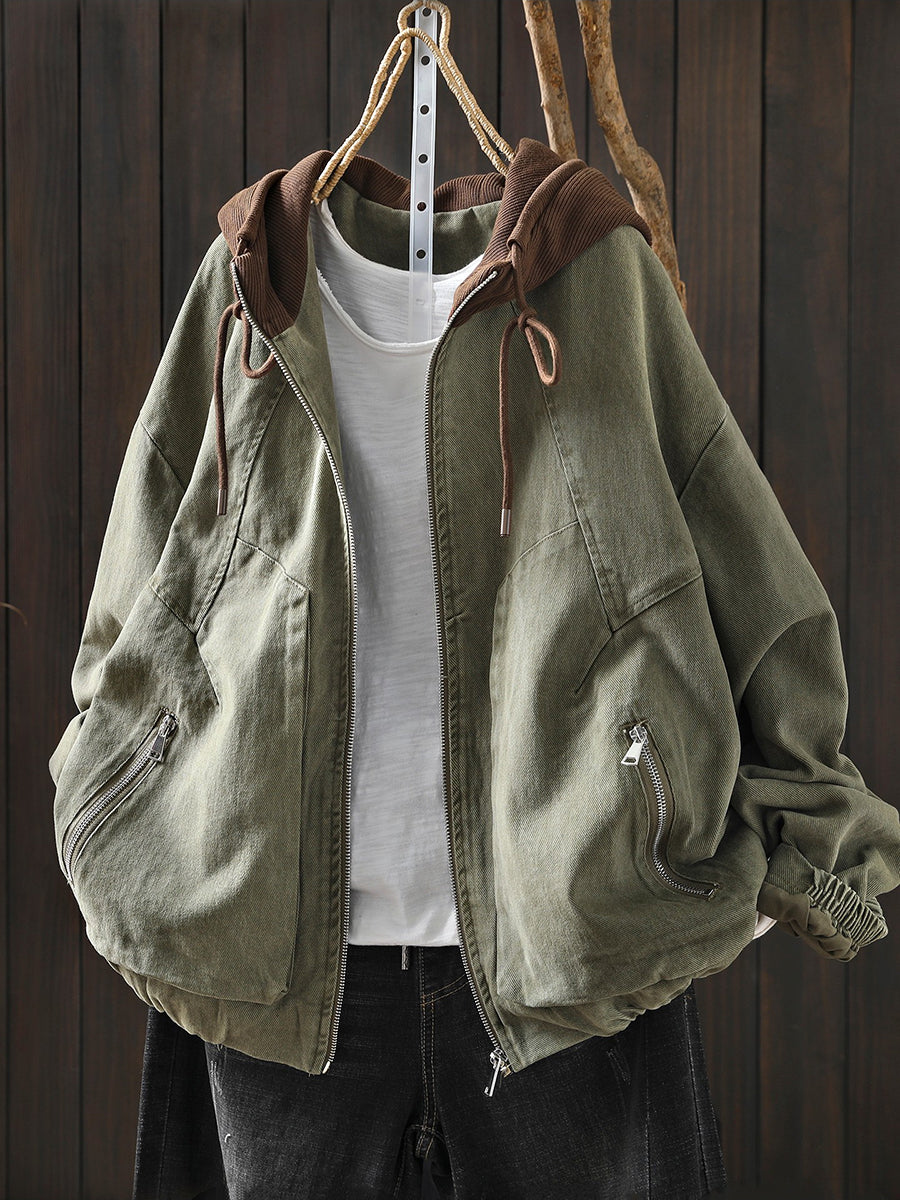 Dámská jarní retro bavlněná bunda s kapucí v barevných blokech