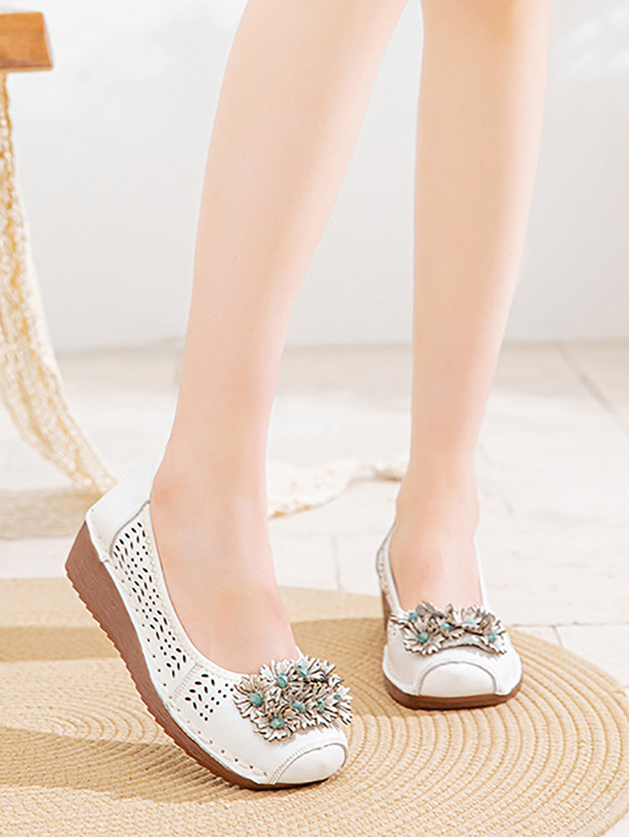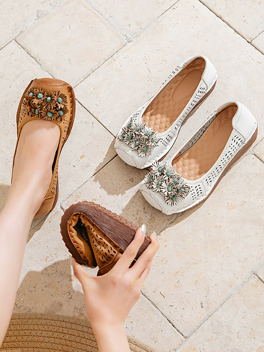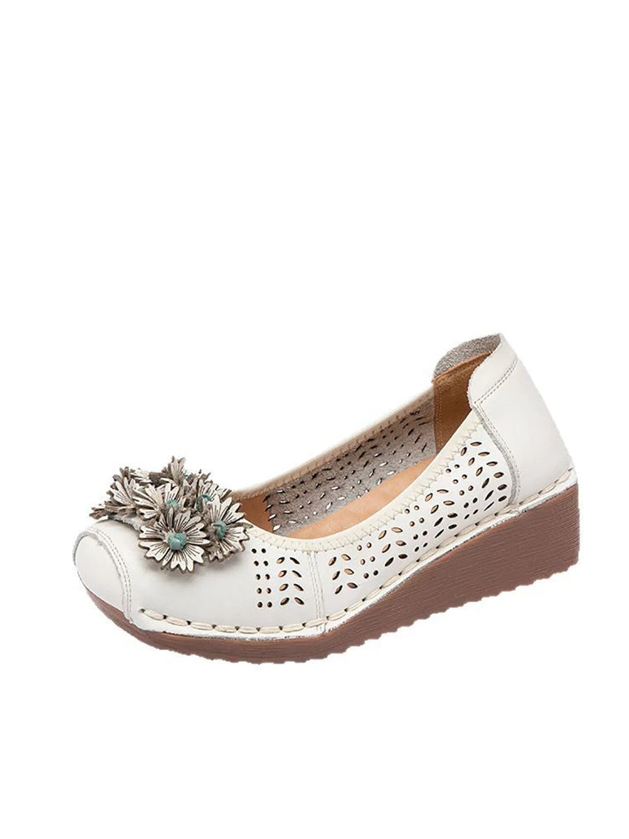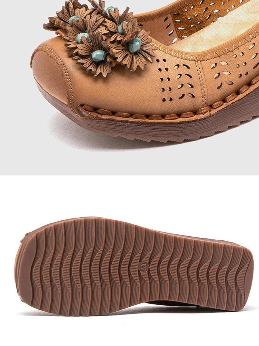 Dámské letní vintage kožené boty s dírkou a květinovým vzorem na středním podpatku