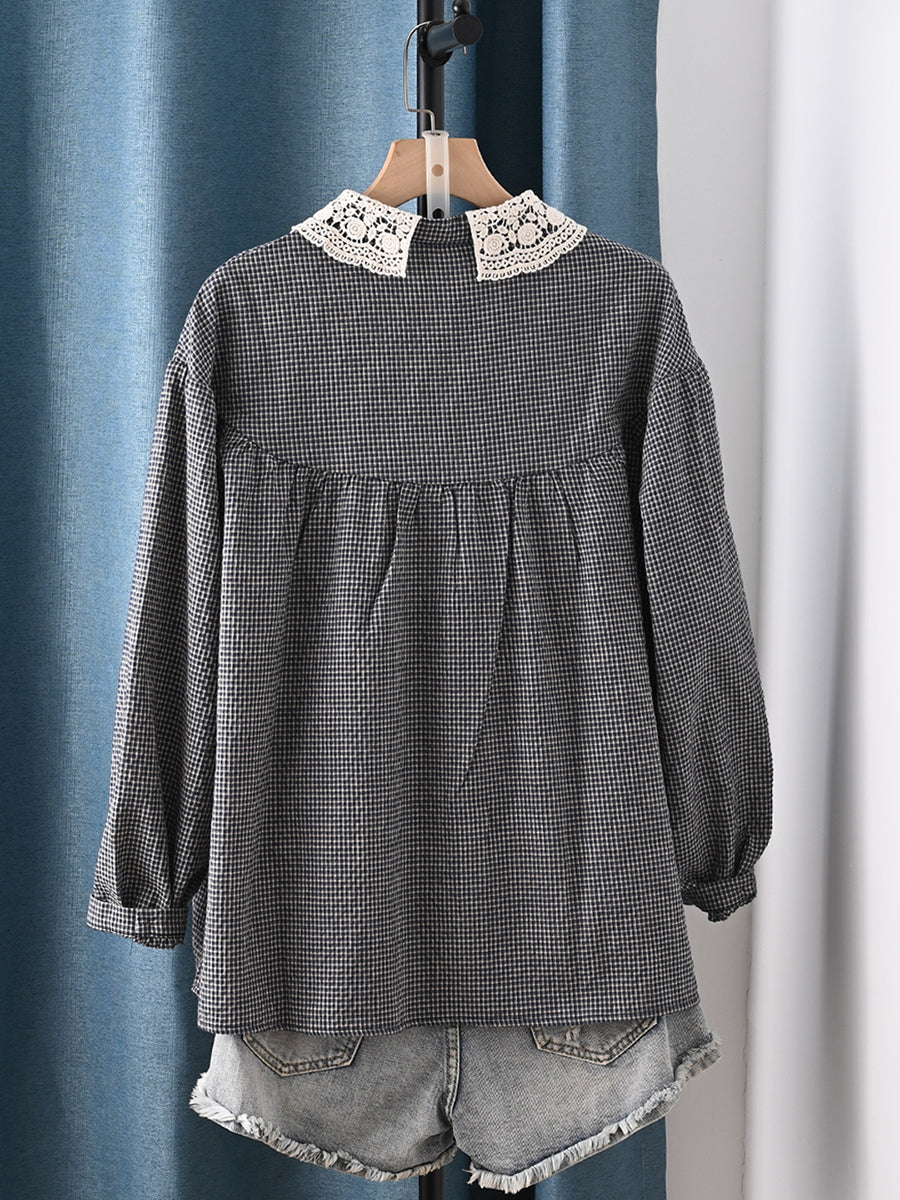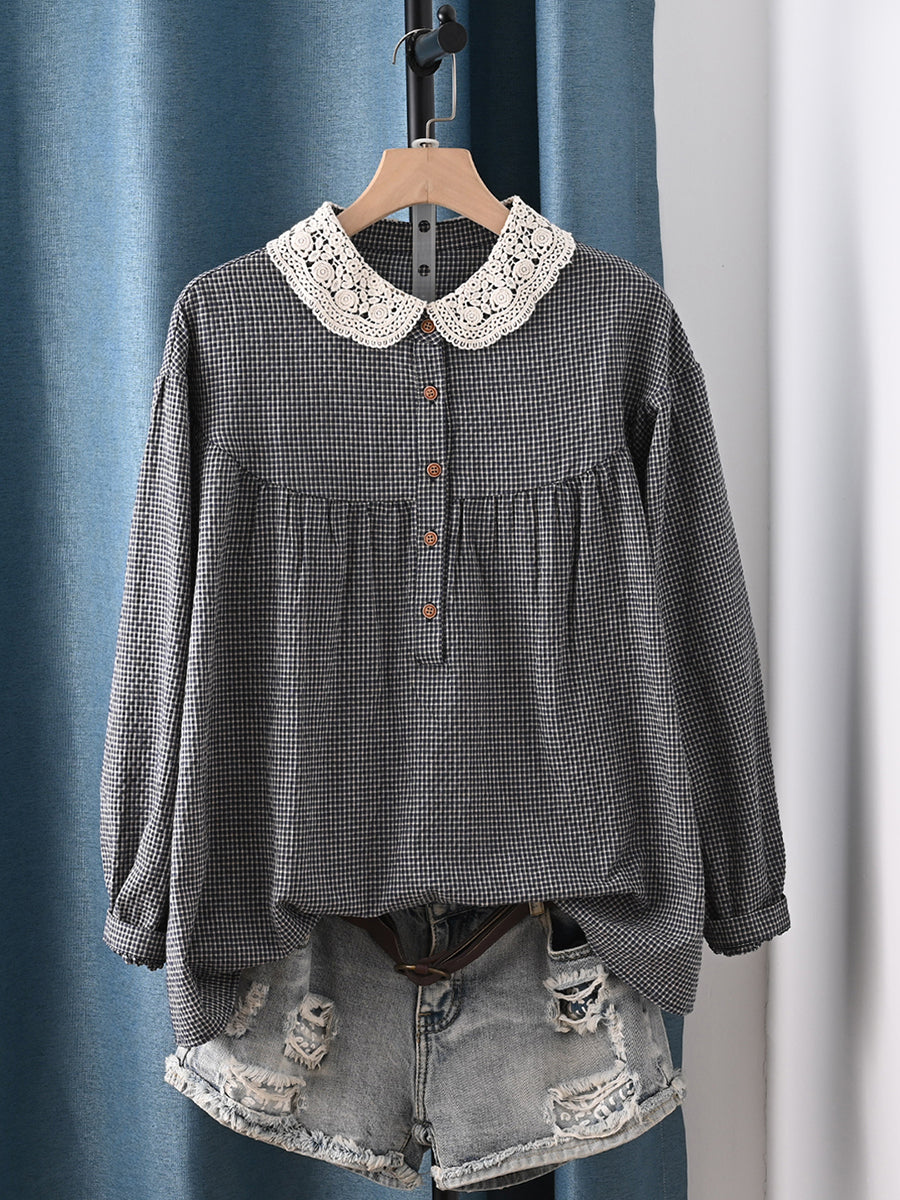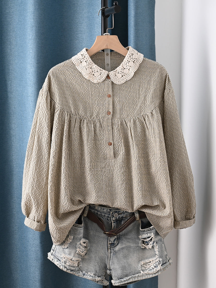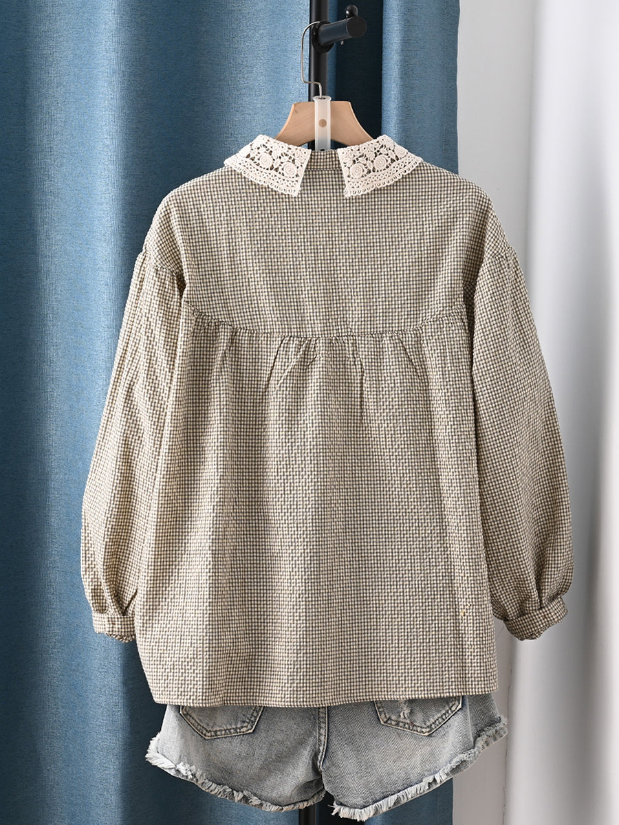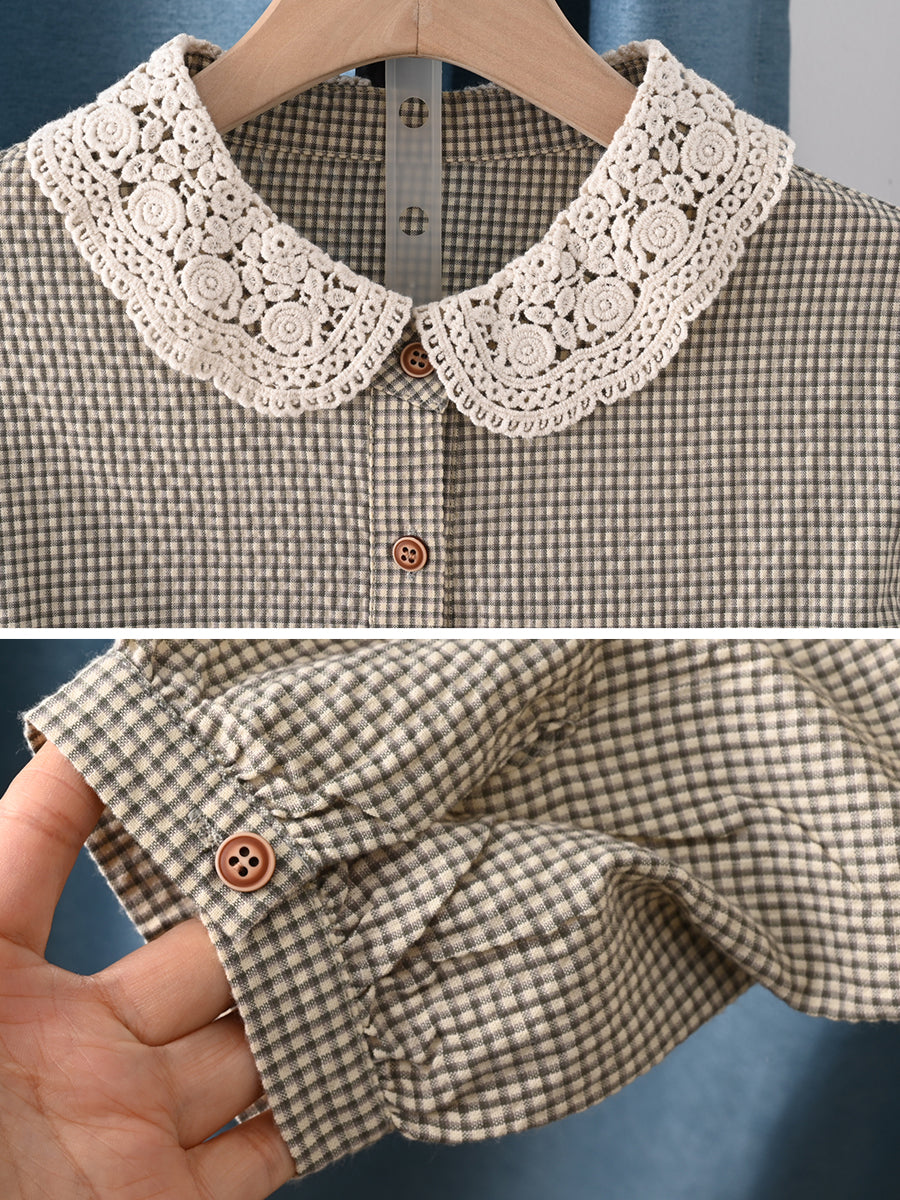 Dámská umělecká kostkovaná košile ze 100% bavlny s krajkovým límcem