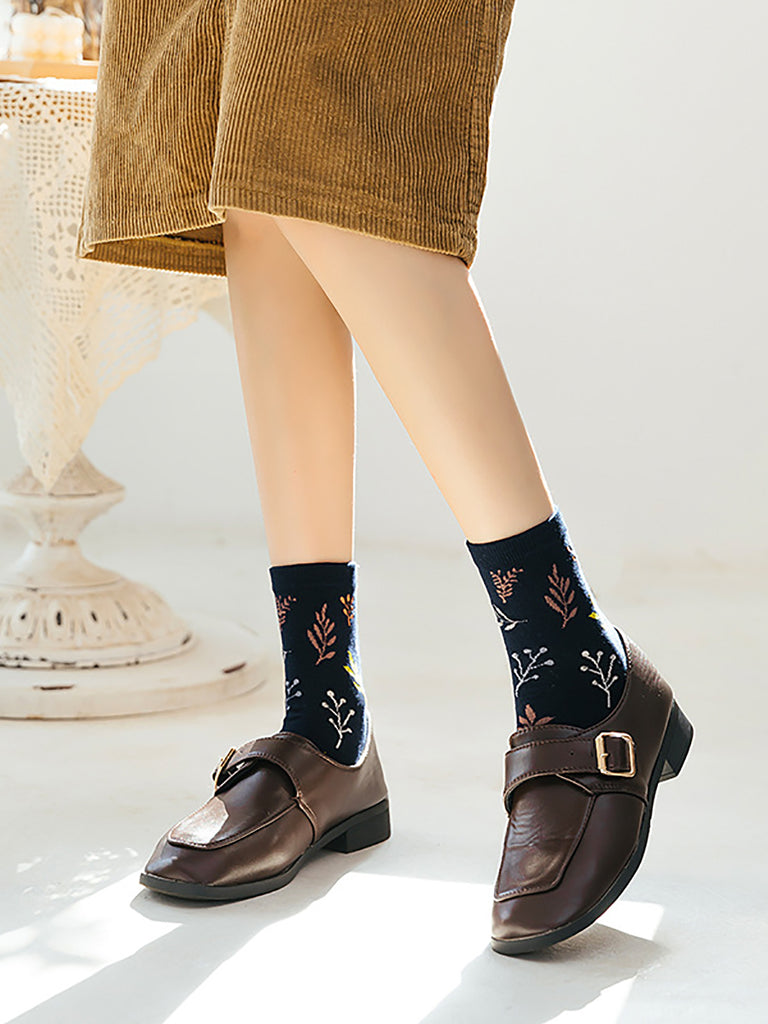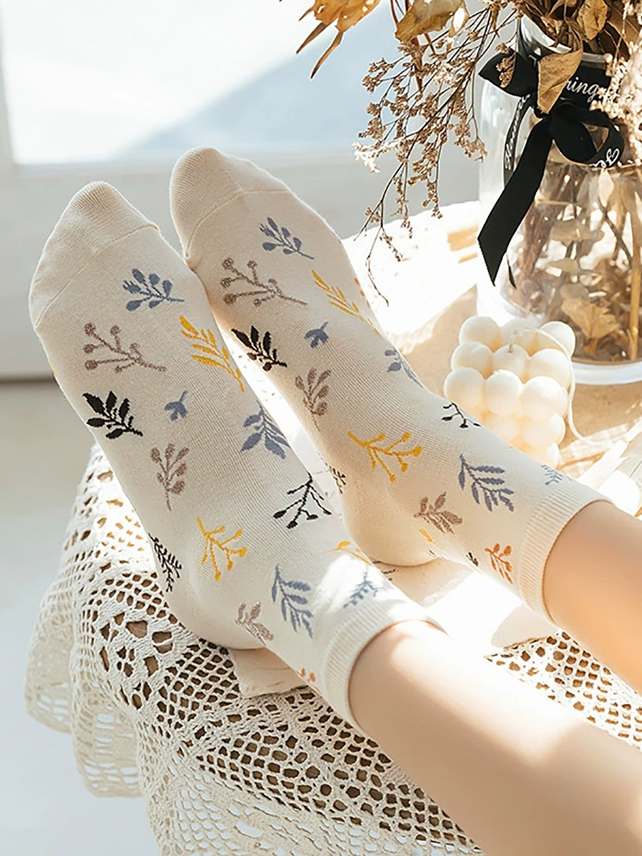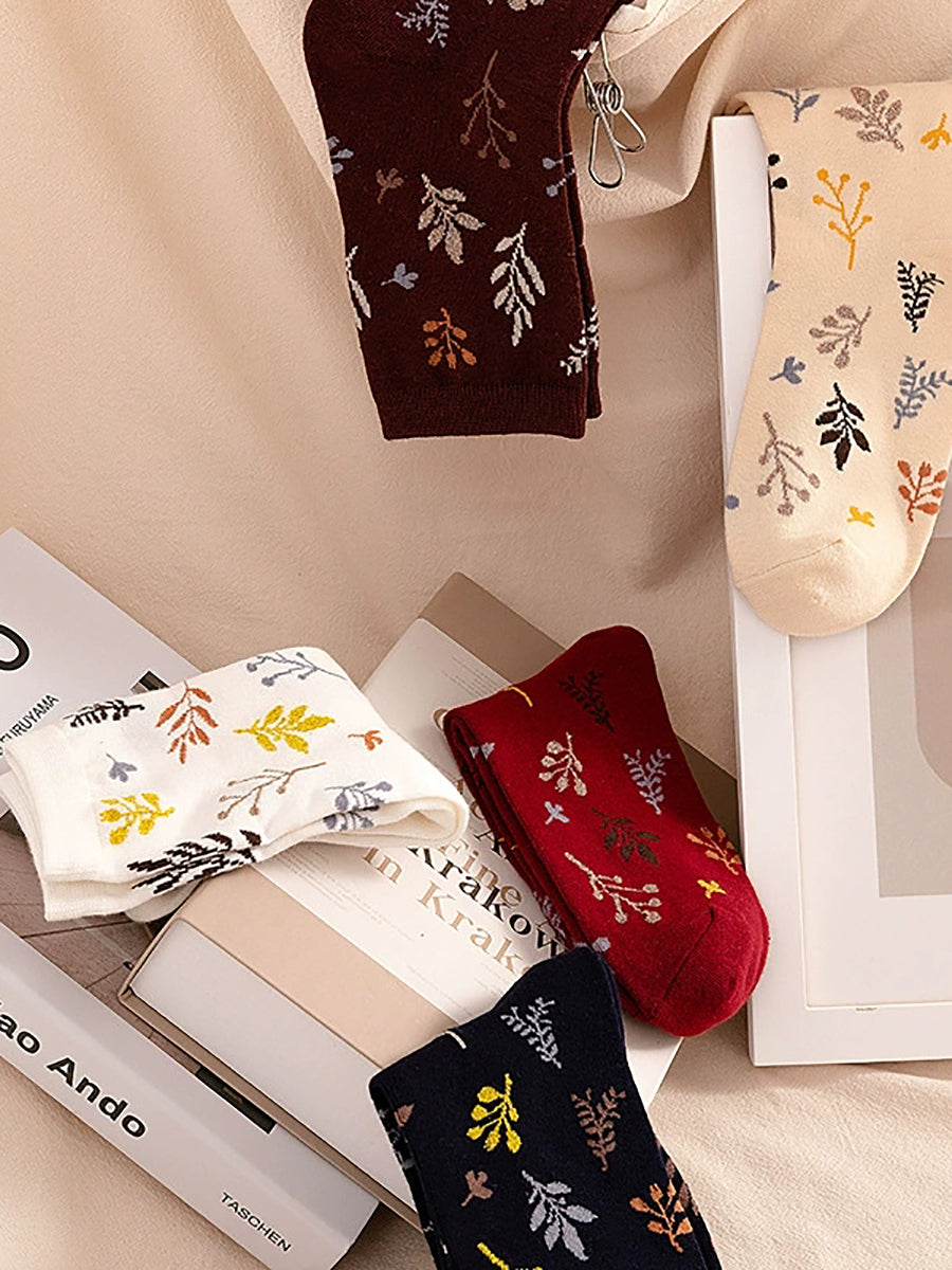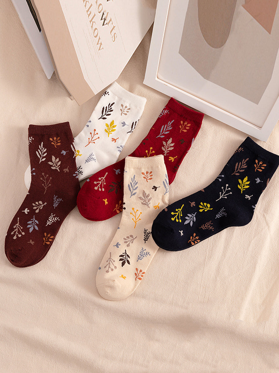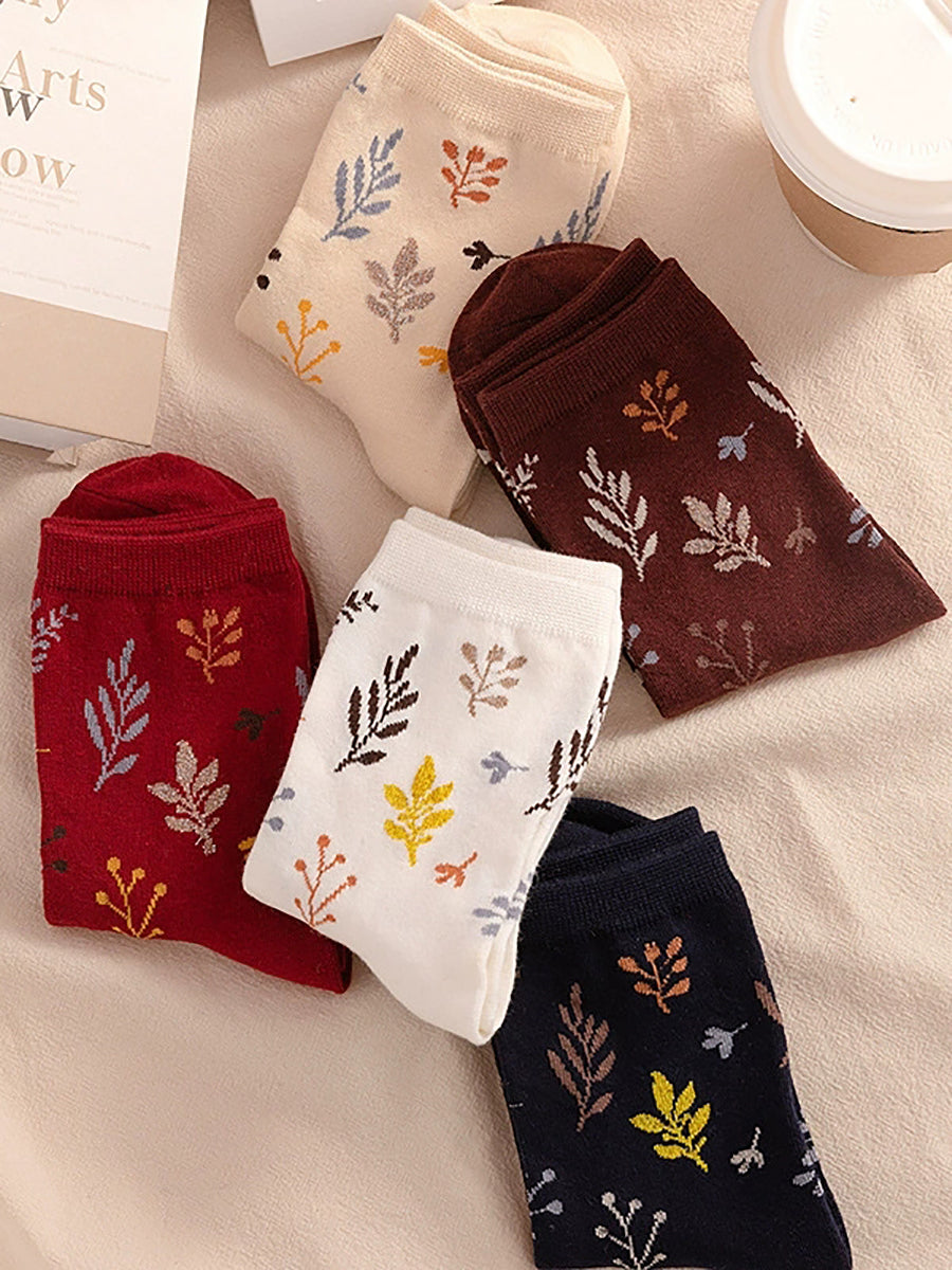 5 párů dámských bavlněných ponožek s uměleckým vintage motivem listů