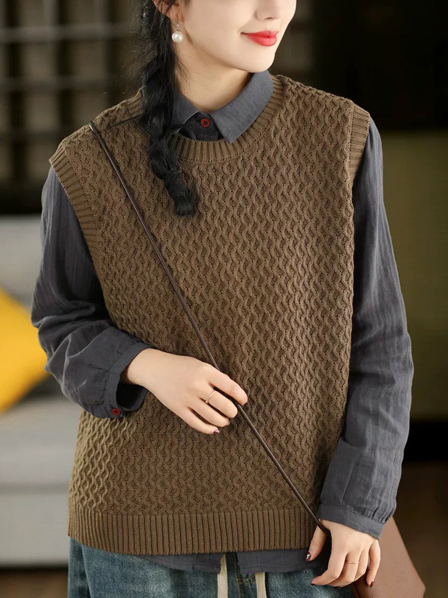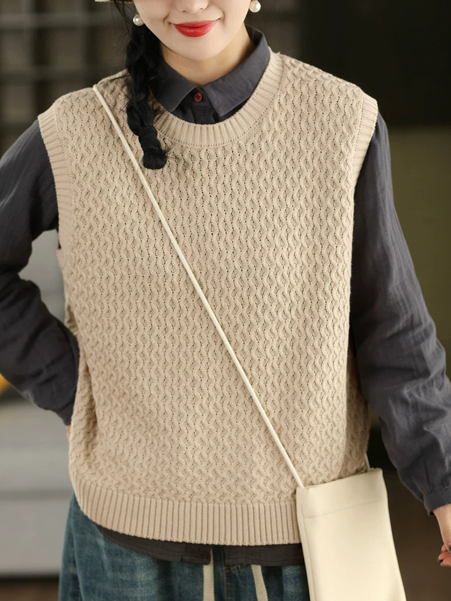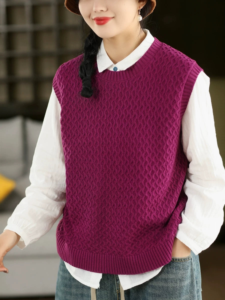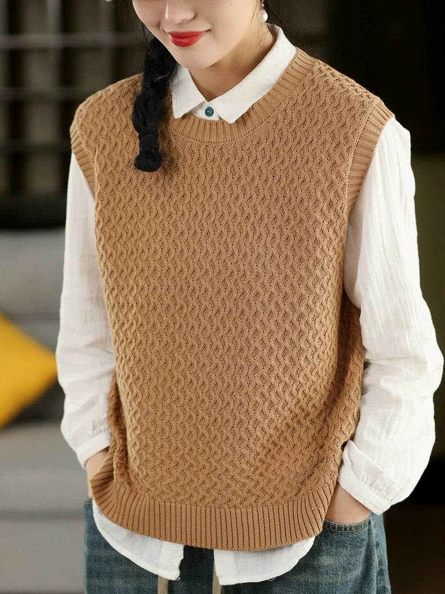 Dámská jarní umělecká pletená vesta s výstřihem do O-neck v čistých barvách