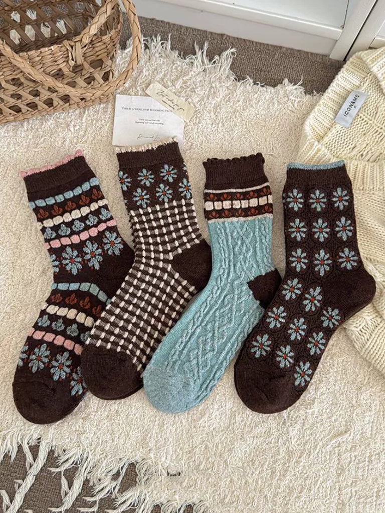 4 Pairs Women Winter Vintage Flower Plaid Socks