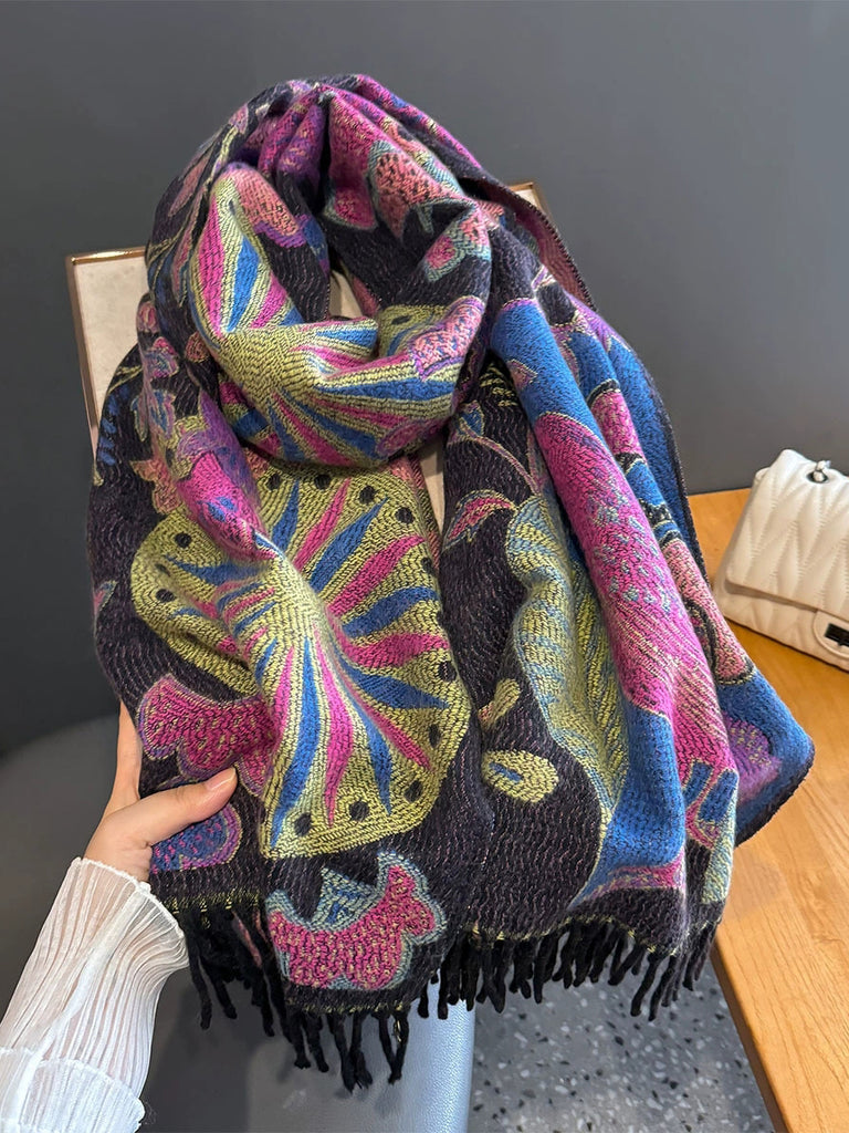 Women Ethnic Flower Winter Tassel Shawl Scarf