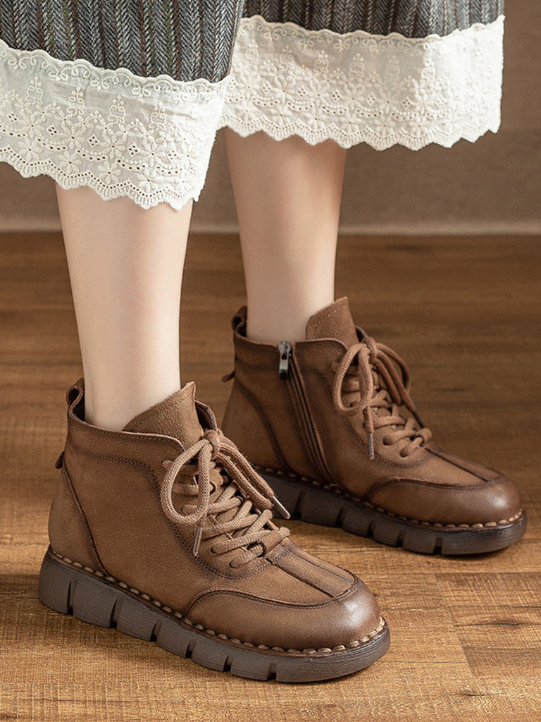 Women Vintage Pure Color Leather Flat Ankle Boots