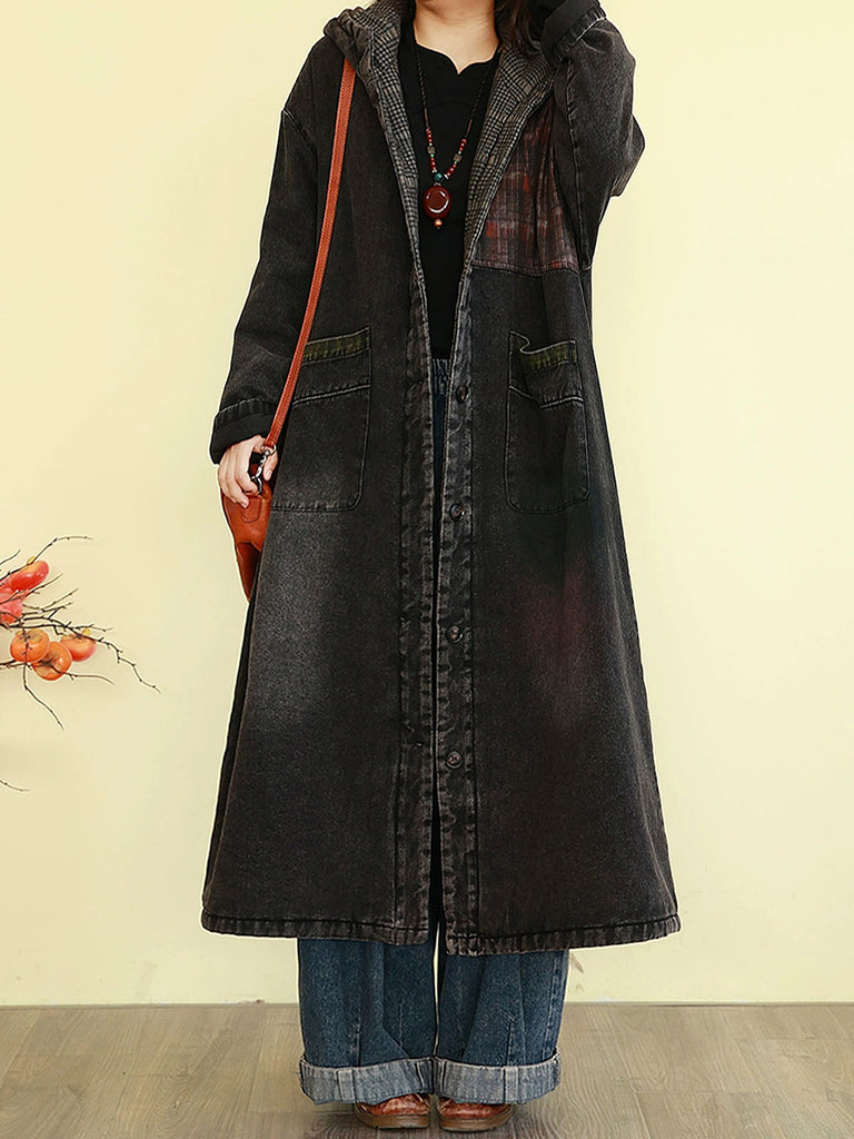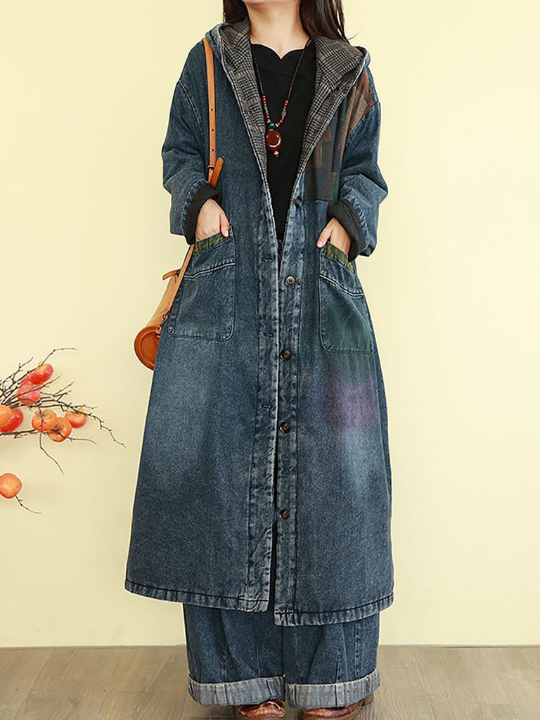 Women Vintage Denim Spliced Padded Hooded Long Coat