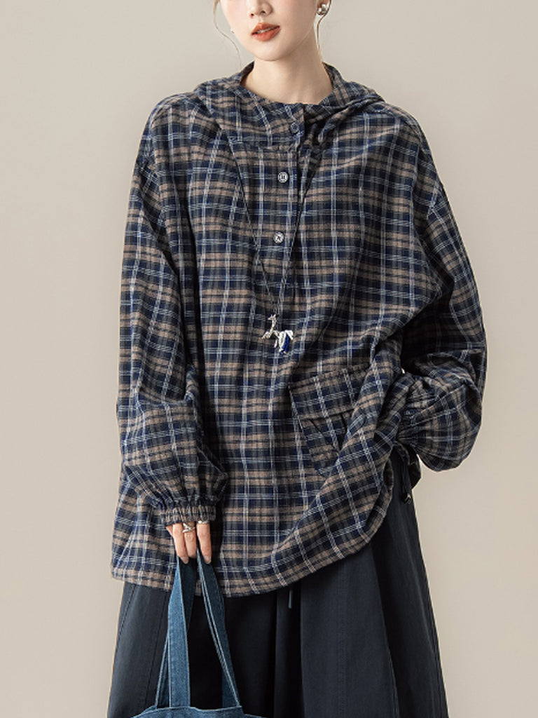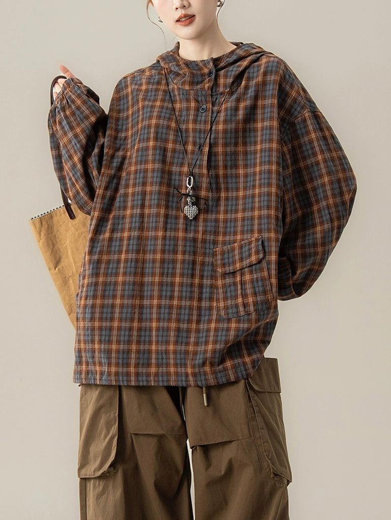 Women Autumn Plaid Hooded Loose Blouse