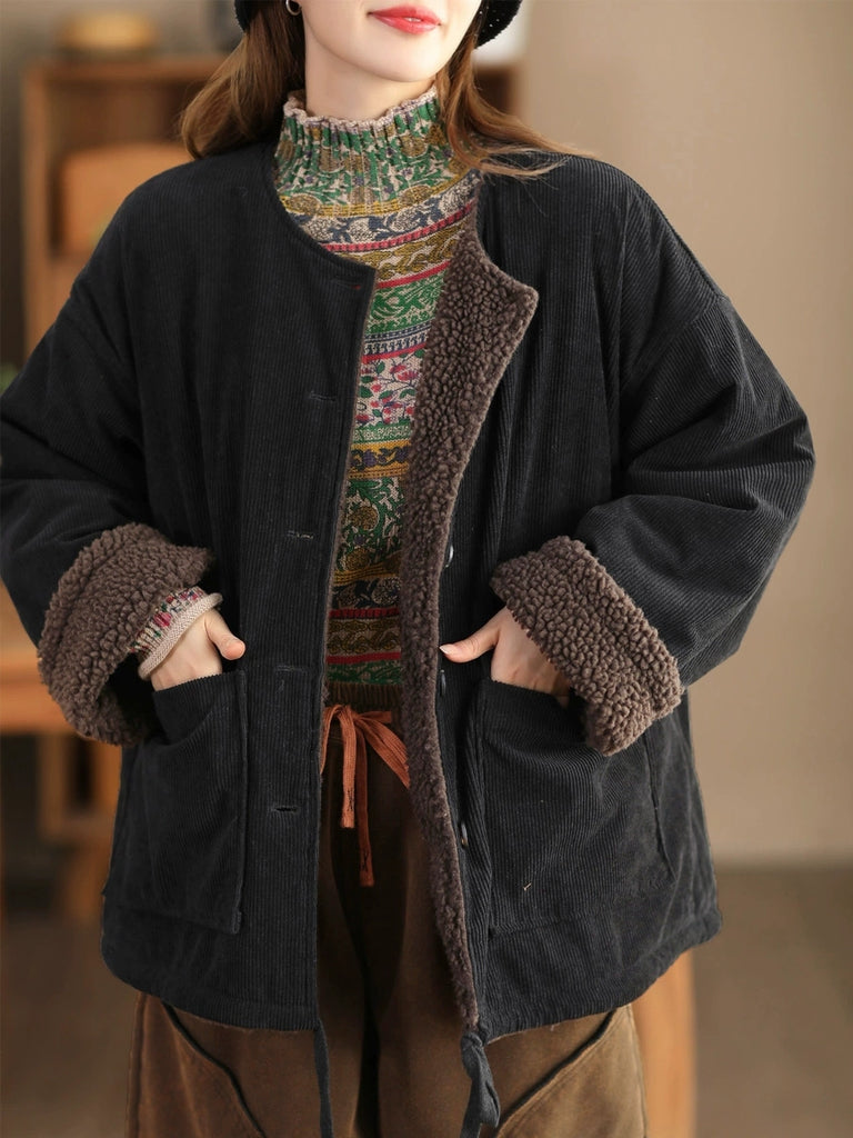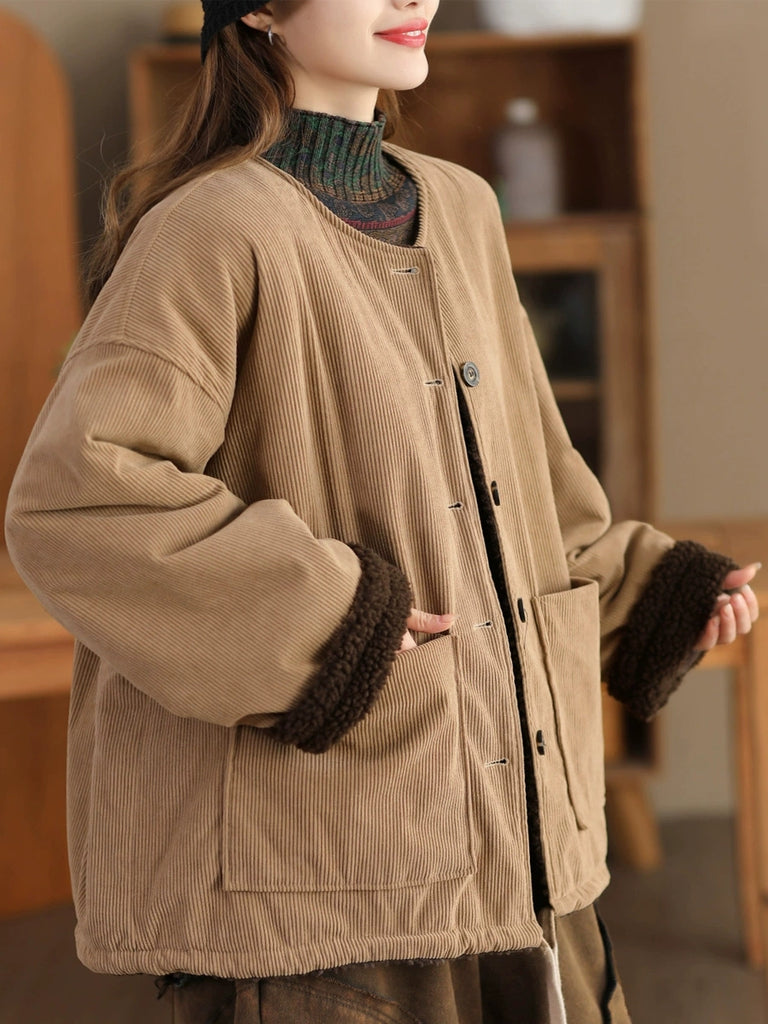 Women Vintage Winter O-Neck Fleece-lined Jacket
