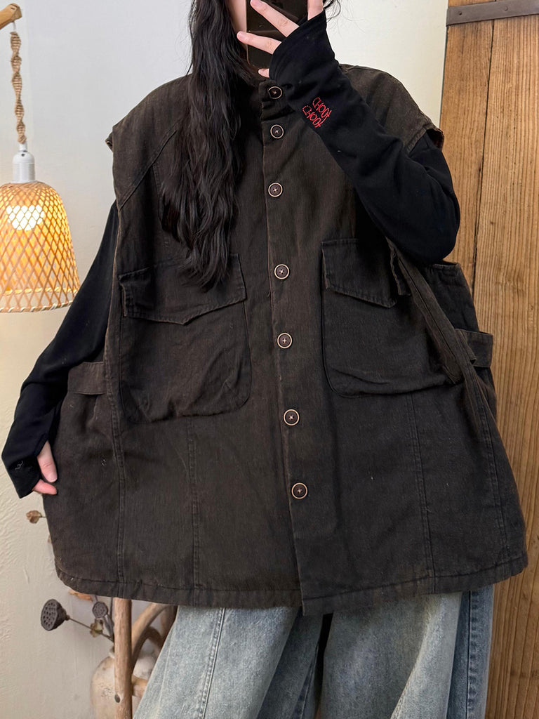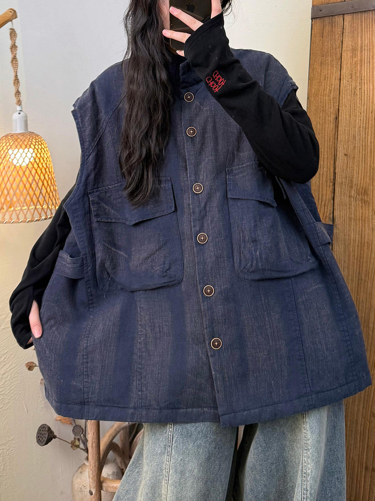 Women Autumn Pure Color Stand Collar Linen Padded Vest