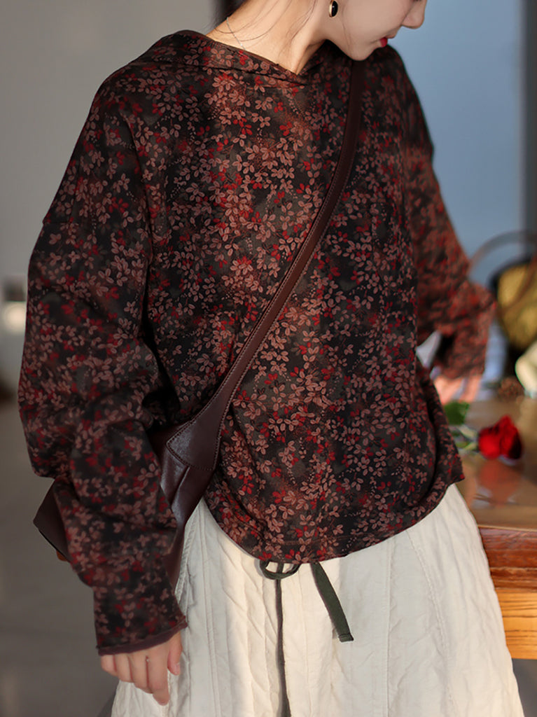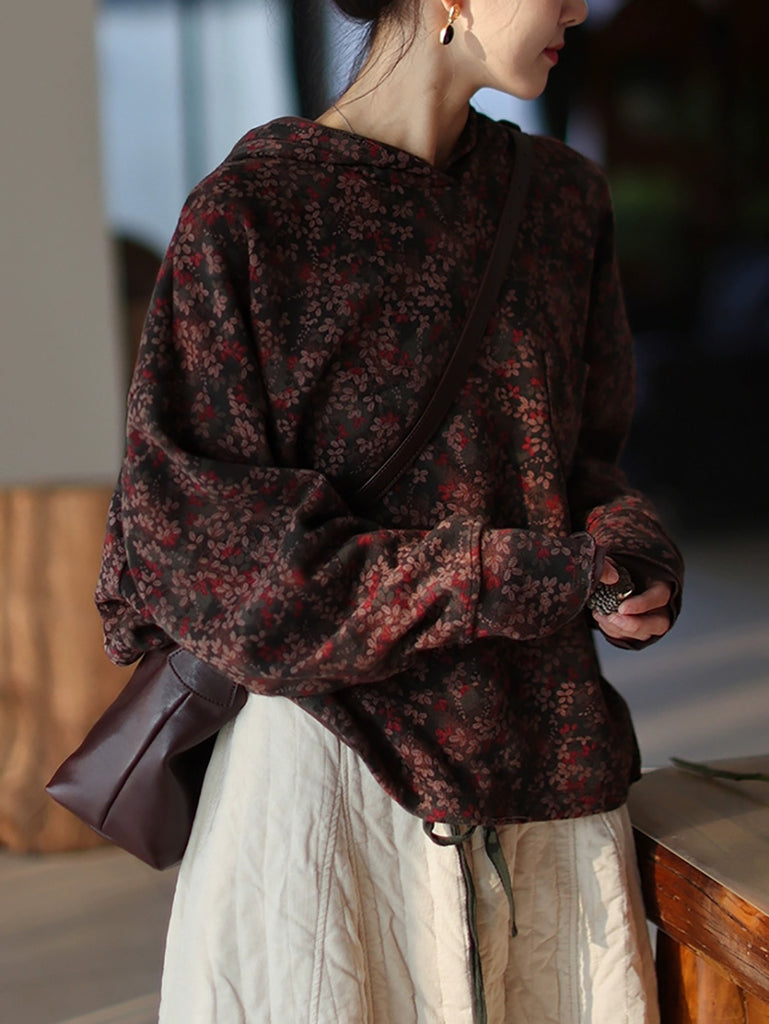 Women Vintage Autumn Flower Fleece-lined Hoodie
