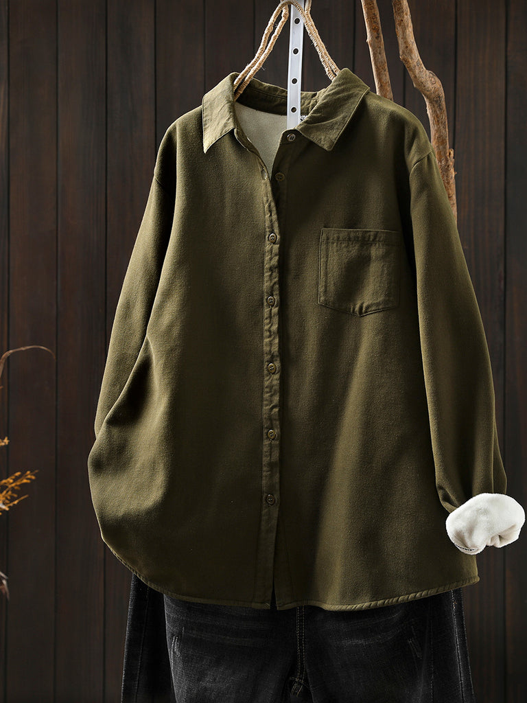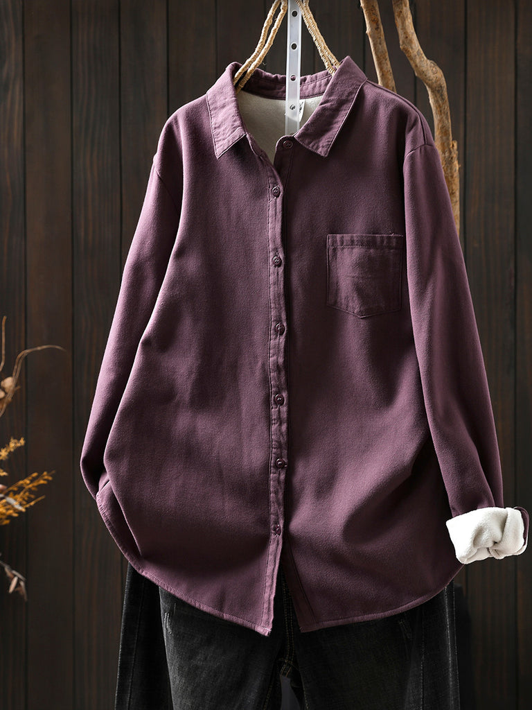 Women Autumn Casual Pure Color Fleece-lined Shirt