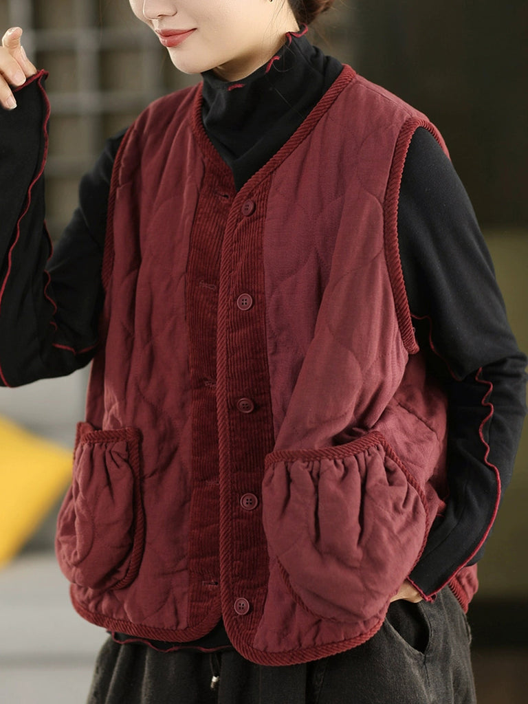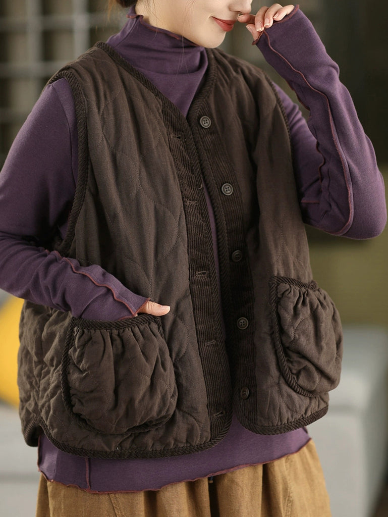 Women Autumn Spliced O-Neck 100%Linen Padded Vest