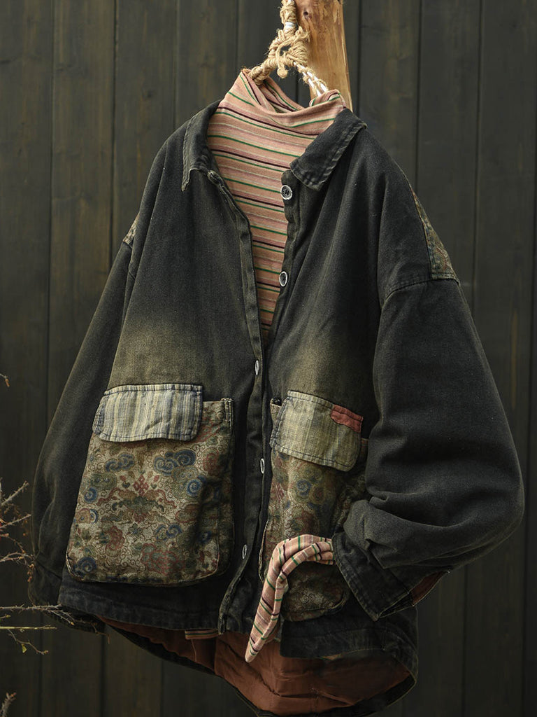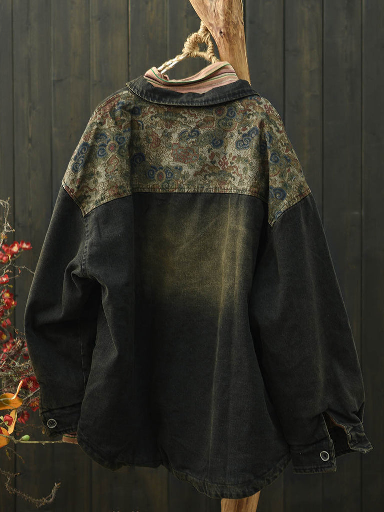 Women Ethnic Flower Denim Spliced Cotton Padded Coat