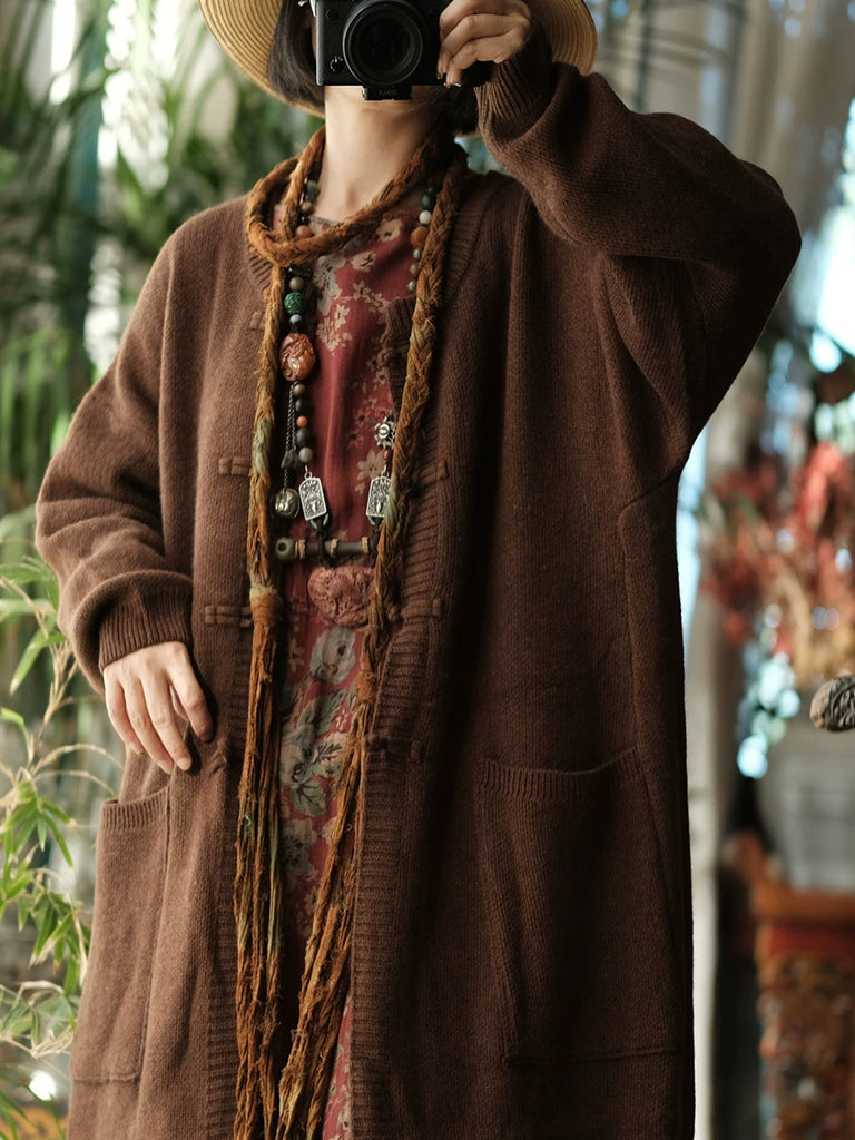 Women Vintage Winter Pure Color O-Neck Wool Knitted Coat