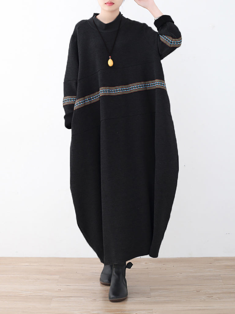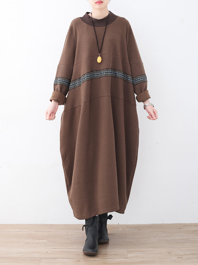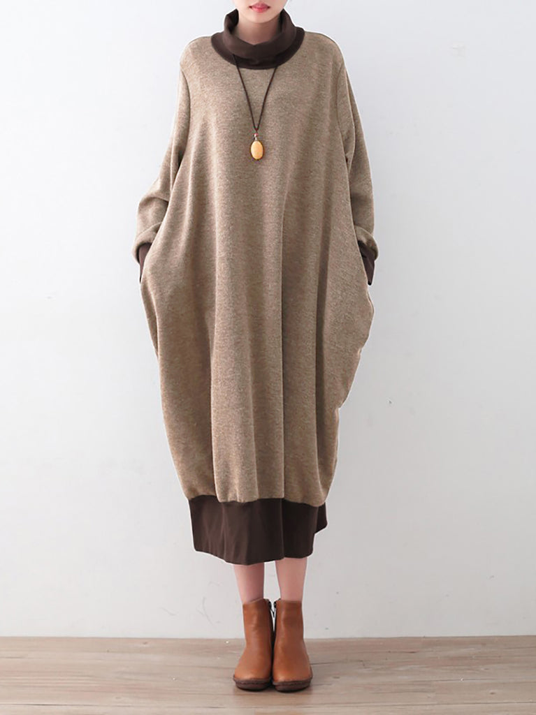 Women Vintage Autumn Colorblock Turtleneck Cotton Dress