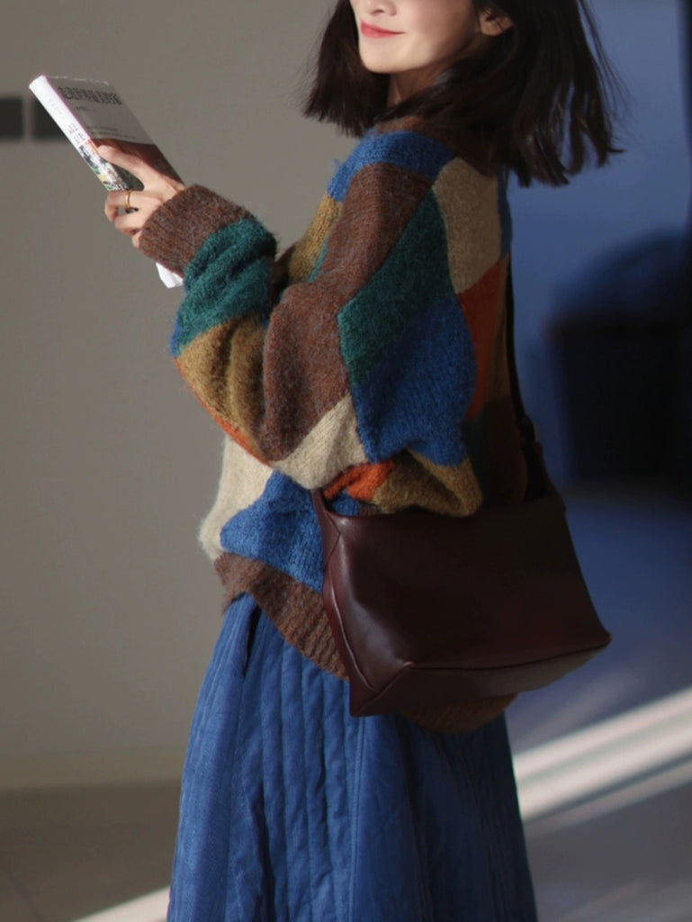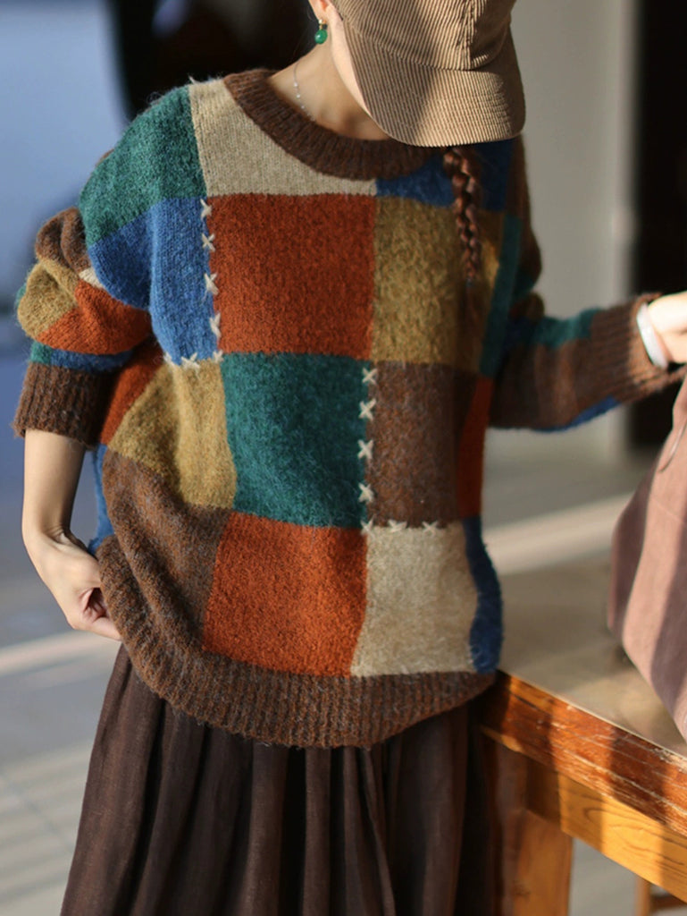 Women Autumn Vintage Colorblock Plaid O-Neck Sweater