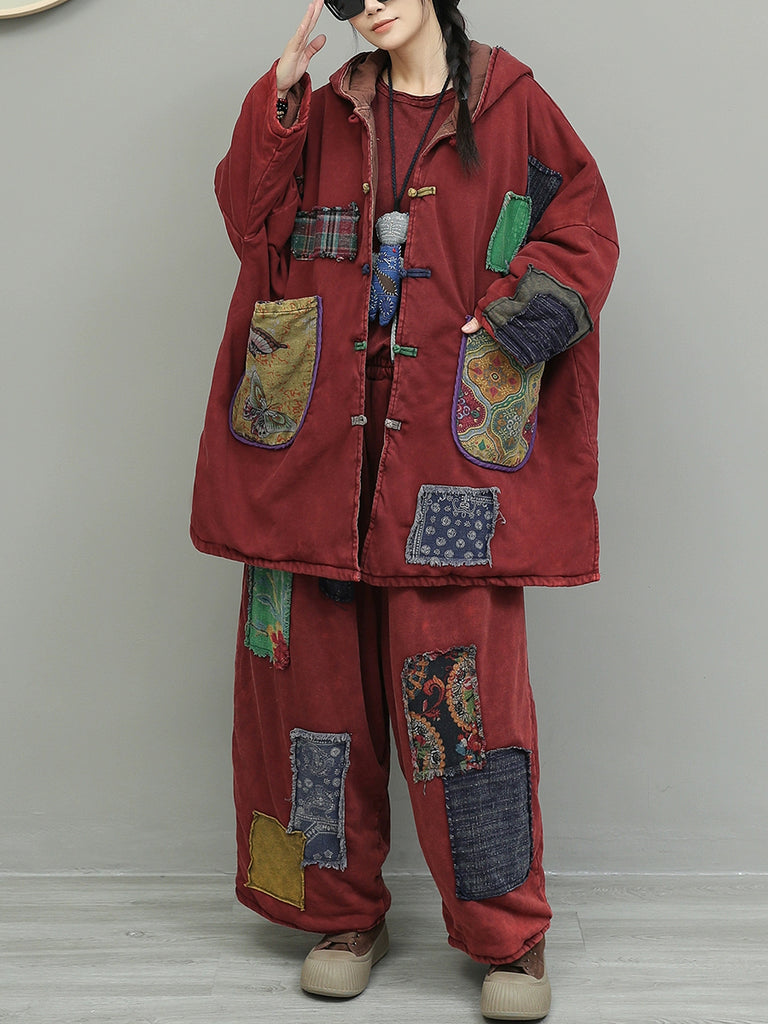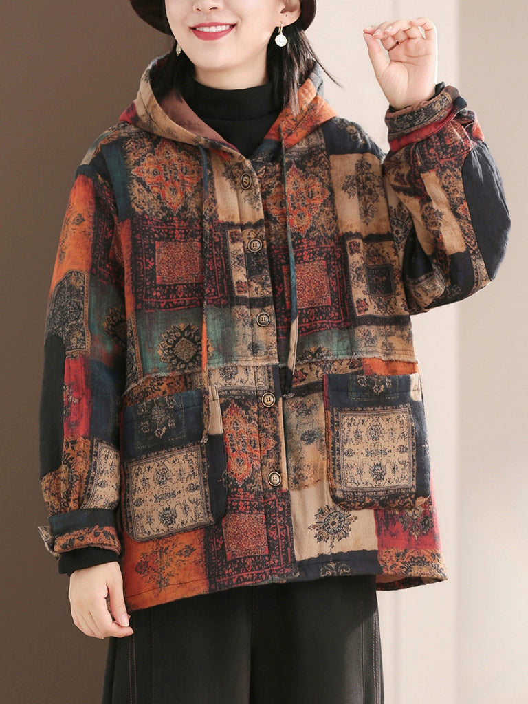 Women Vintage Winter Flower Cotton Hooded Padded Coat