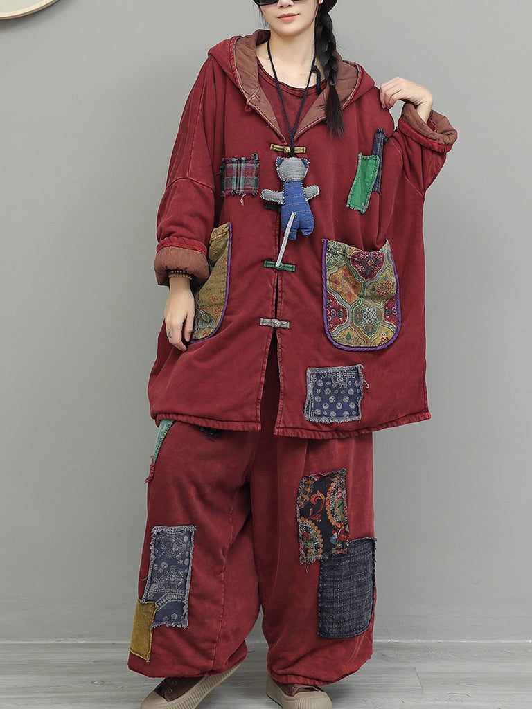 Women Retro Pure Color Cotton Hooded Padded Coat