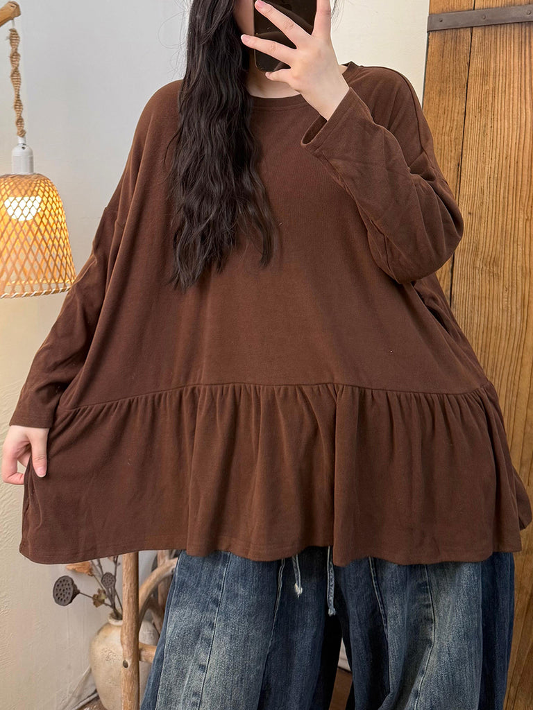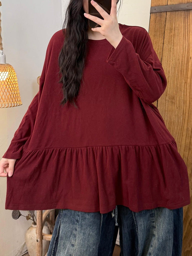 Women Vintage Autumn Pure Color O-Neck Cotton Blouse
