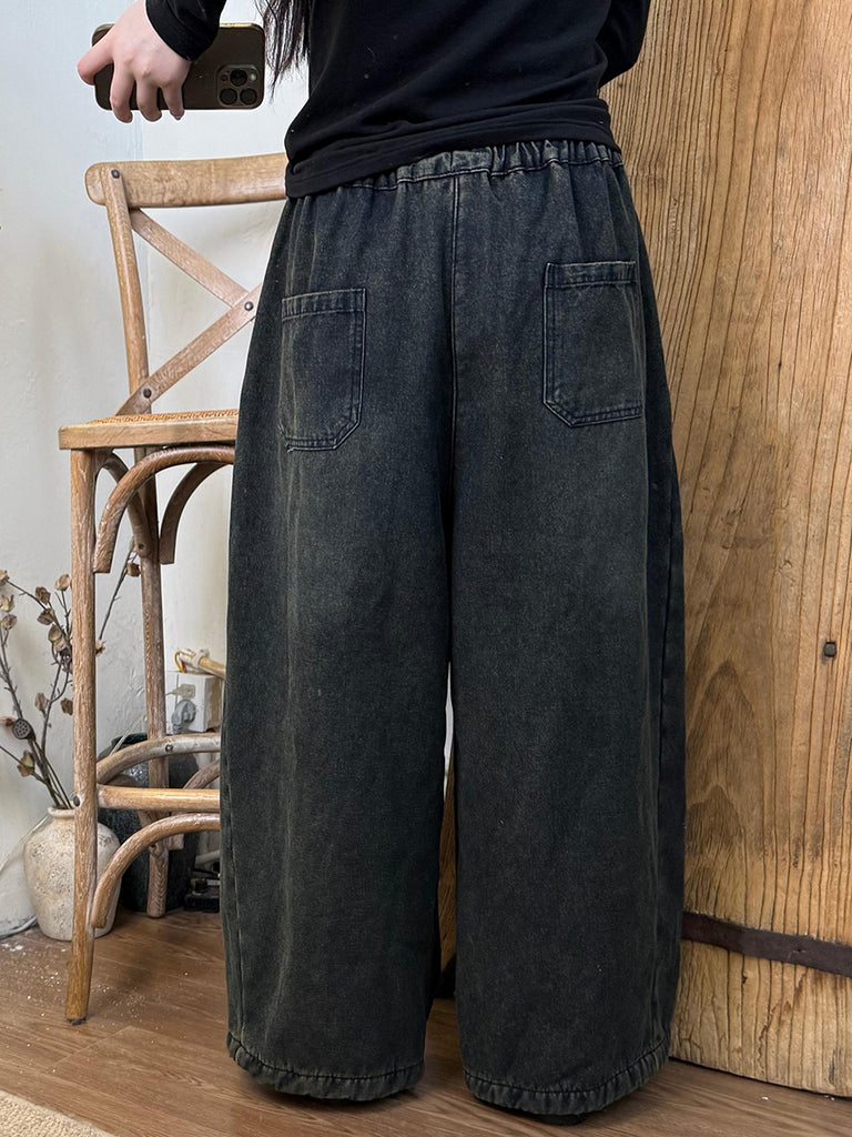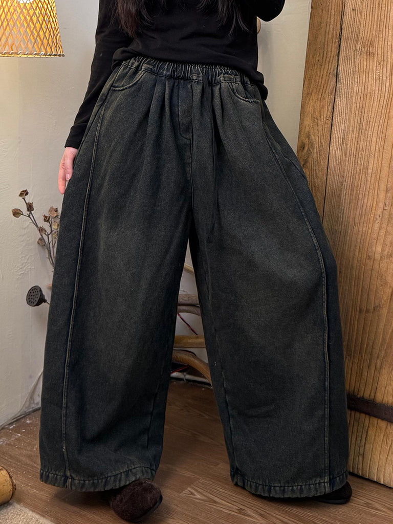 Women Autumn Retro Denim Fleece-lined Wide-leg Pants