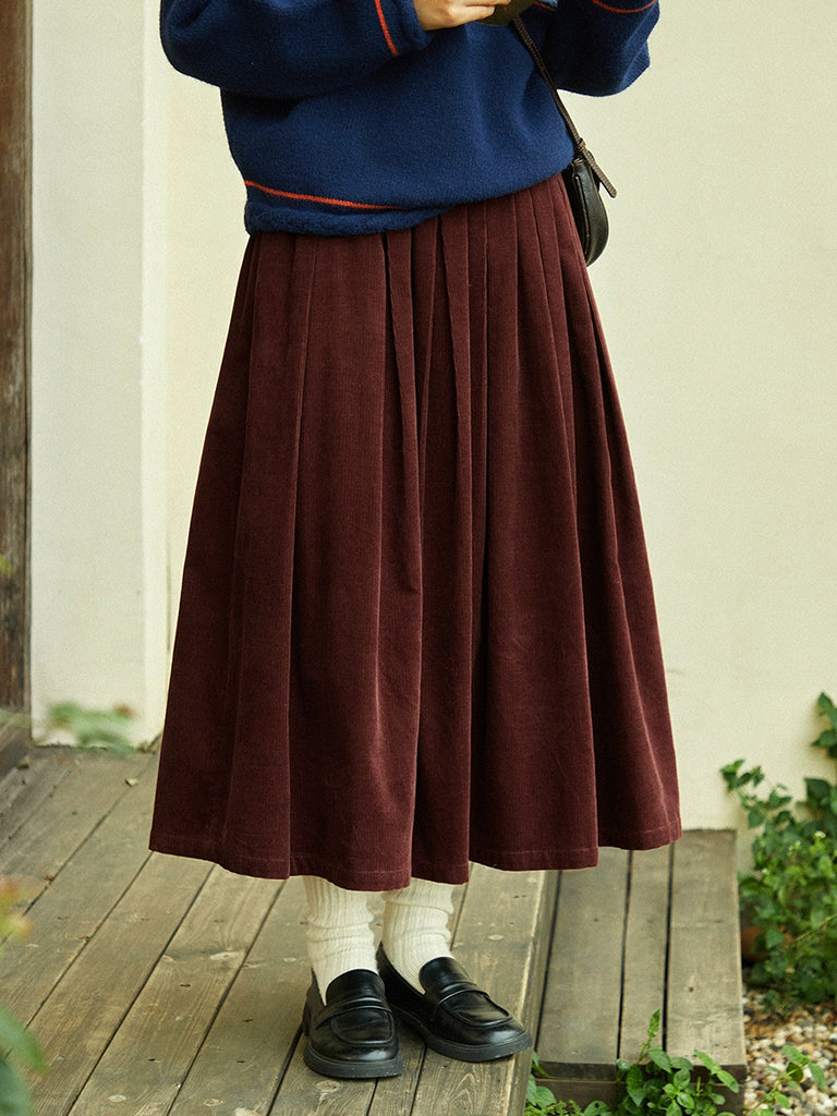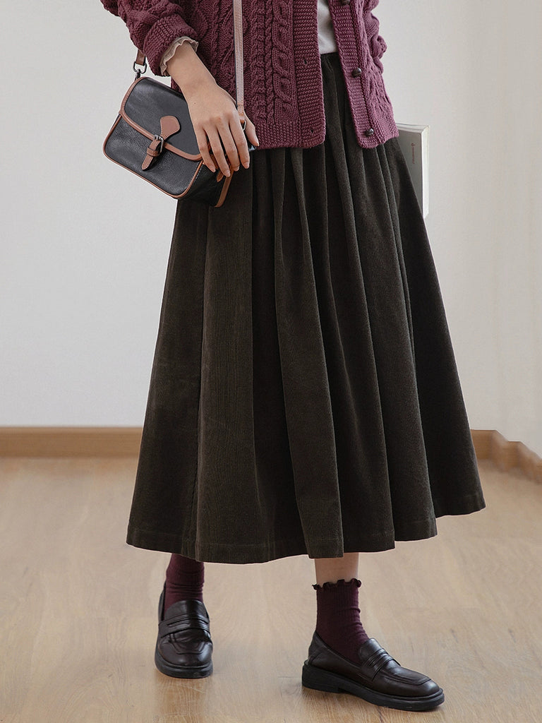 Women Autumn Vintage Pure Color A-Shape Corduroy Skirt